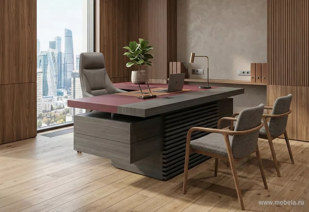 Стол руководителя с рейками (отделка экокожа Бургунди)