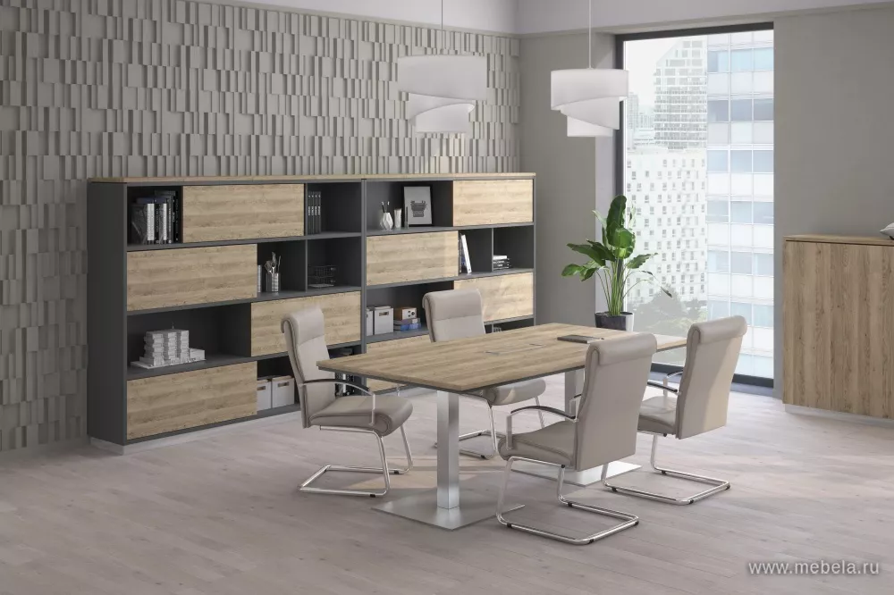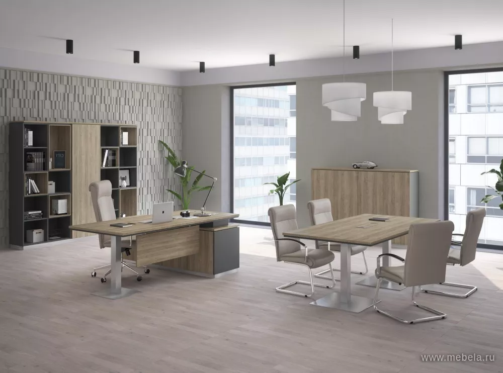 Кабинет руководителя City от российского производителя - это идеальное решение для современного офиса, сочетающее в себе стильный дизайн и функциональность. Изготовленный из ламинированной ДСП с кромкой из ПВХ толщиной 0,4; 1 и 2 мм, этот кабинет предлагает надежность и долговечность.
