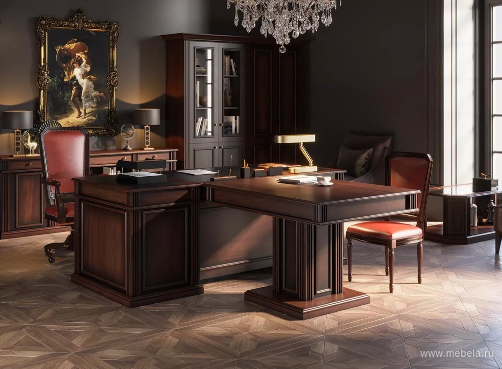 Строгий и торжественный комплект Dante - для ценителей массивной классической мебели. Ярко выраженная симметрия столешниц (толщина 135 мм) с широкими торцами, приставной стол с ножкой-тумбой делает мебель роскошной и респектабельной. Директор, работающий в нем, выглядит состоятельным и уверенным в своей силе.