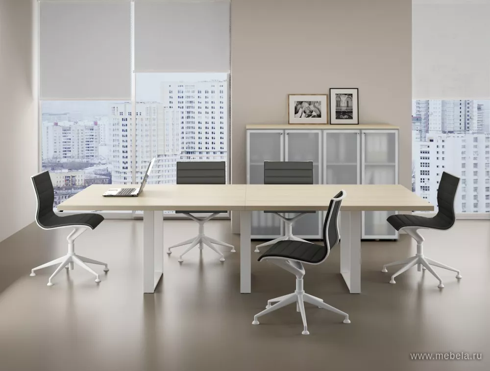 Сдержанный кабинет в стиле минимализма: столы из ножек и столешницы, шкафы и тумбы без декора, открытые стеллажи. Выглядит легко, современно и технологично, поэтому подойдет для небольших помещений – мебель с таким дизайном не загромождает пространство, оставляет много свободного места.