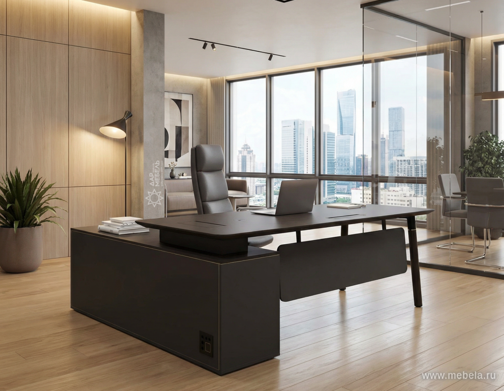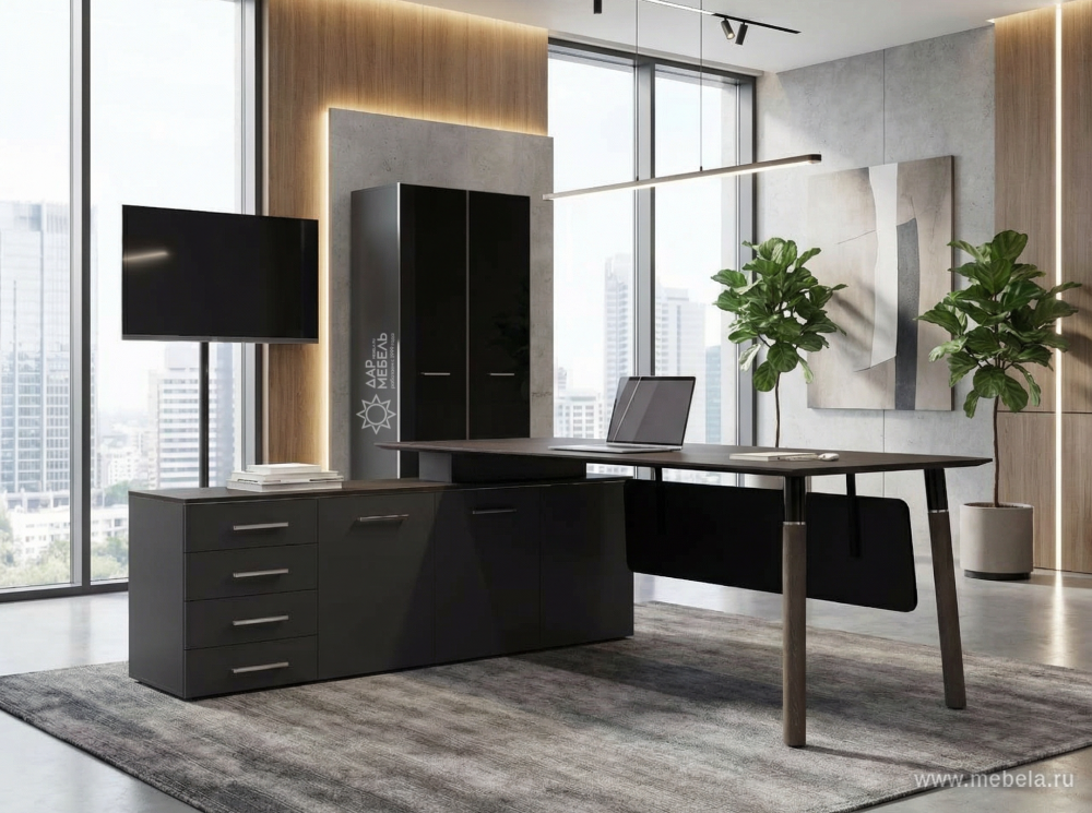 Кабинет руководителя Fresco в цвете дуб тёмный - это элегантное и функциональное рабочее пространство, произведенное в России с использованием высококачественных материалов. Столешницы из массива цельноламельного дуба толщиной 25мм придают кабинету прочность и изысканный внешний вид.
