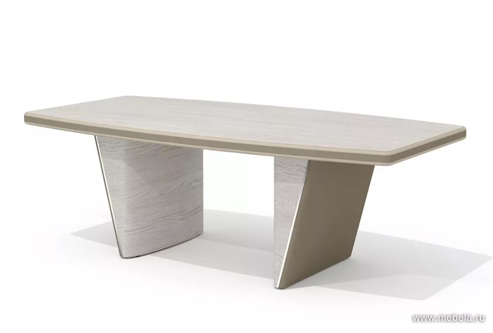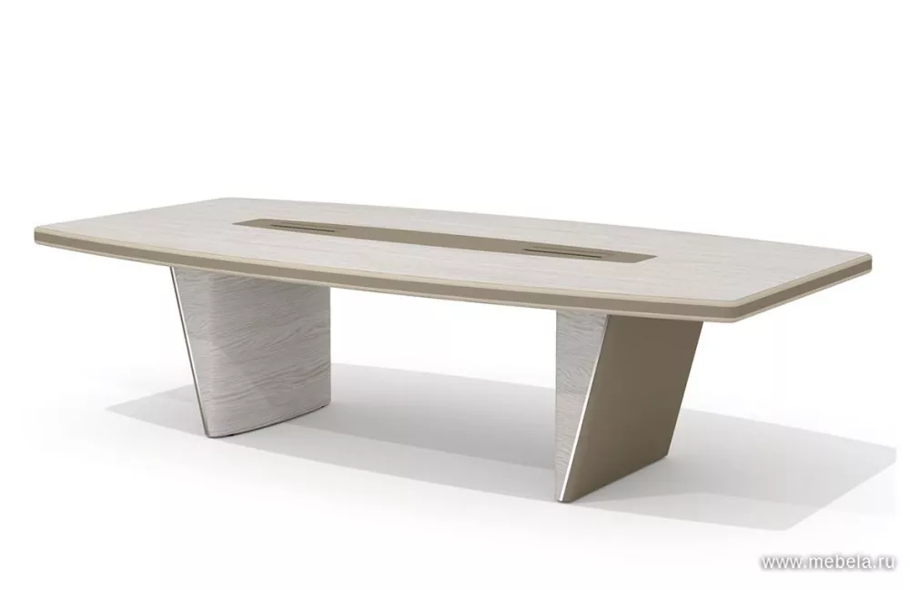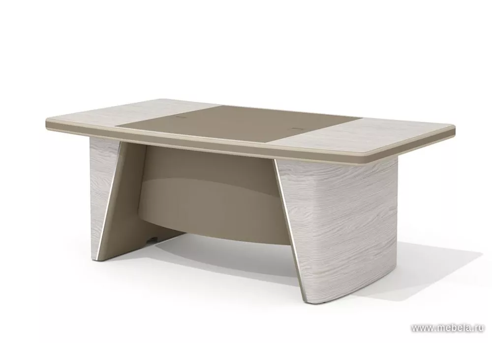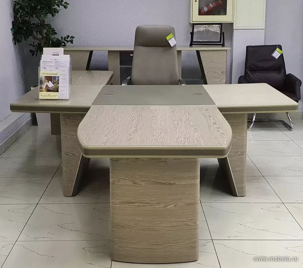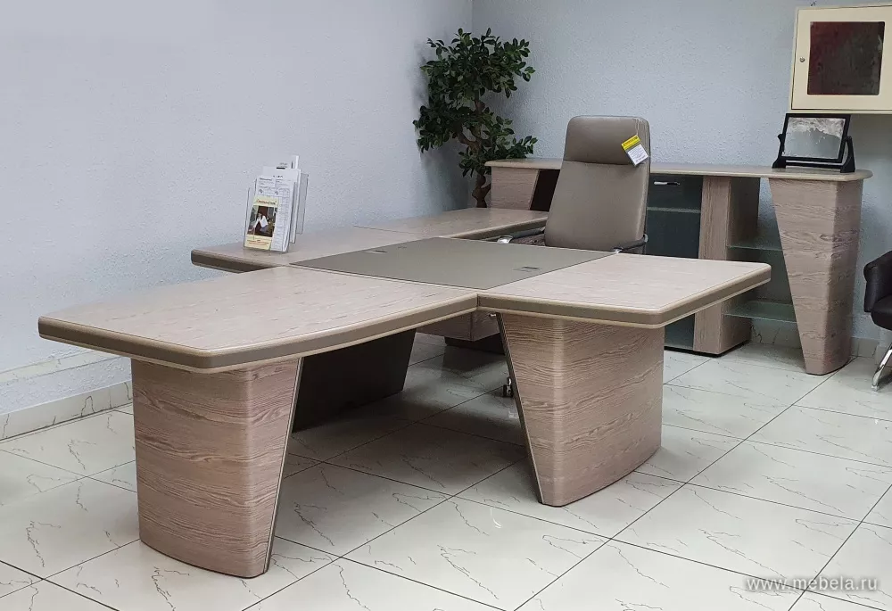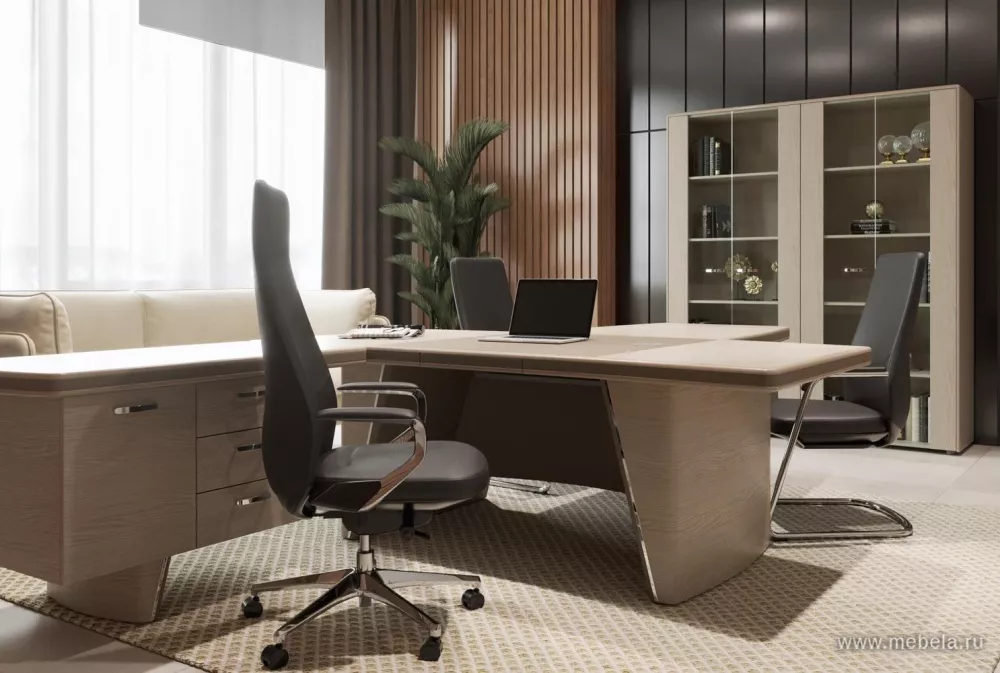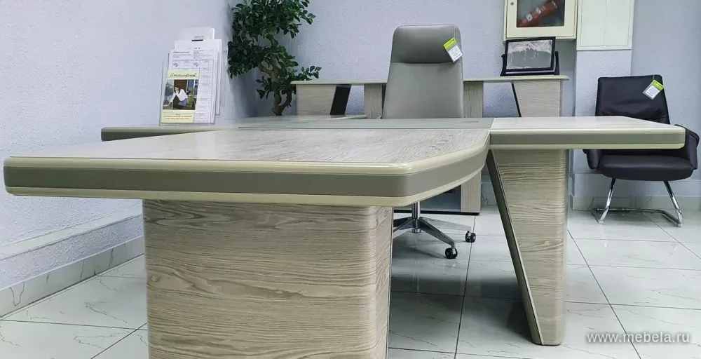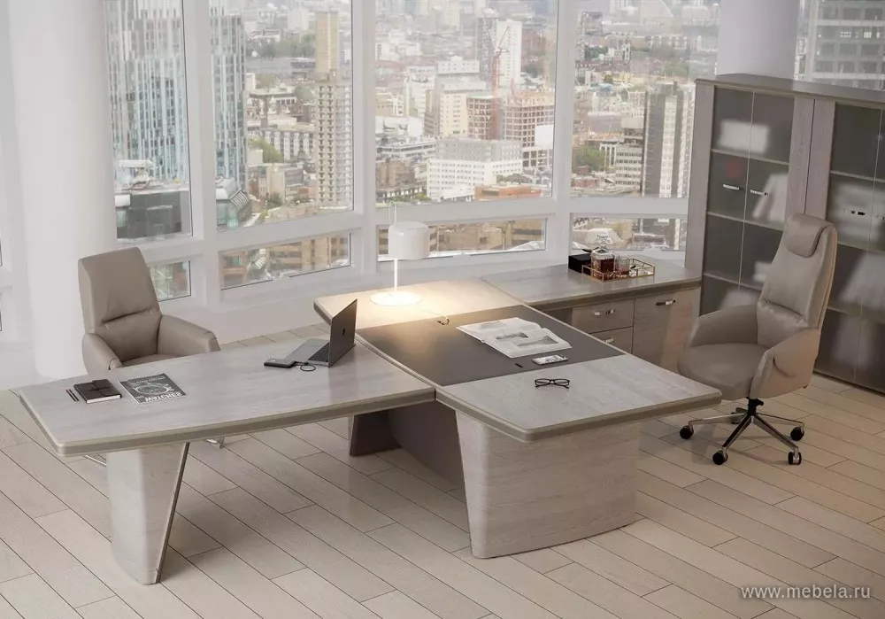 Новая роскошная мебель в минималистическом и утонченном современном стиле для солидных руководителей. Лаконичные сдержанные формы, натуральные оттенки светлых и темных полос дуба ондо, выделенные кромки и элегантные вставки из экокожи на столешнице и брифингах по торцу создают позитивную атмосферу для работы.