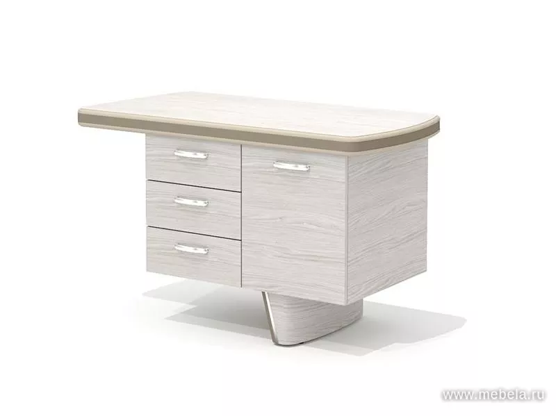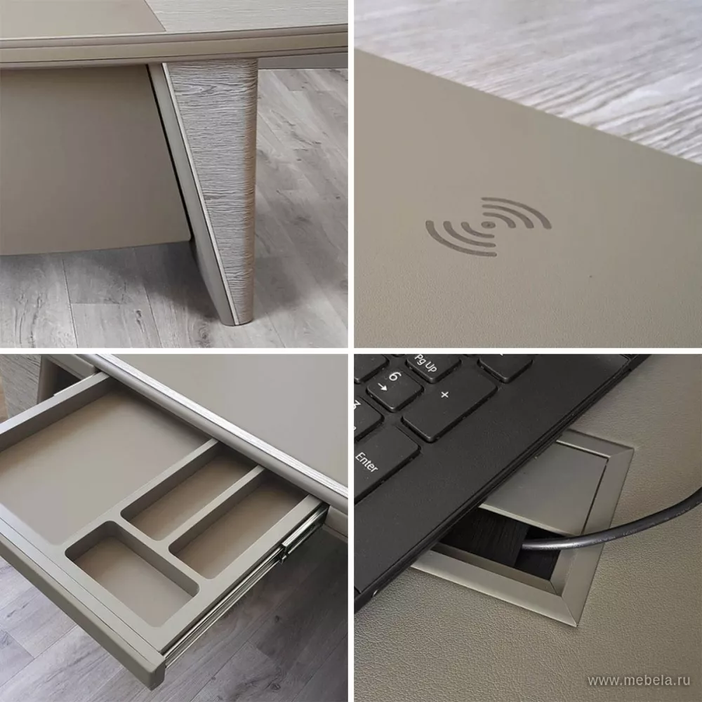 Опоры выполнены в виде объемных коробов треугольной формы с наклонной съемной панелью, обтянутой экокожей. Грани между боковой и лицевой поверхностями коробов скруглены. Усиленный функционал стола: встроена беспроводная зарядная станция для мобильных устройств с поддержкой стандарта Qi Wireless...
