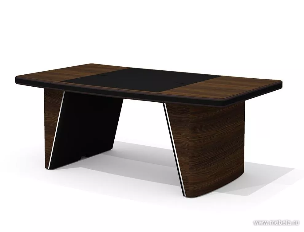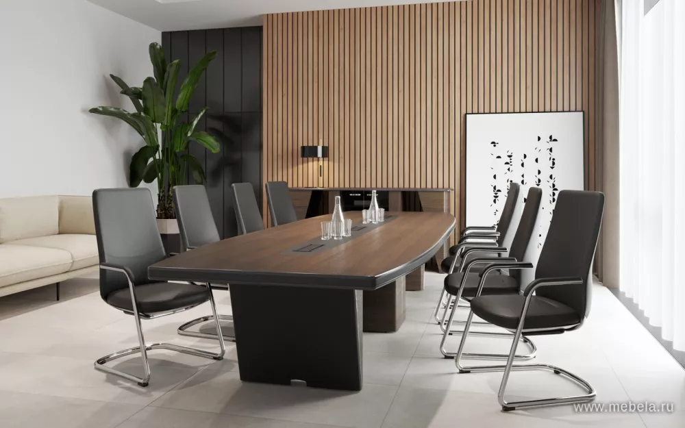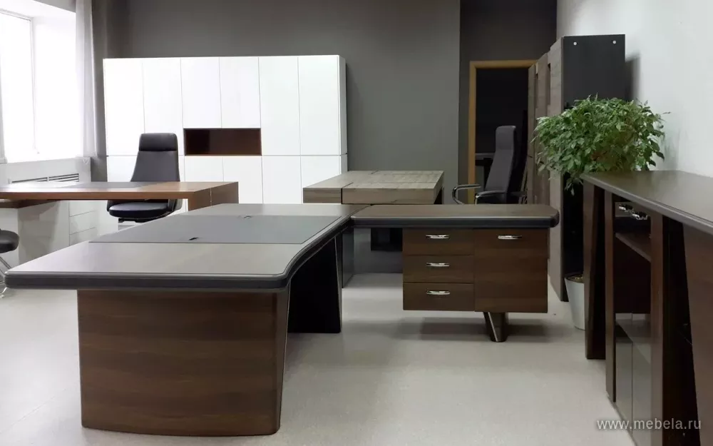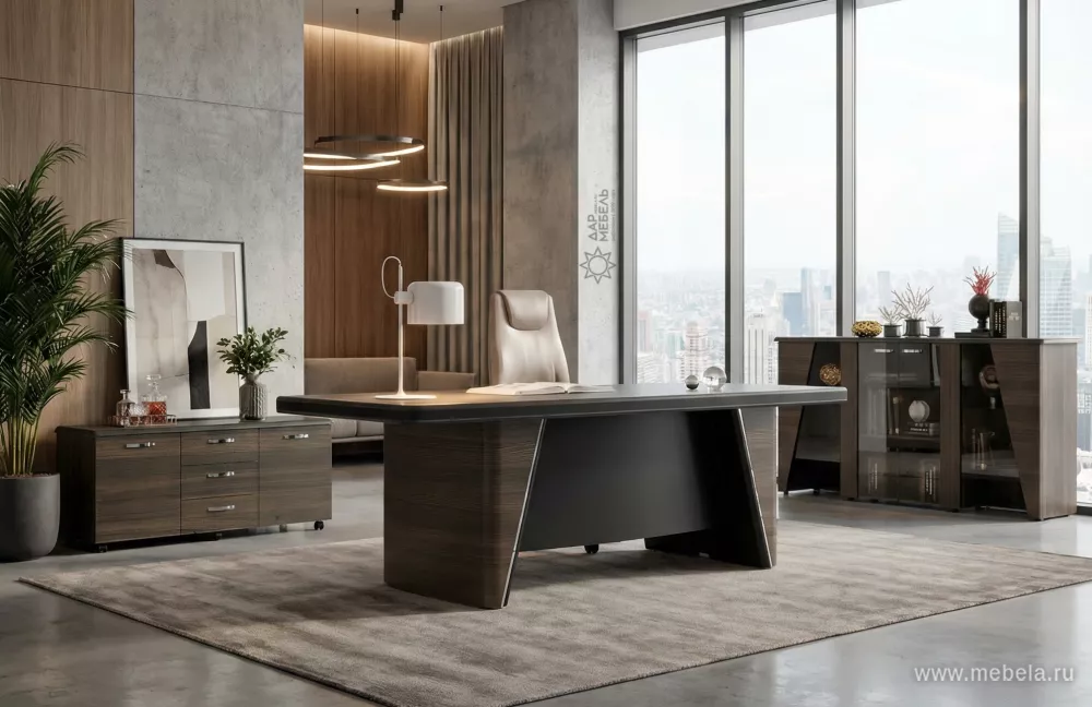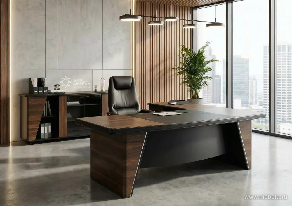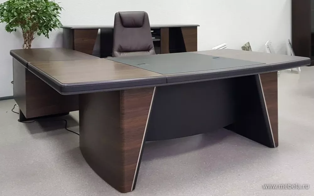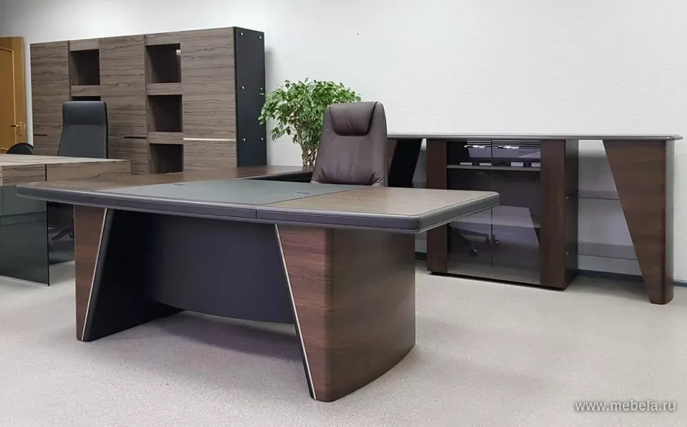 Новая роскошная мебель в минималистическом и утонченном современном стиле для солидных руководителей. Лаконичные сдержанные формы, натуральные оттенки светлых и темных полос дуба ондо, выделенные кромки и элегантные вставки из экокожи на столешнице и брифингах по торцу создают позитивную атмосферу для работы.