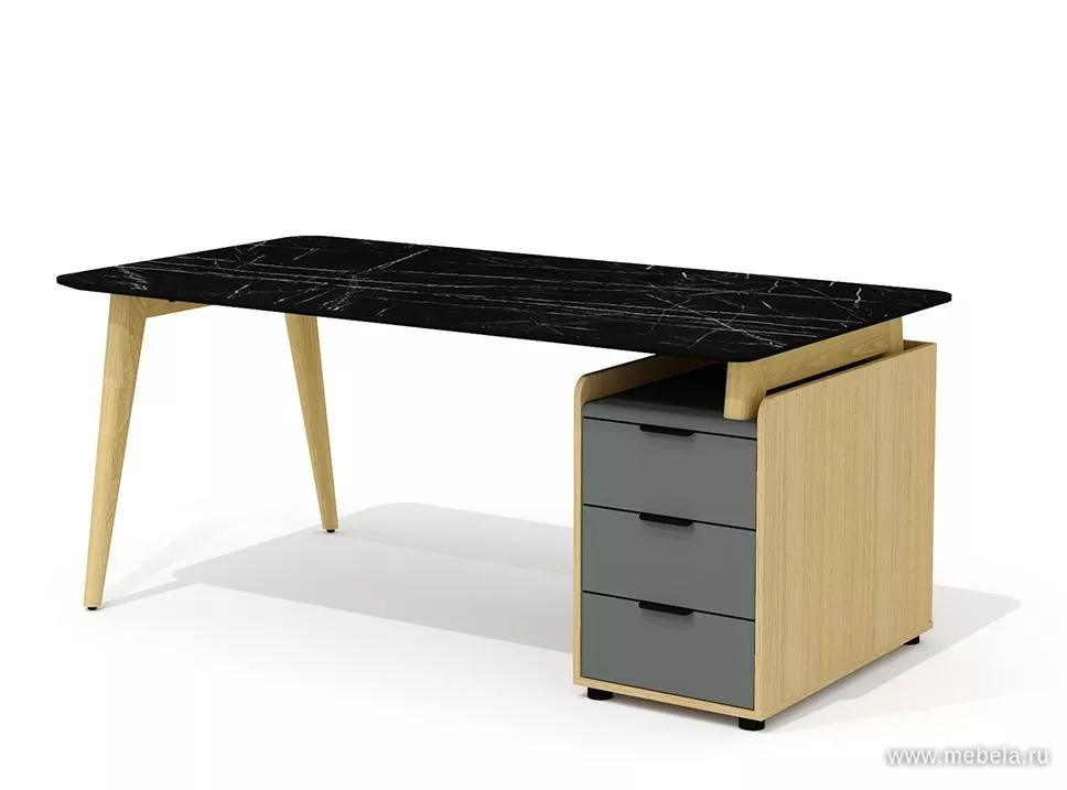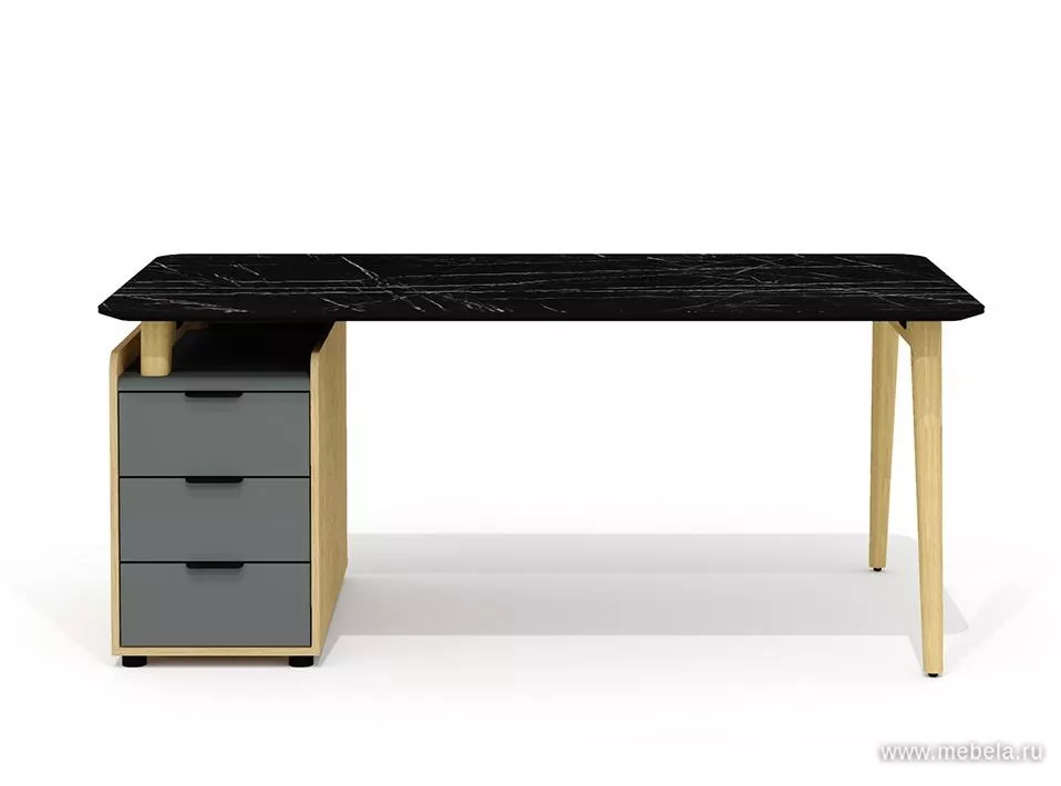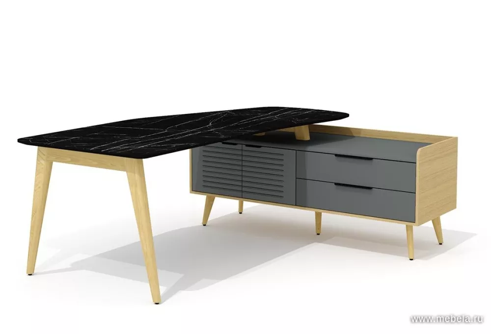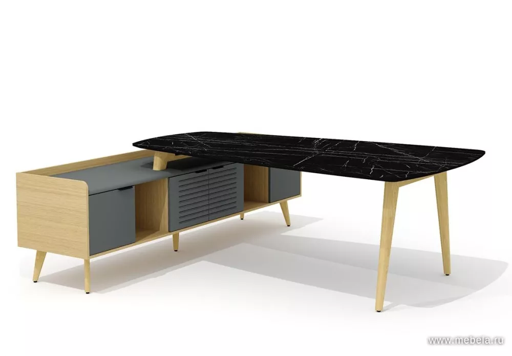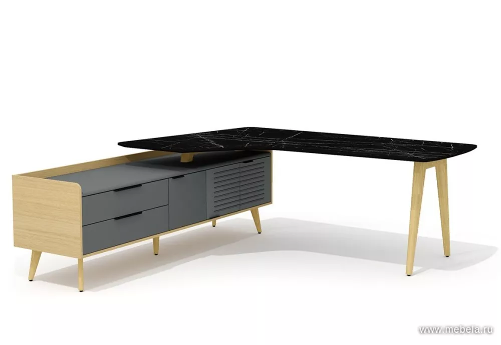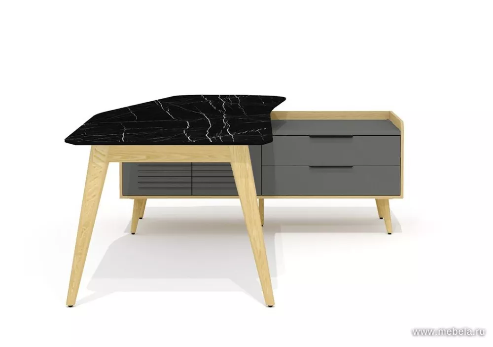 Трапециевидная столешника выглядит роскошно: стилизация под черный мрамор с хаотичным узором прожилок - самый модный тренд. Закрытые шкафы декорированы вставками из ясеня, вносят строгий деловой вид. Экологичный и стильный кабинет Remo - это мебель нового поколения, обеспечивающая комф...