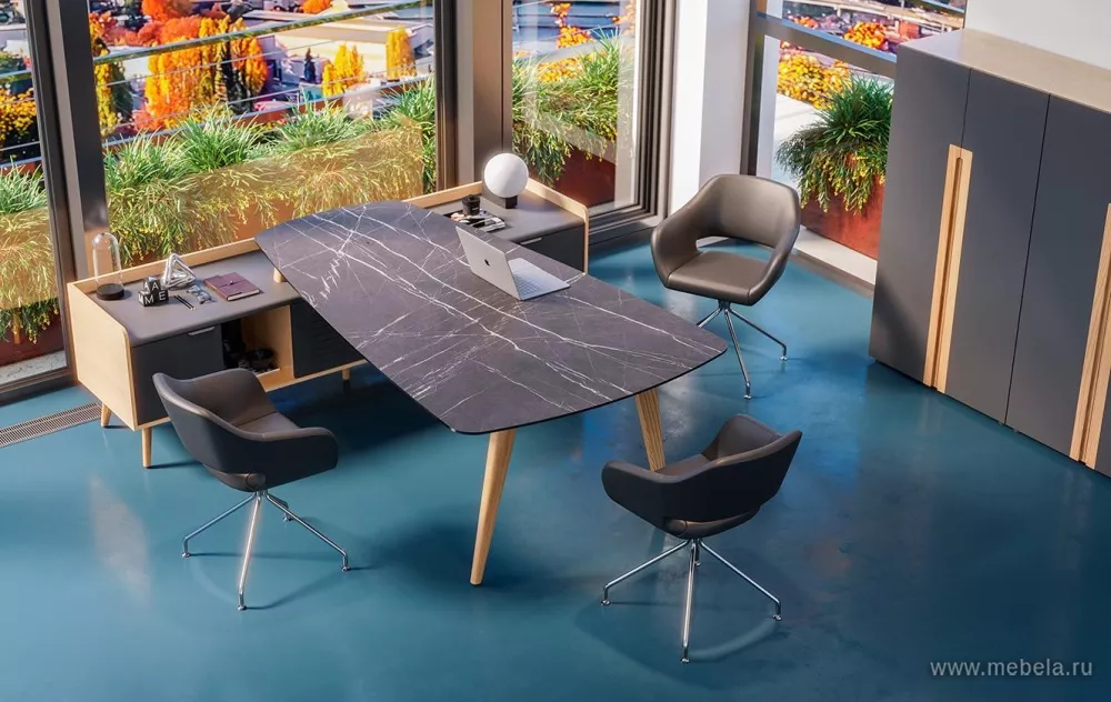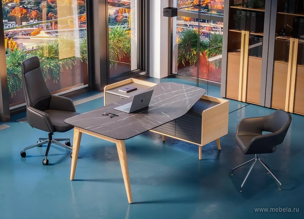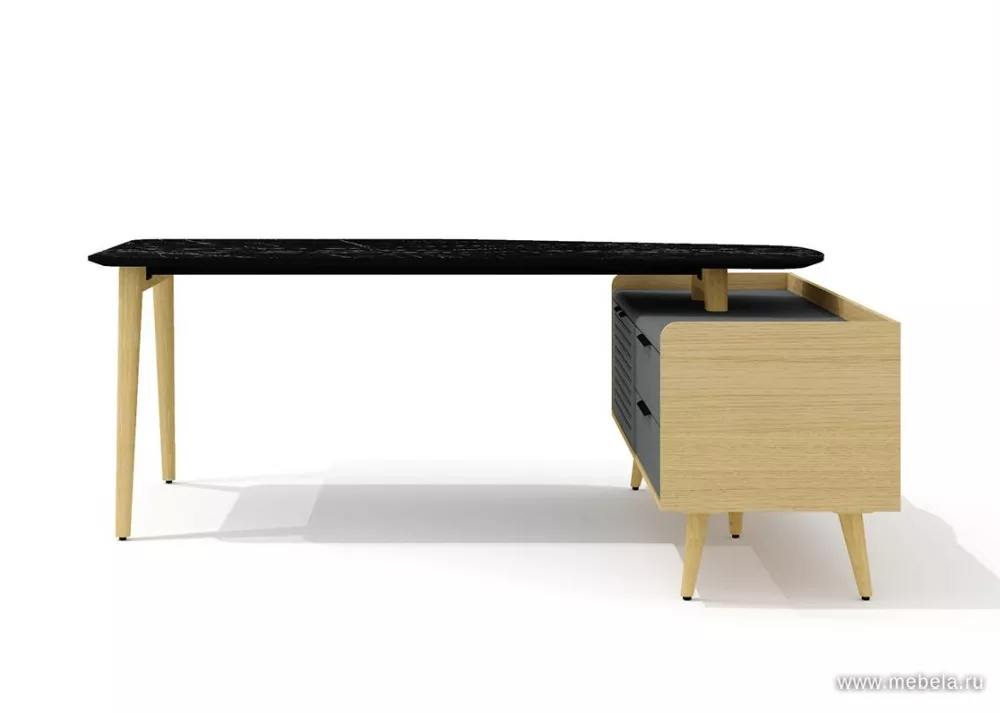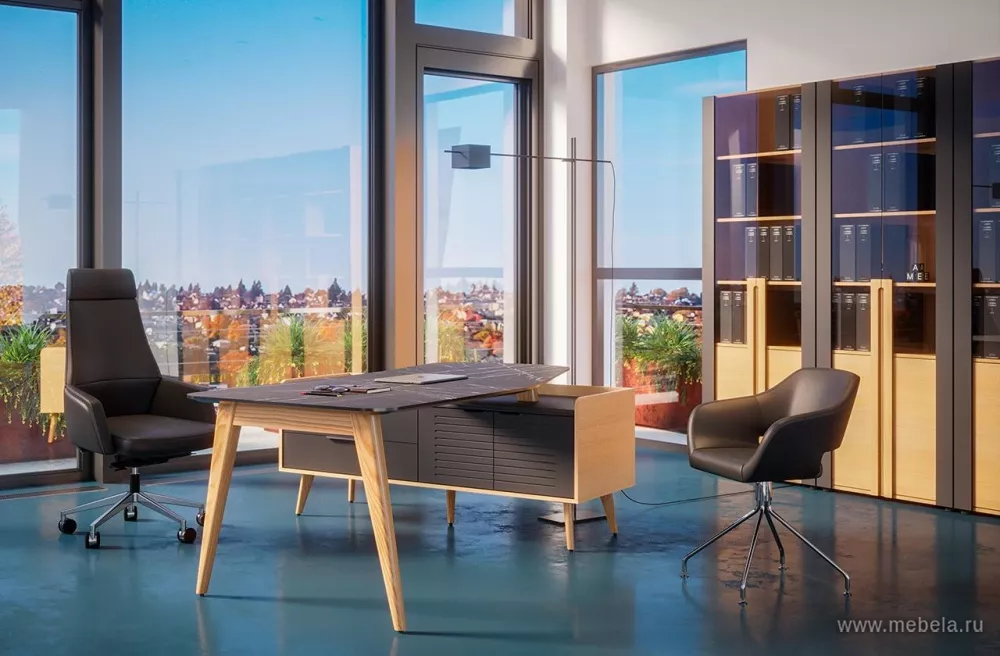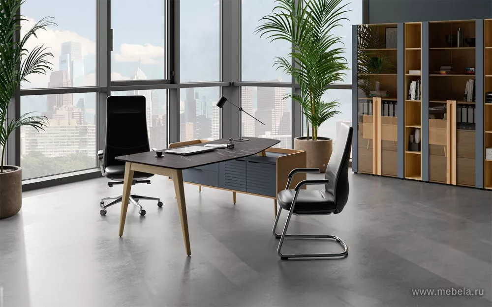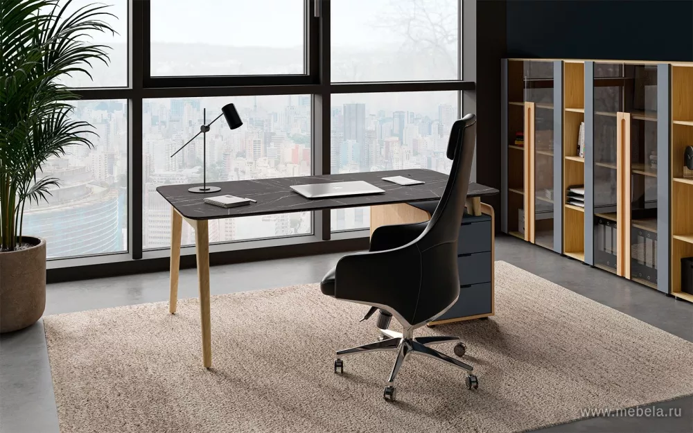 Кабинет руководителя Remo создан на гармоничном сочетании классической тенденции прямоугольных форм и современных решений дизайна в скандинавском стиле. Легкий стол руководителя с изящными деревянными опорами из ясеня, соединённый с массивной рабочей тумбой, вносит яркую необычность и эффектный внешний вид.