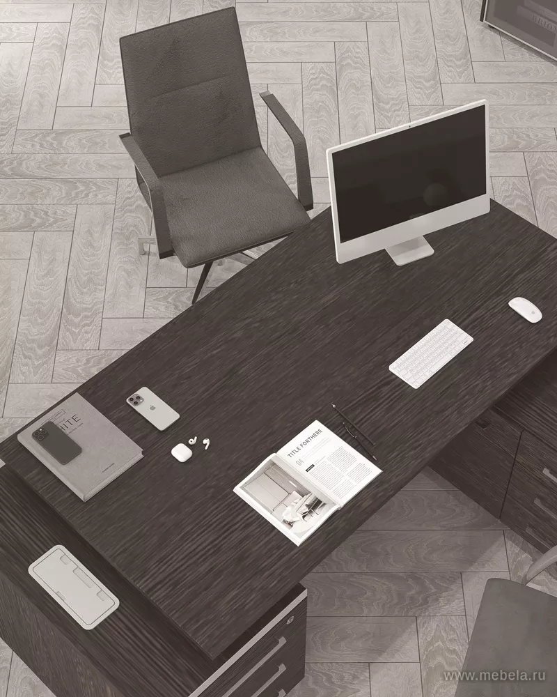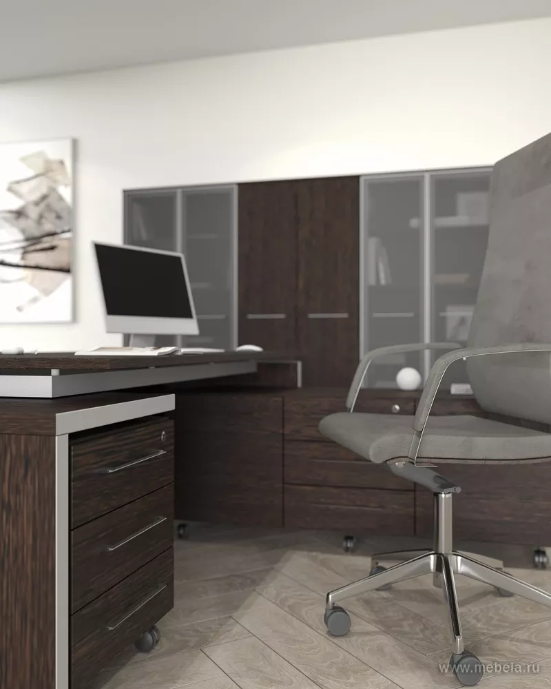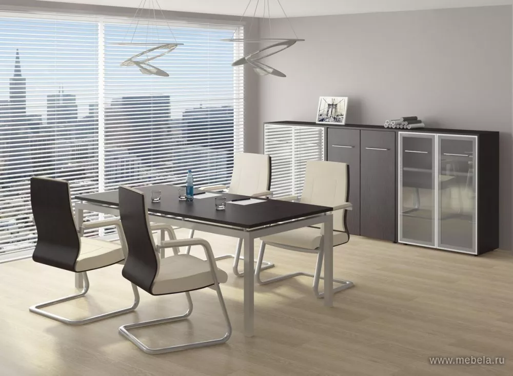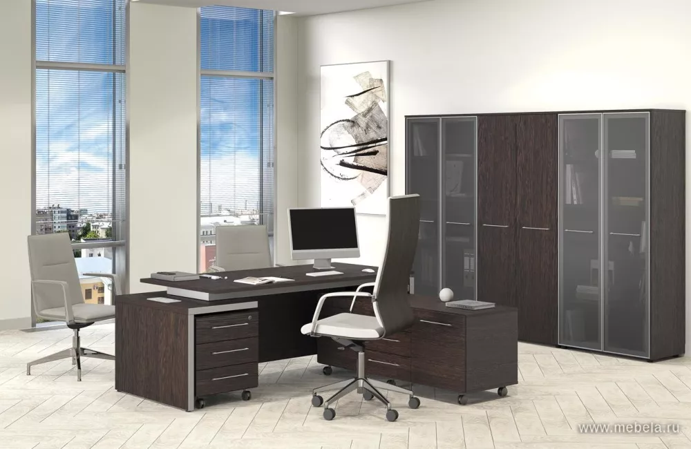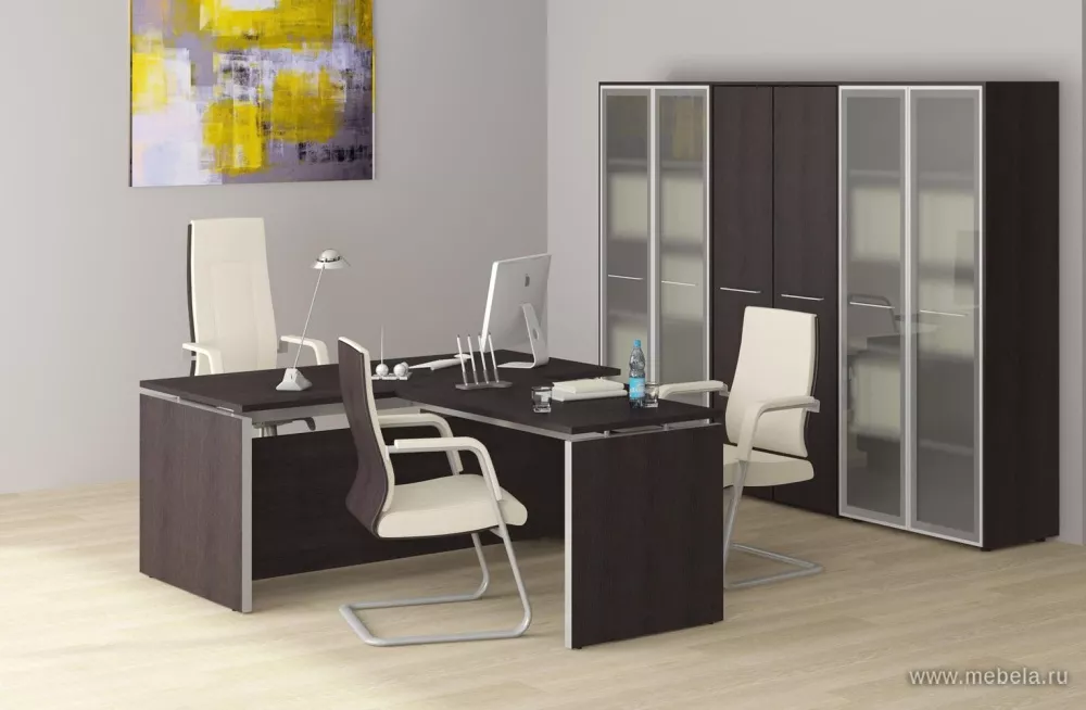 Комплект для кабинета “Ревентон” в цвете венге тёмный предлагает собственные дизайнерские решения по созданию уникального современного стиля. Многоярусность столов и приставок естественно делит рабочее пространство на зоны и создает неповторимый интерьер. Его усиливают алюминиевые полосы в обработке торцов.