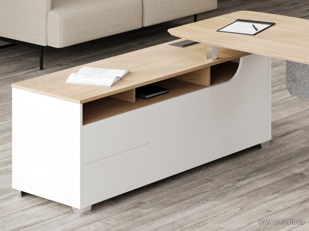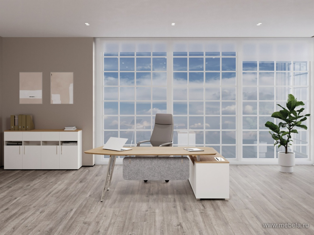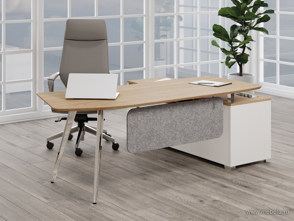 Мебель для кабинета руководителя Oris — это идеальное сочетание стиля, качества и функциональности, произведенная в России. Столешница выполнена из массива светлого дуба толщиной 25 мм, что придаёт ей прочность и элегантность. Опоры стола изготовлены из листового металла толщиной 2 мм и нержавеющей стали, что обеспечивает устойчивость и долговечность конструкции.