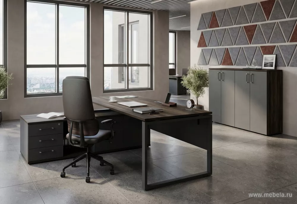 Кабинет руководителя Шифт в цвете Дуб Мали максимально отвечает стилю и последним тенденциям в сфере современного дизайна, требованиям практичности и эргономики. В предметах мебели идеально сочетаются декорирование материалов ЛСДП под натуральную структуру дерева и легкость металлических элементов.