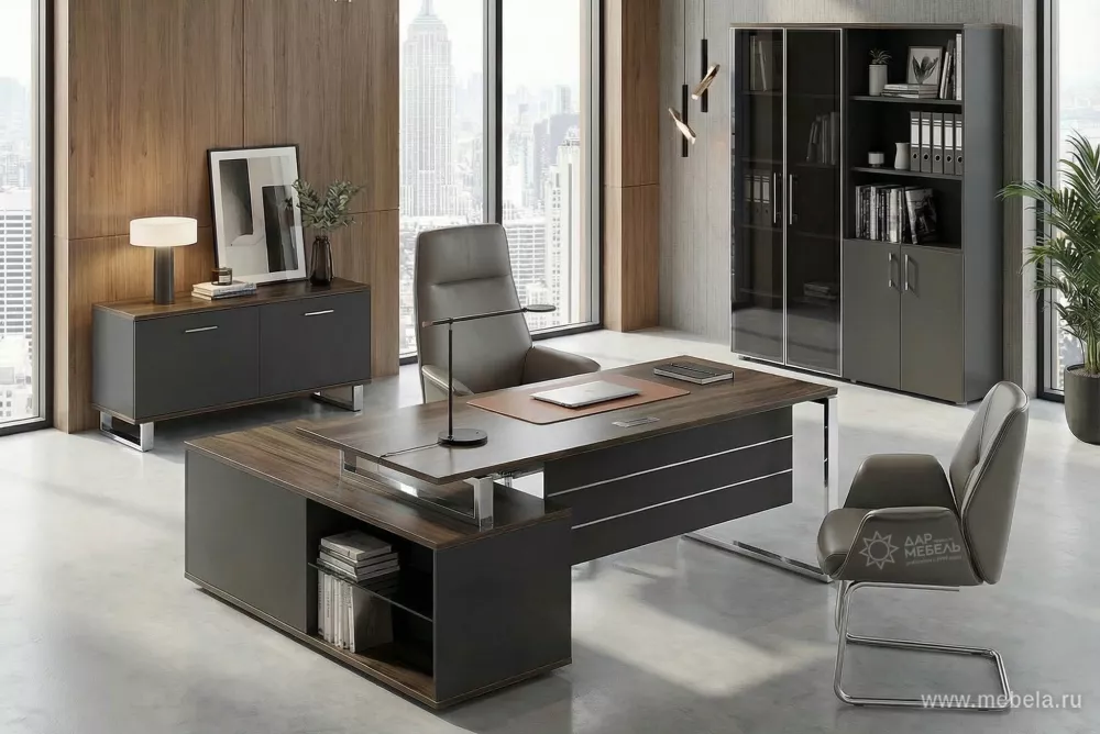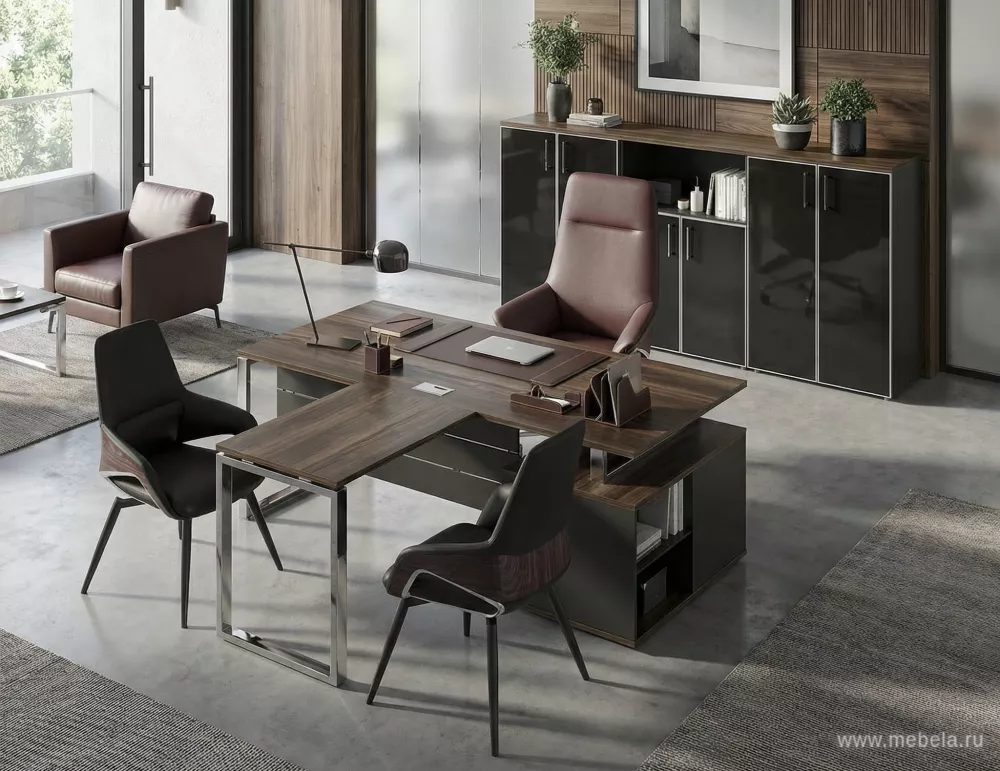 Кабинет руководителя Shift в цвете Дуб Мали максимально отвечает стилю и последним тенденциям в сфере современного дизайна, требованиям практичности и эргономики. В предметах мебели идеально сочетаются декорирование материалов ЛСДП под натуральную структуру дерева и легкость металлических элементов.