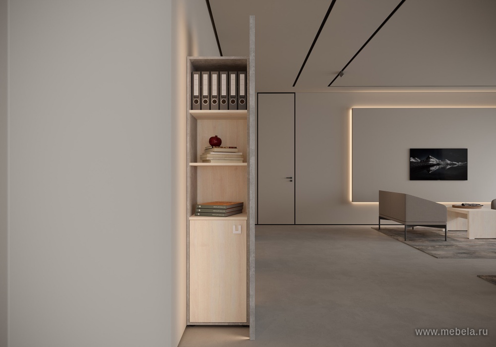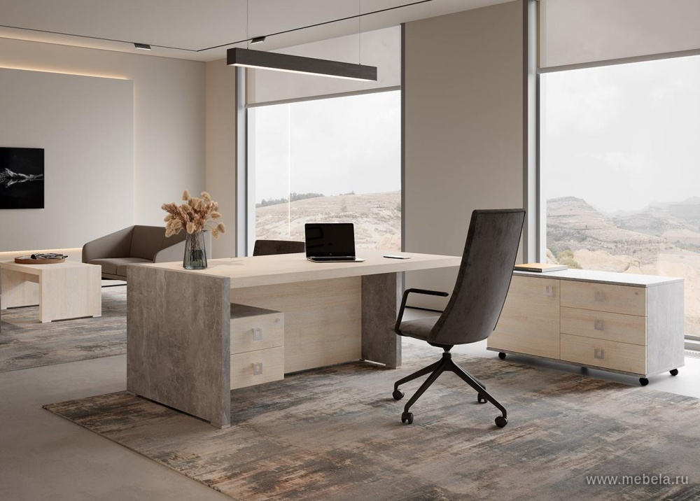 Кабинет для руководителя Solid B Light — стильное и функциональное решение для вашего офиса. Изготовленный из ЛДСП в цветах «дуб шамони светлый» и «светлый бетон», он оснащен прочными столешницами 54 мм, регулируемыми опорами и матовыми стеклянными фасадами с доводчиками.