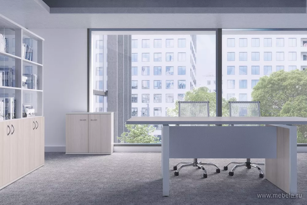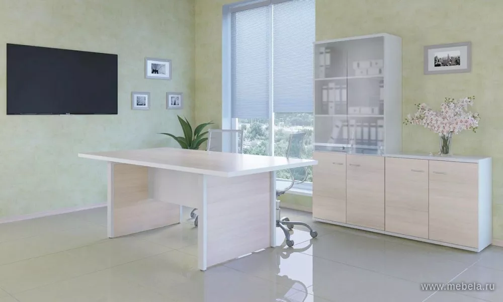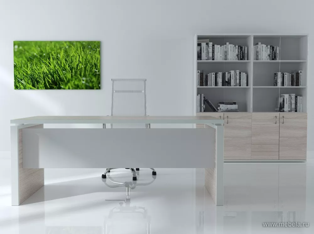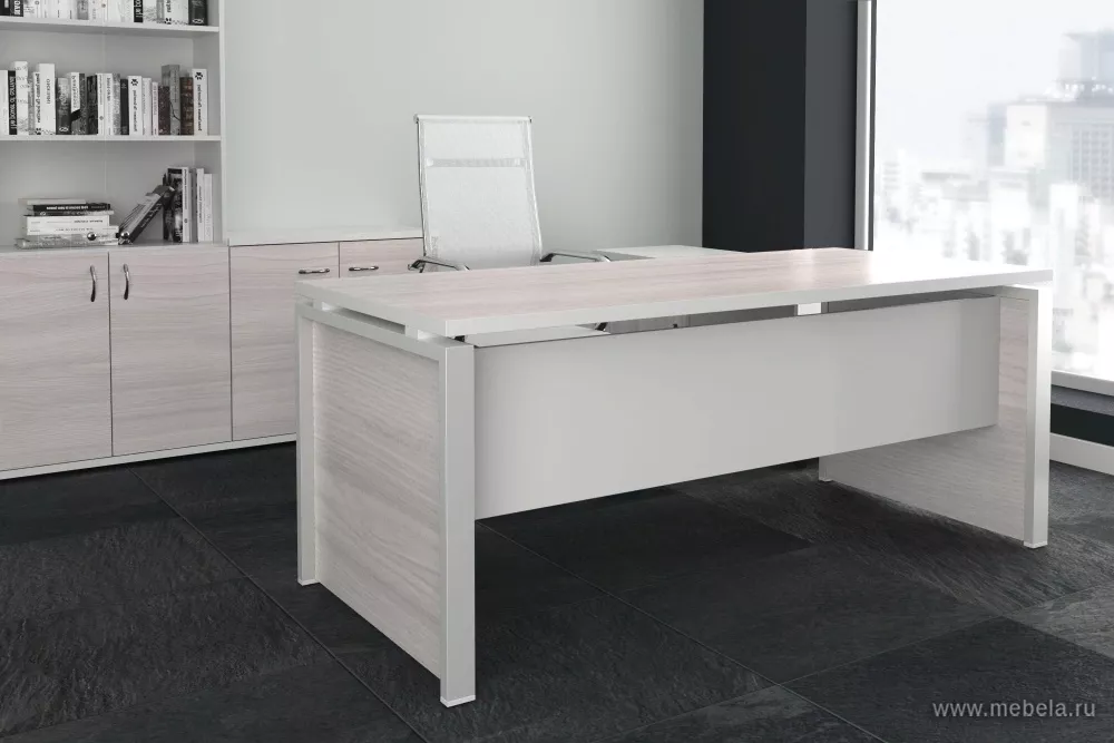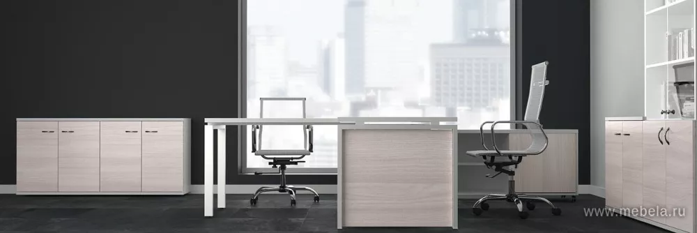 Оригинальный кабинет руководителя в стиле минимализма. Доступен в трех расцветках: белый, темный и светлый дуб. Современная, функциональная мебель из этого набора станет отличным вариантом для владельца молодой компании или начальника отдела.
