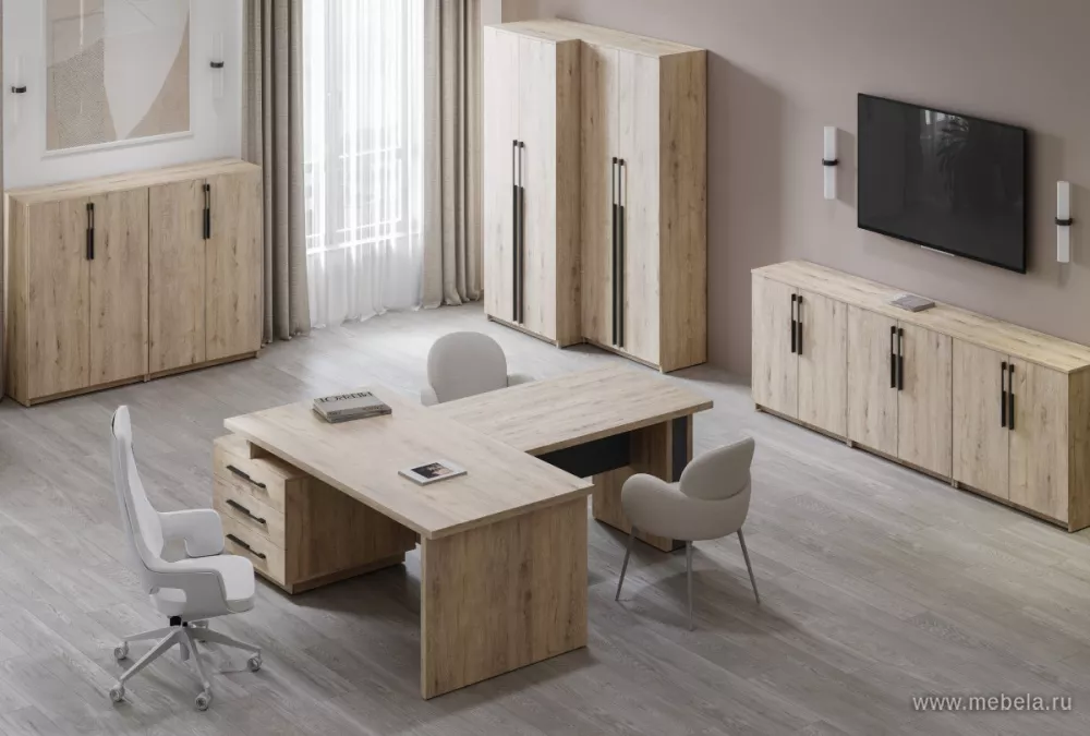 Кабинет руководителя «Тоскана» — это сочетание статуса, надежности и современного дизайна. Мебель выполнена в благородном цвете Дуб бонифаций, который подчеркивает деловой стиль интерьера. Столешницы и боковины столов толщиной 38 мм обеспечивают прочность и солидный внешний вид, а усил...