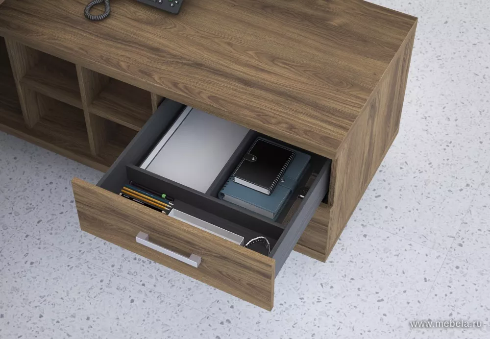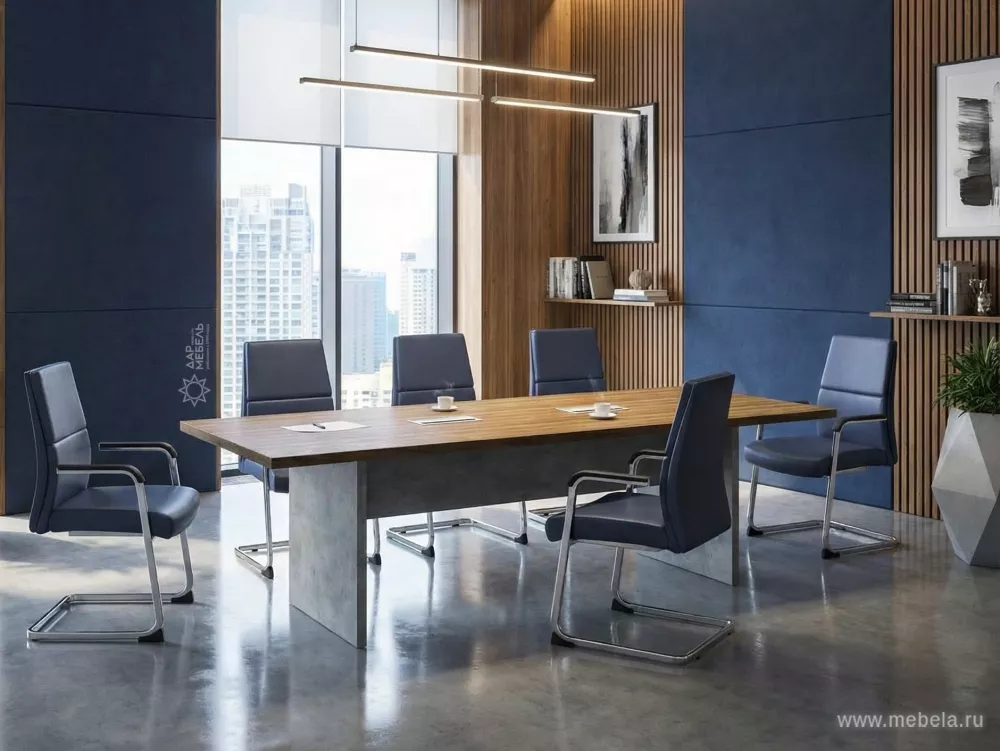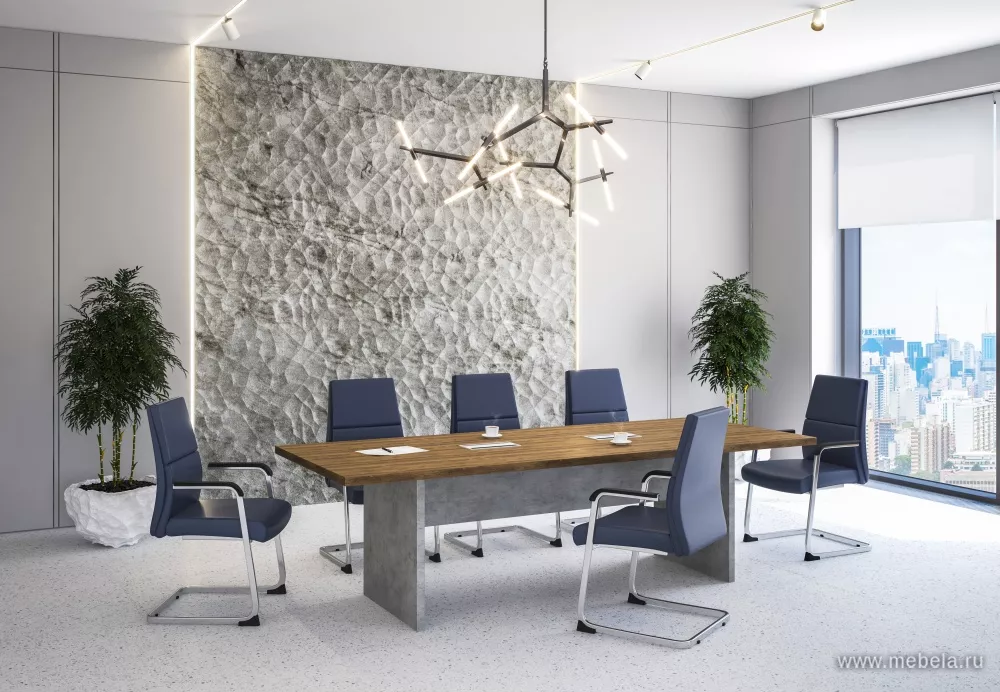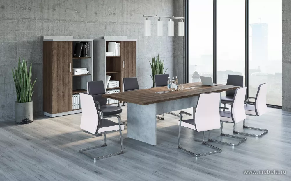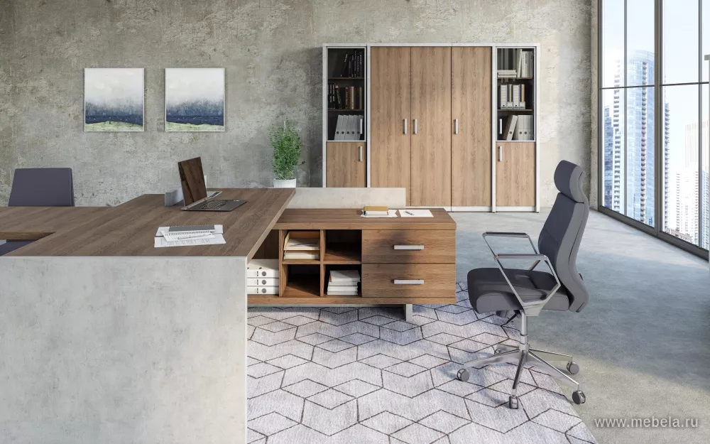 Кабинет руководителя Wood&Stone выполненный в индустриальном стиле лофт и комбинированном цветовом исполнении теплого дерева и строгой холодности бетона, выглядит солидно, современно и органично. Лаконичный дизайн кабинета подчеркнут акцентами в виде выступающих перегородок на шкафах, брифинг-тумбах и столах.