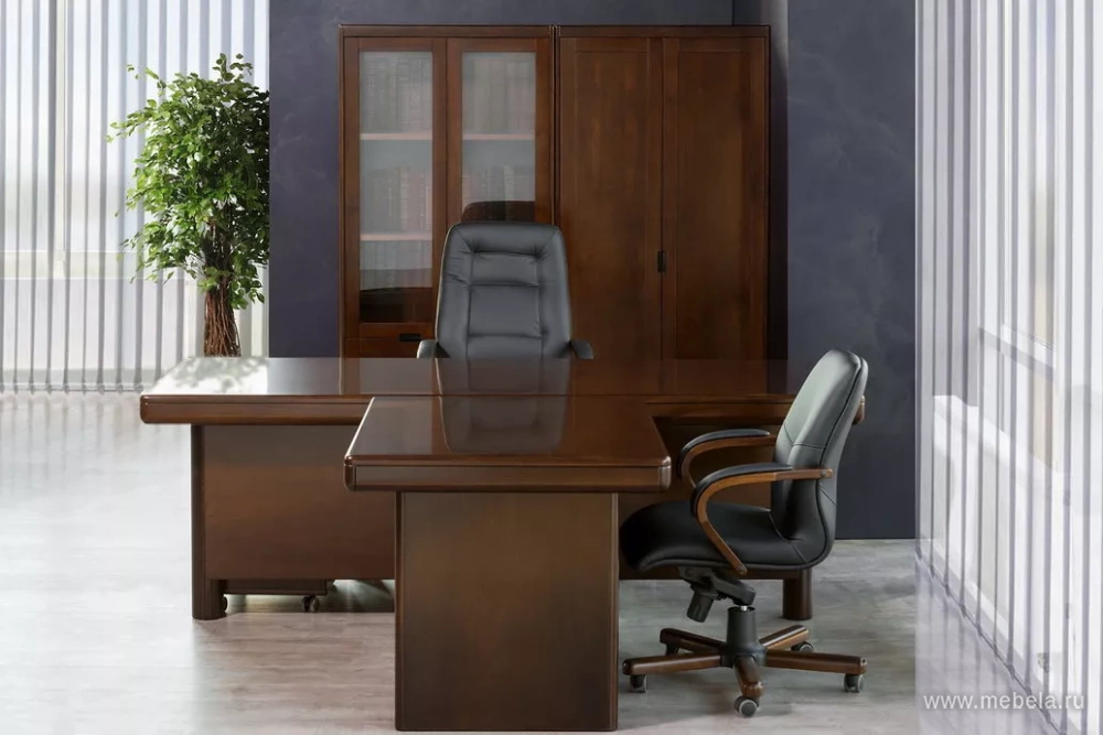 Лаконичная мебель, выполненная в классическом стиле. Все предметы представлены в двух изысканных оттенках: темно-ореховый. Темно-ореховый идеально подойдет для начальника мужчины, а палисандр – для женщины. В минимальной комплектации из письменного стола и шкафа для документов поместится в помещении любого размера.
