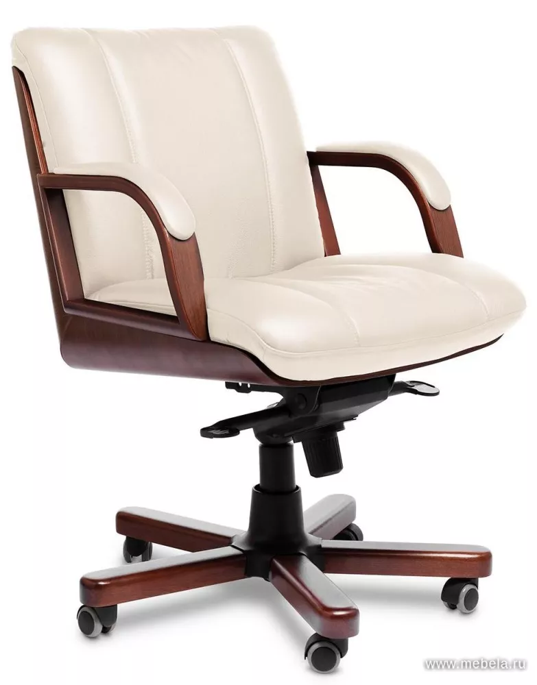 Для изготовления данной модели кресла используется натуральная кожа (цвета в ассортименте), кожзам и дерево (цвет темного ореха). Задняя часть изготавливается из фанеры с пластиковой облицовкой. Крестовина и подлокотники декорируются деревом. Кресло характерно механическими возможностями, а имен...