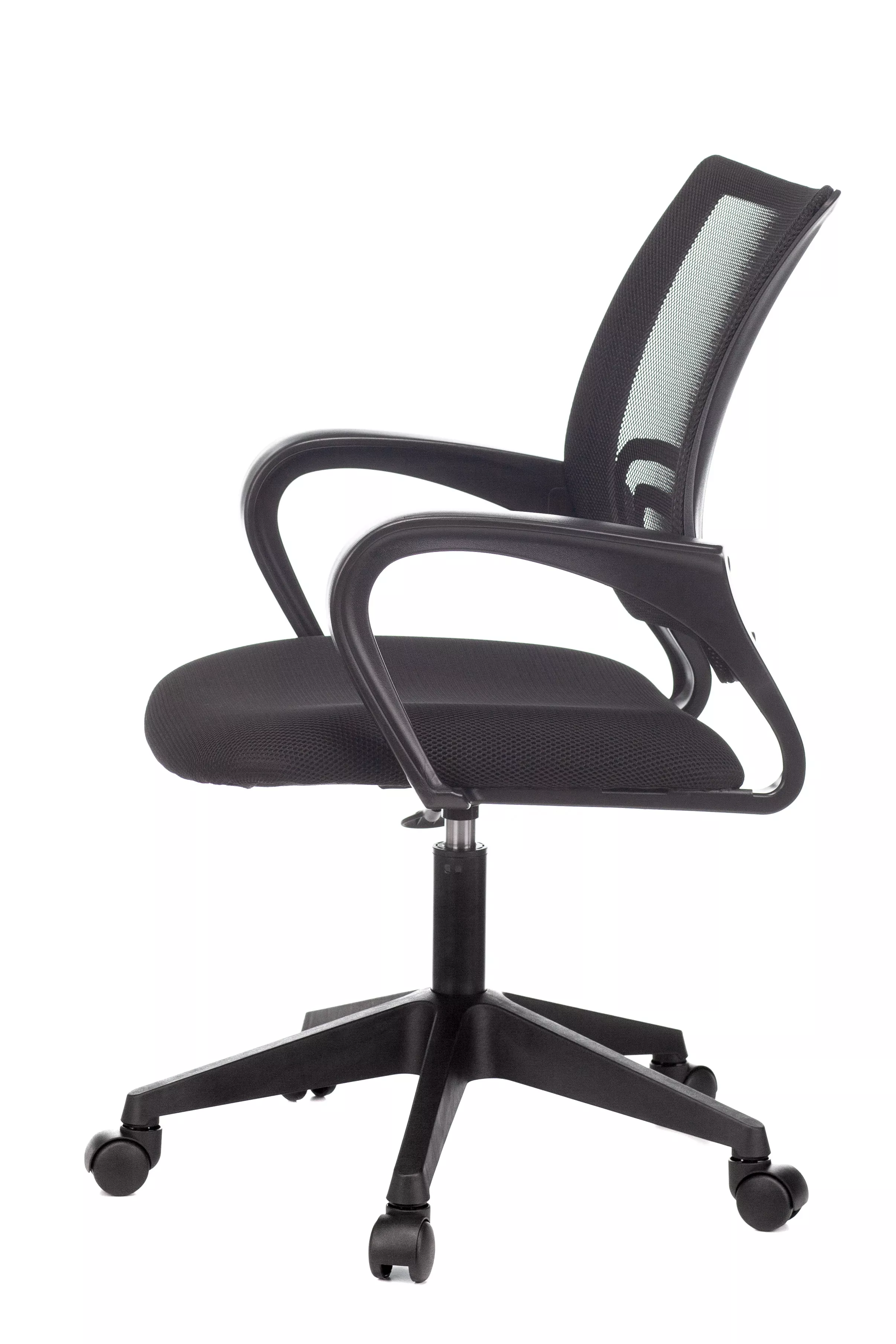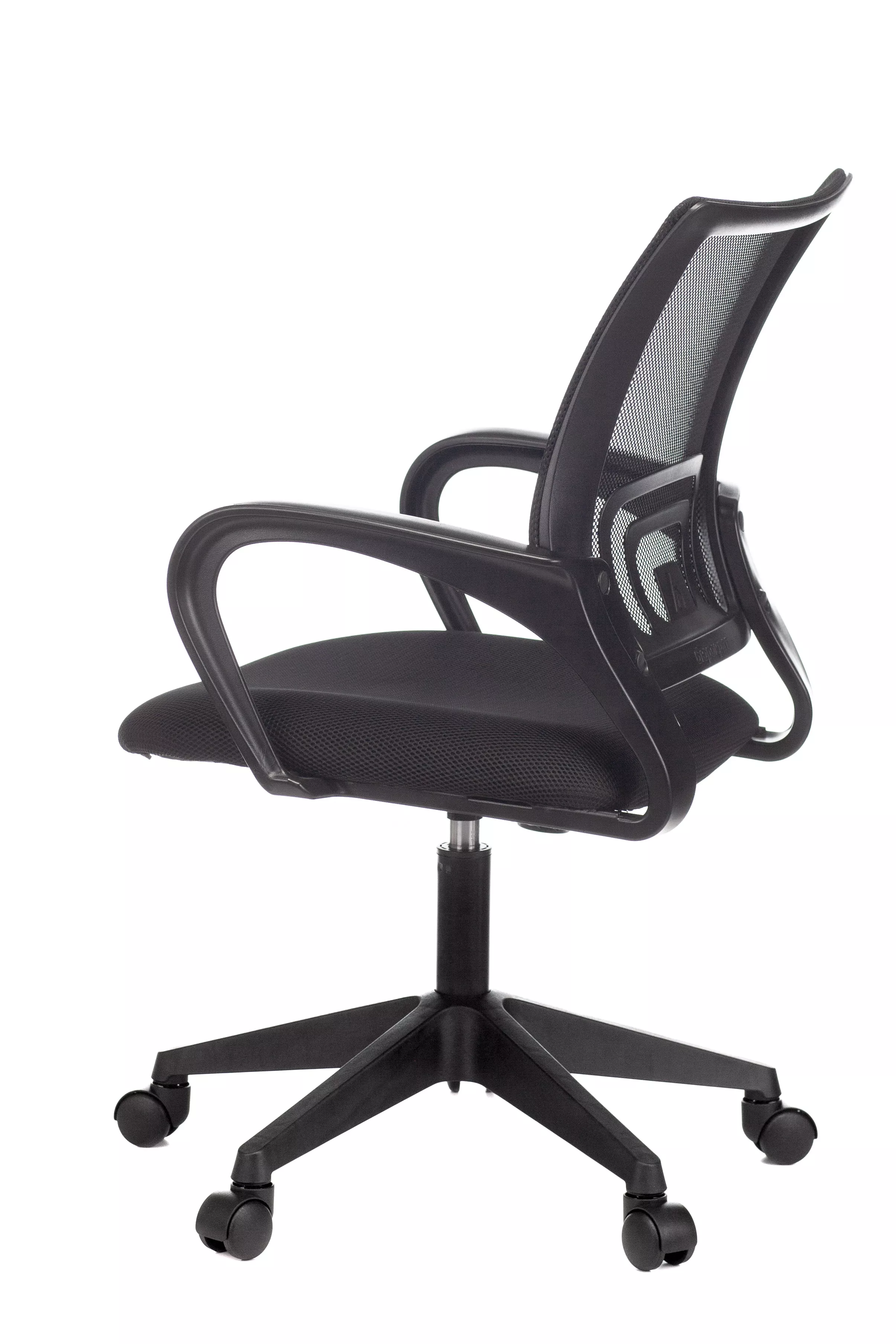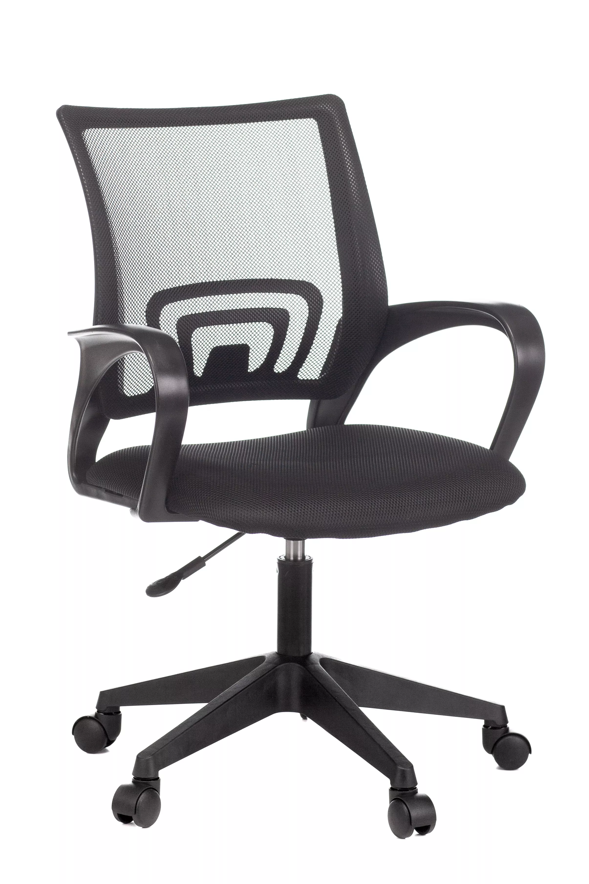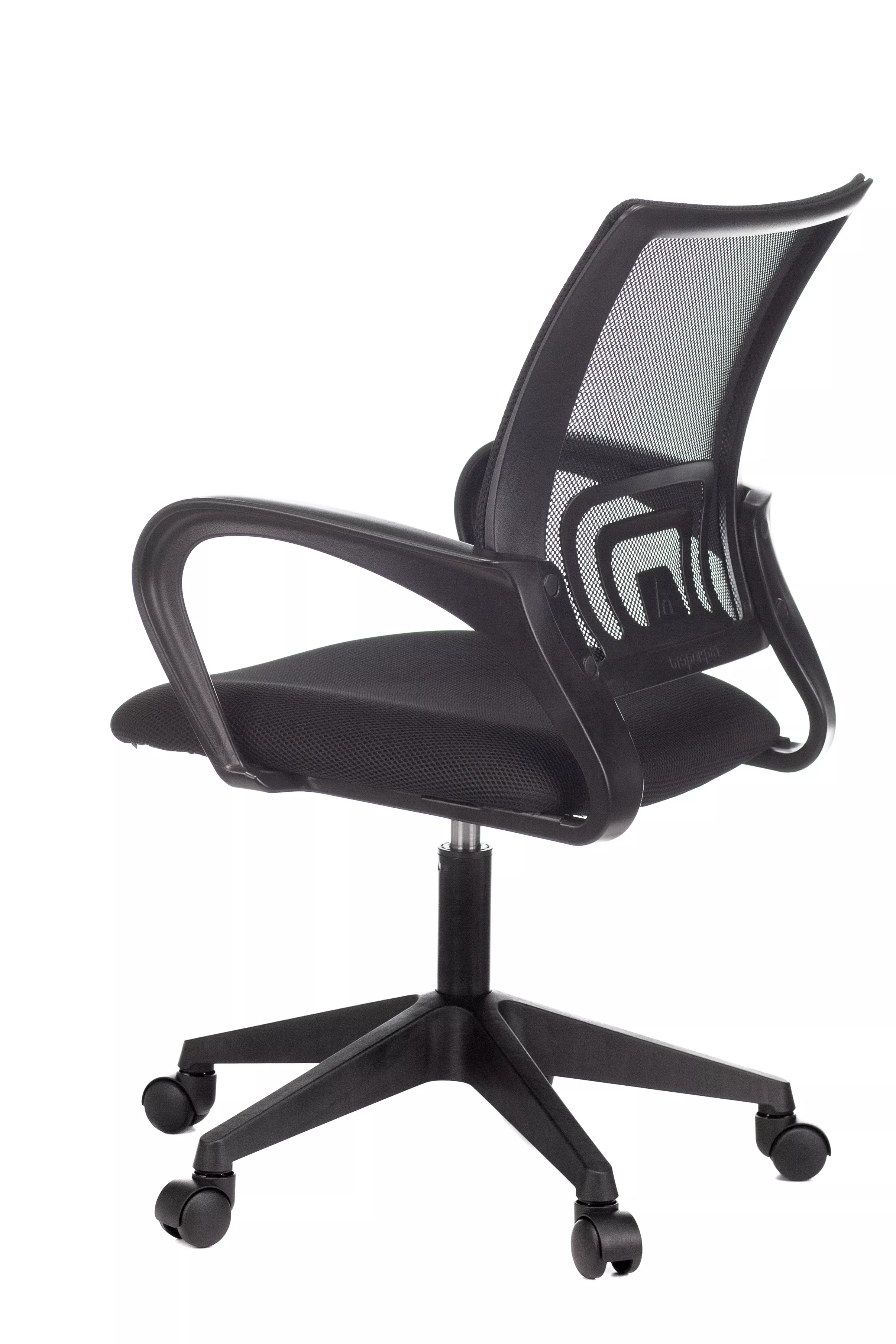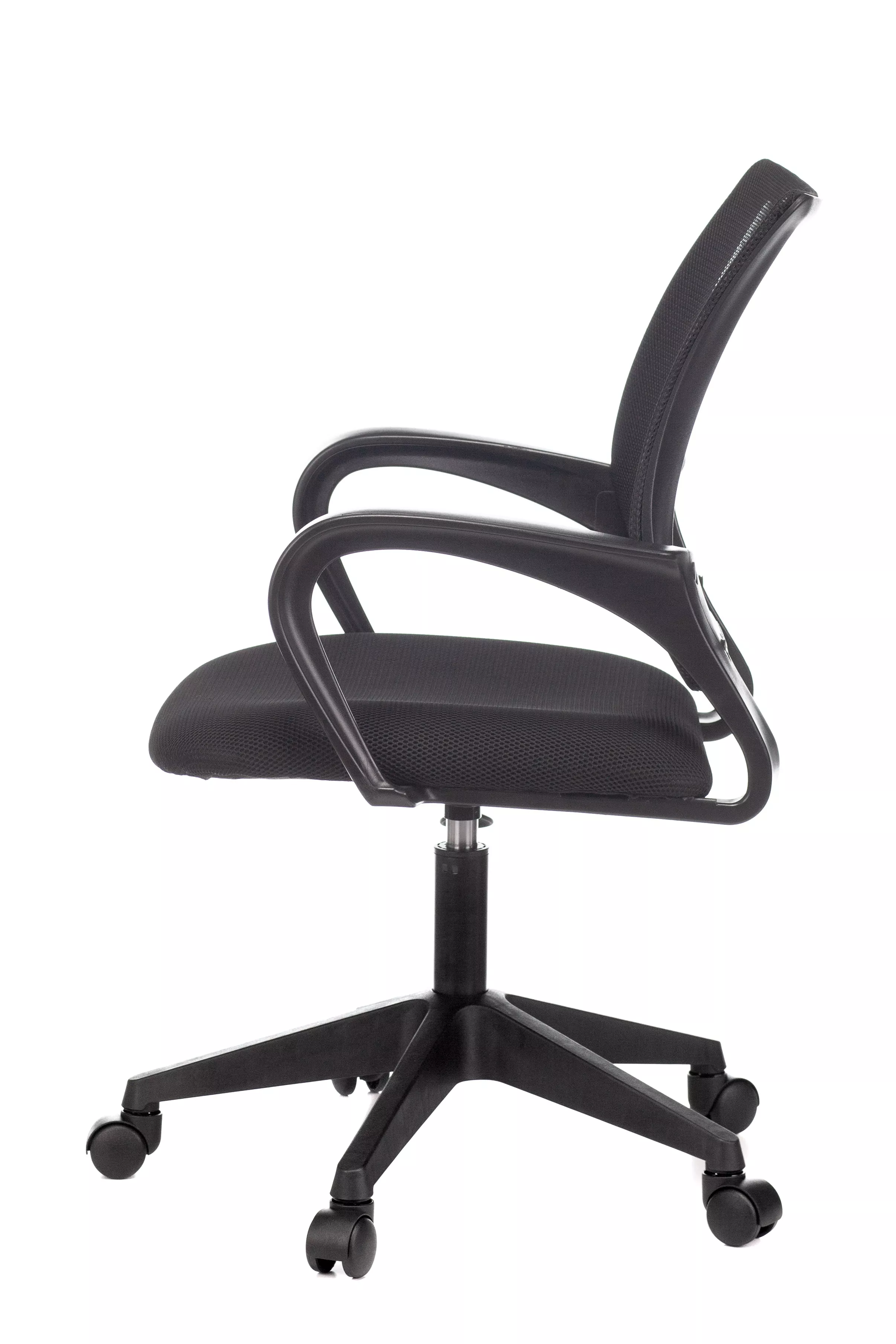 Ткань черного цвета, которой обтянуто сидение кресла, отличается своей прочностью и износостойкостью.Пятилучевая крестовина изготовлена из прочного пластика. В сочетании с поворотными колесиками, она позволяет креслу легко и бесшумно передвигаться по любому напольному покрытию. Ограничения - вес более 120 кг.