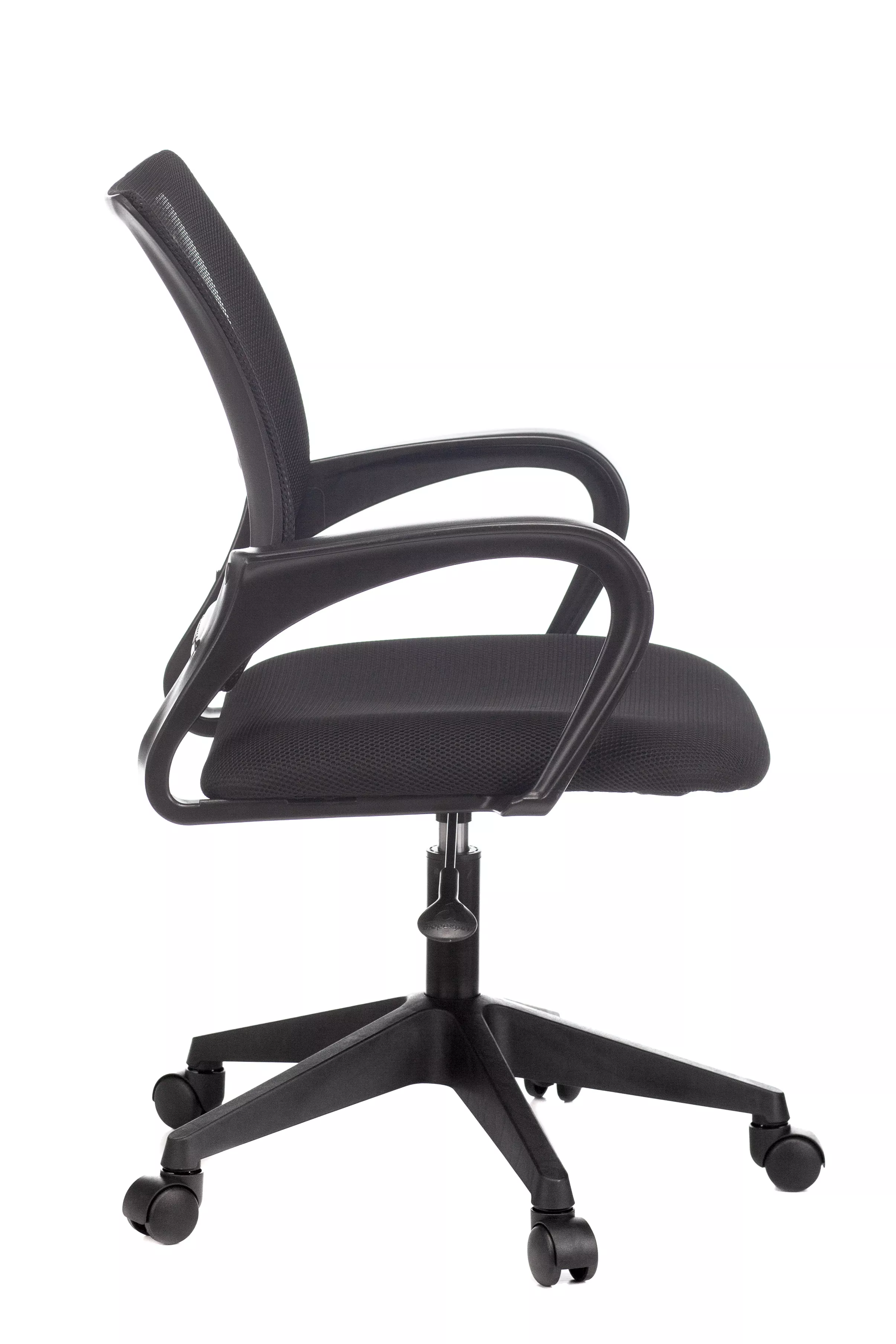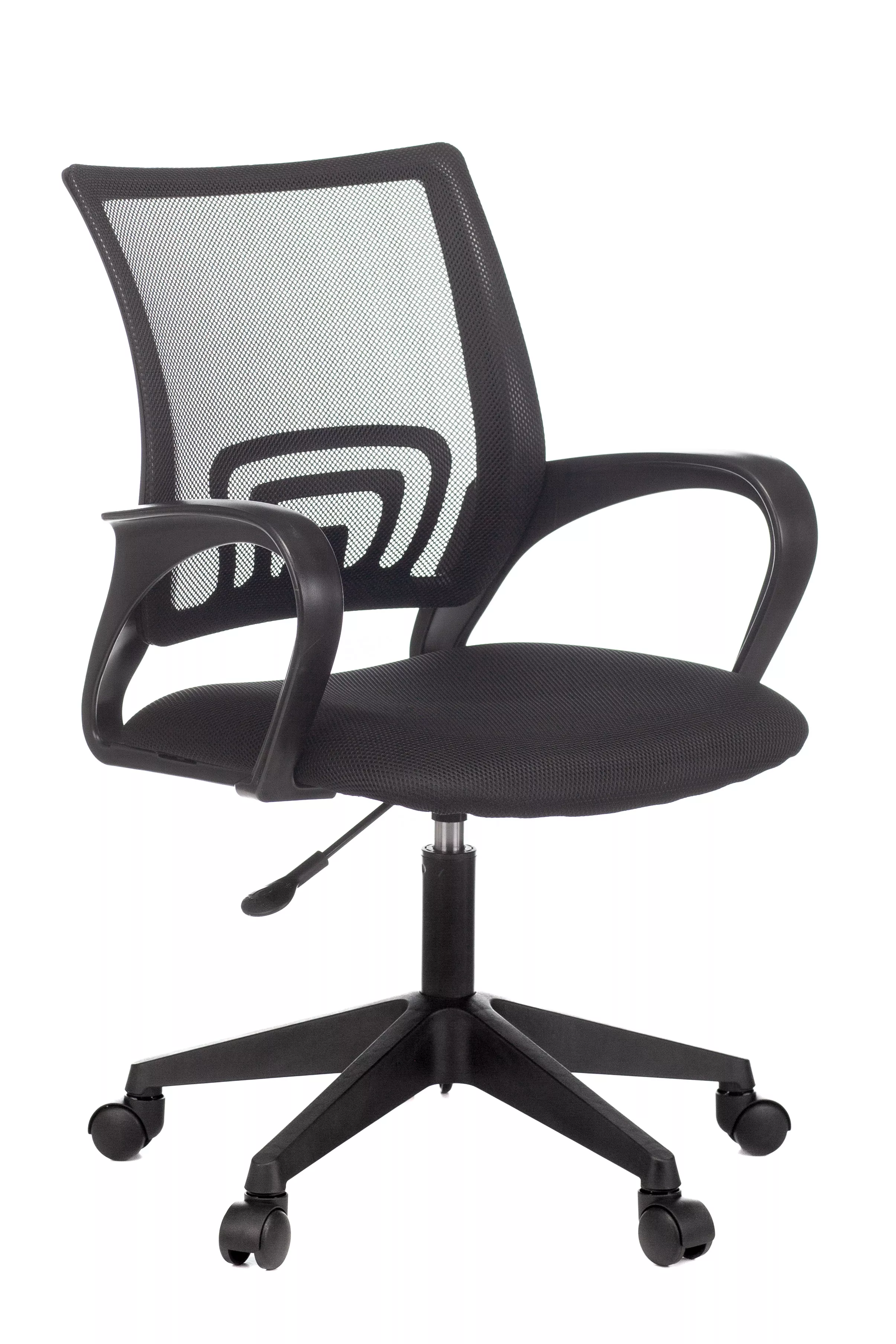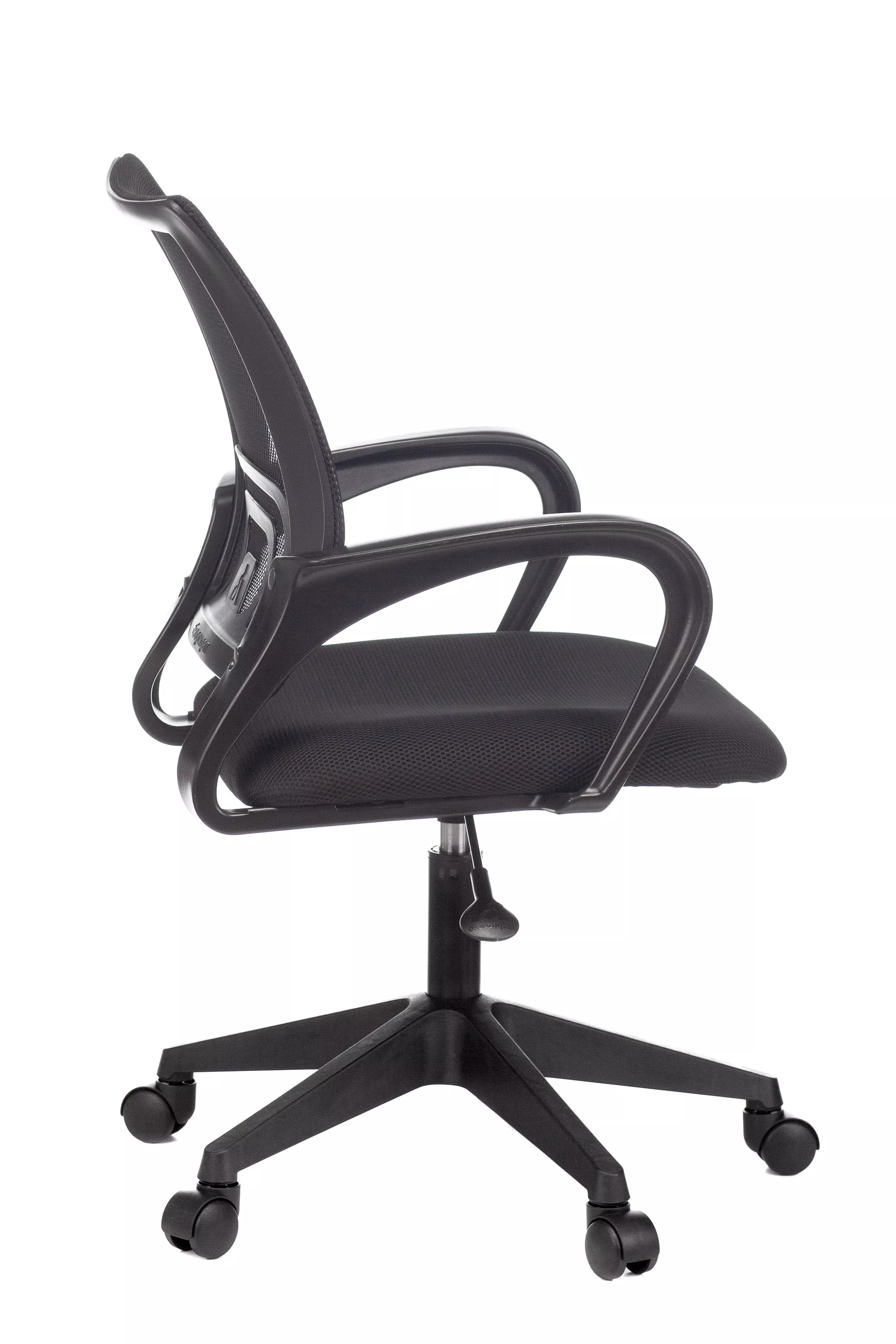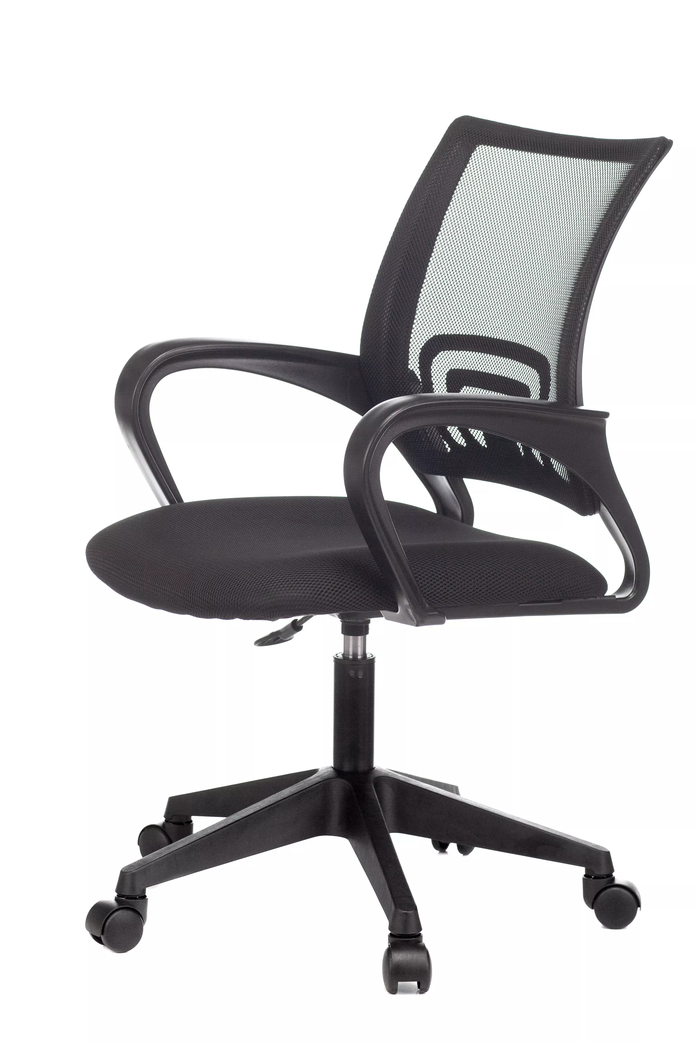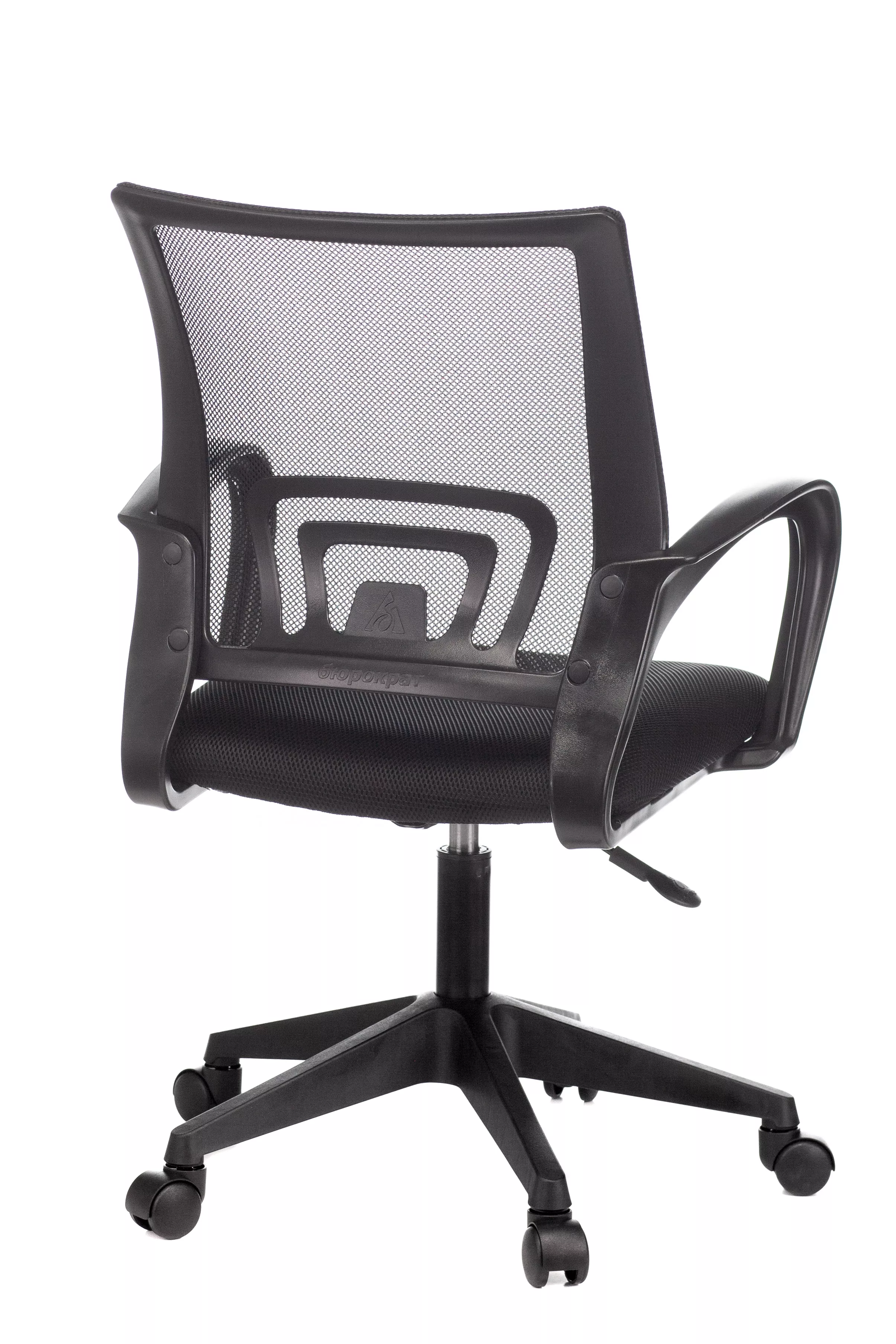 Ткань черного цвета, которой обтянуто сидение кресла, отличается своей прочностью и износостойкостью.Пятилучевая крестовина изготовлена из прочного пластика. В сочетании с поворотными колесиками, она позволяет креслу легко и бесшумно передвигаться по любому напольному покрытию. Ограничения - вес более 120 кг.