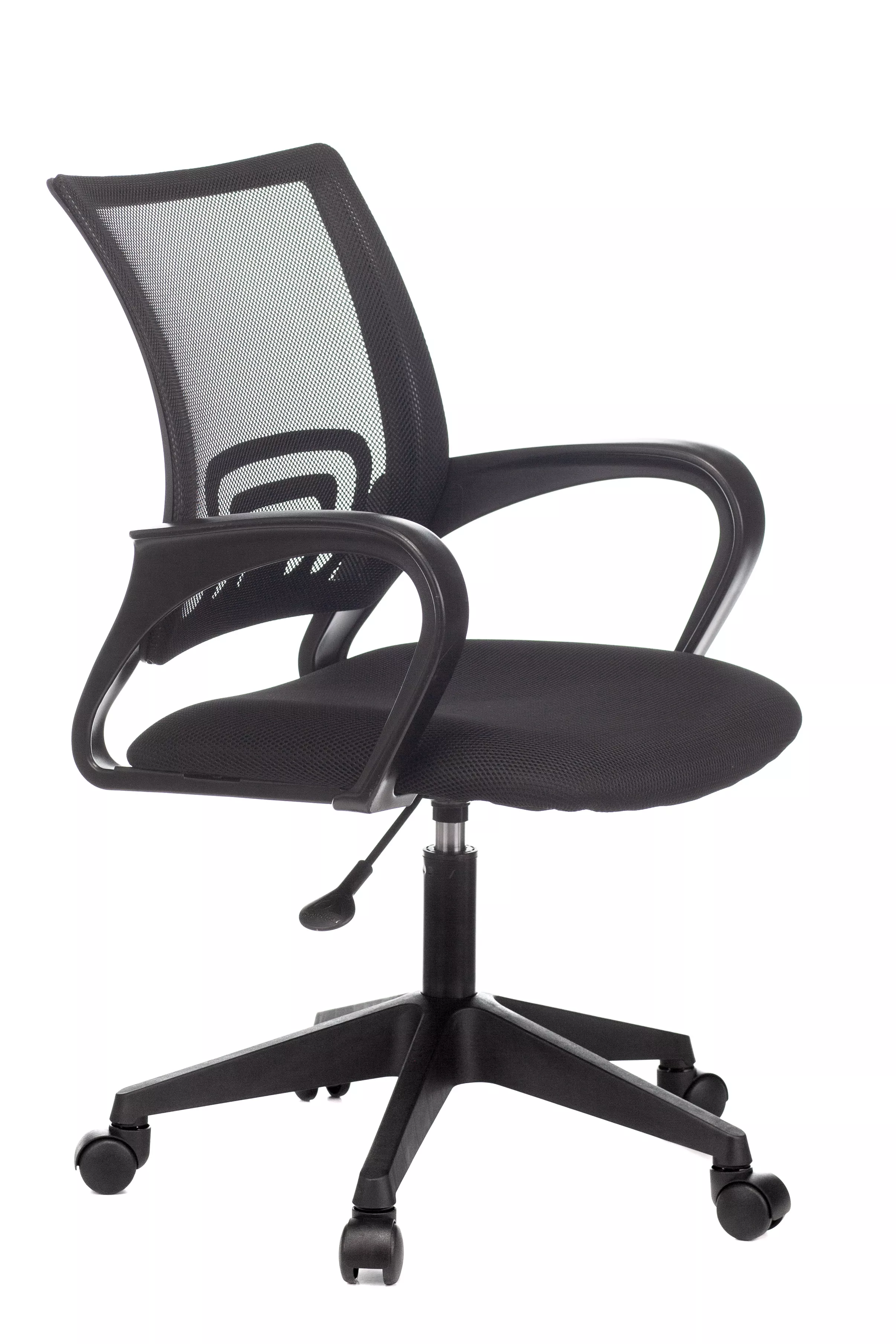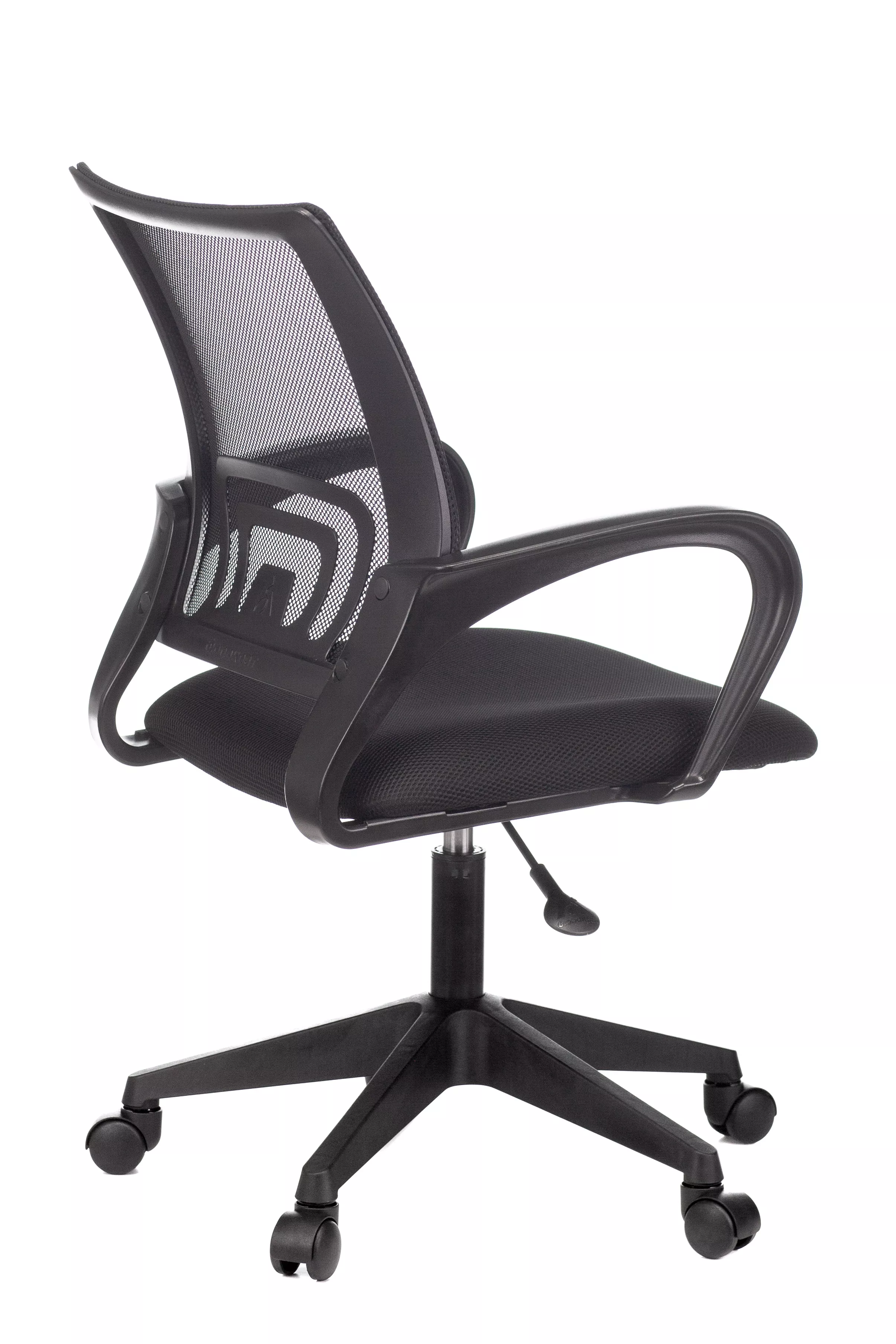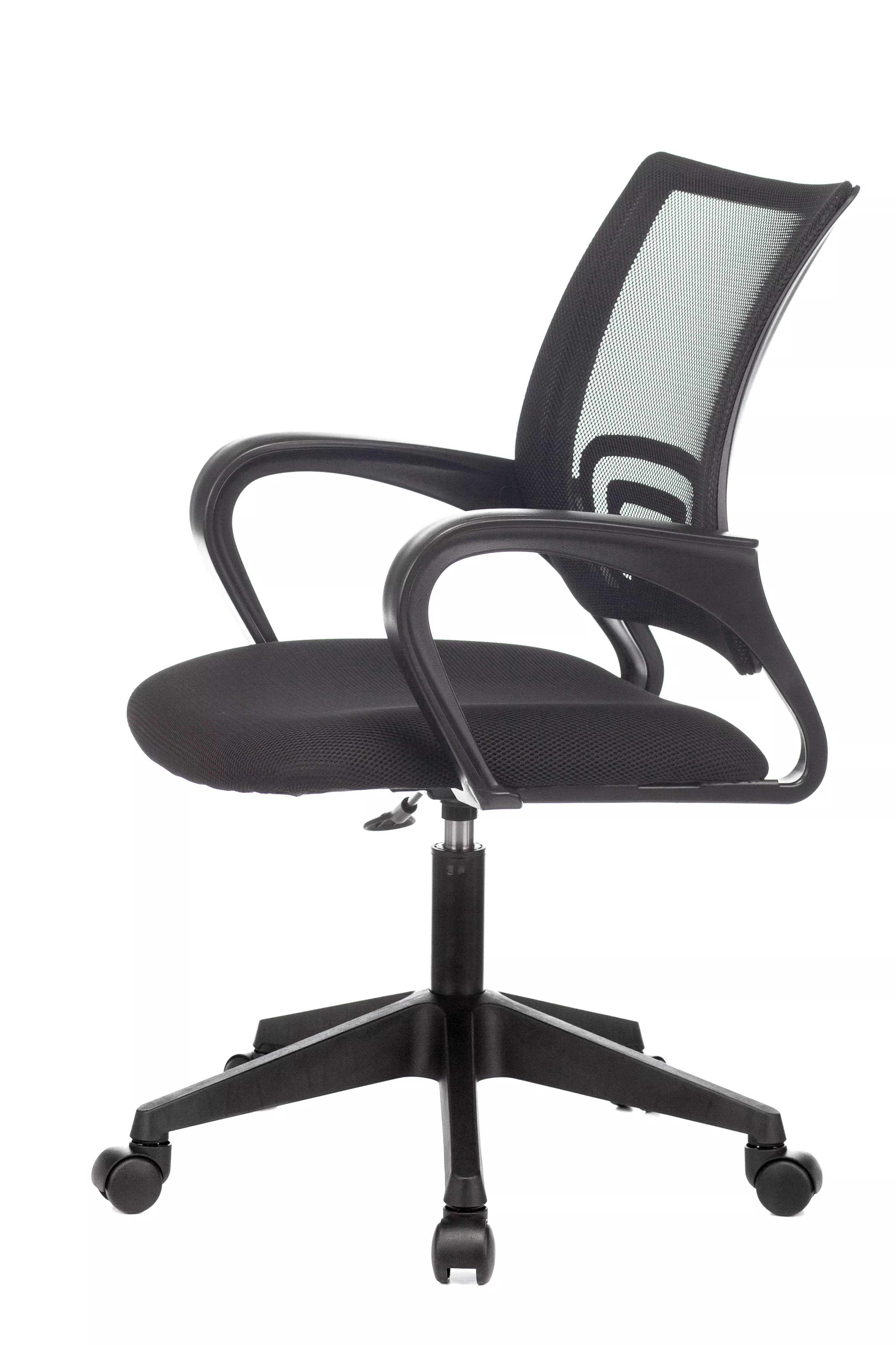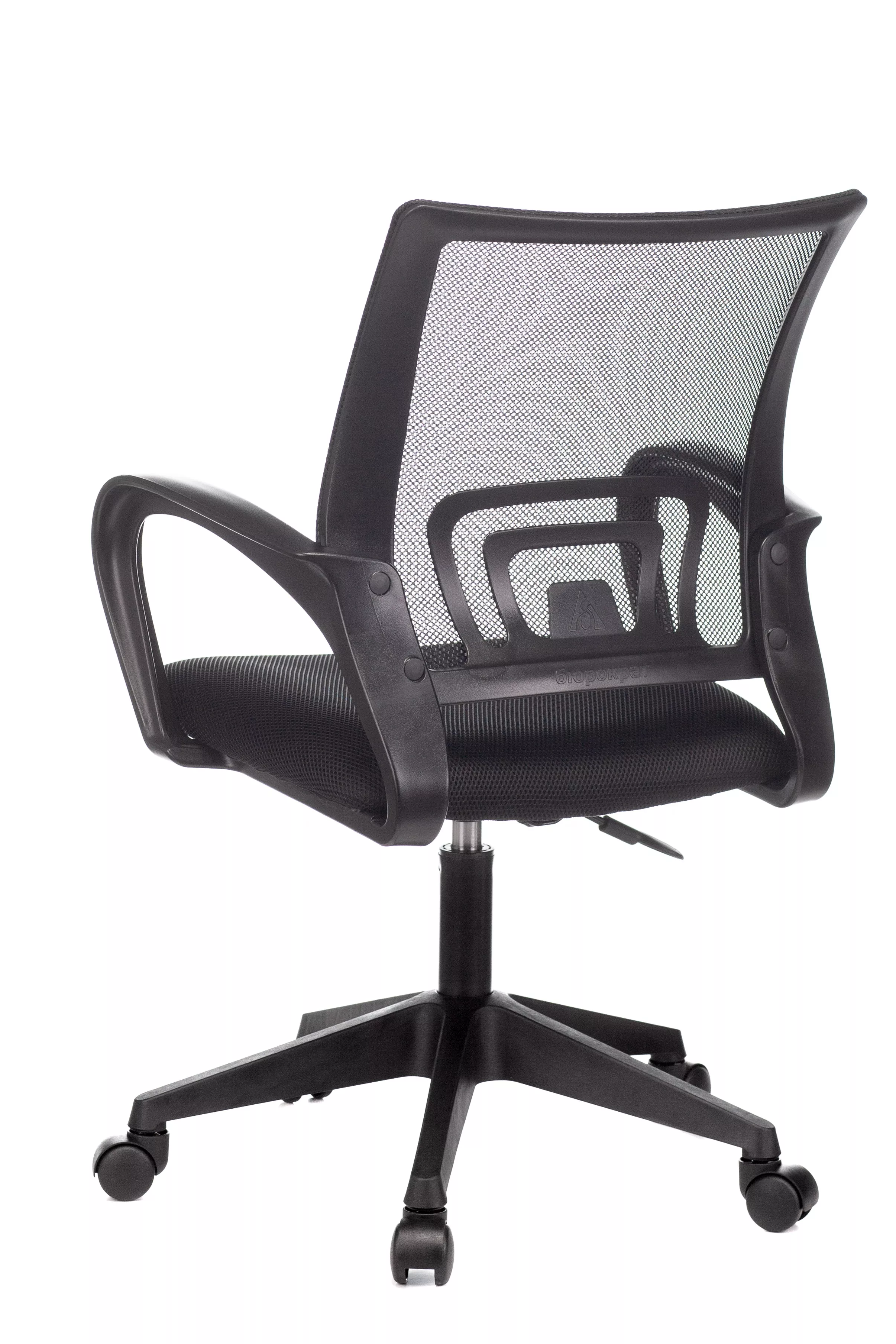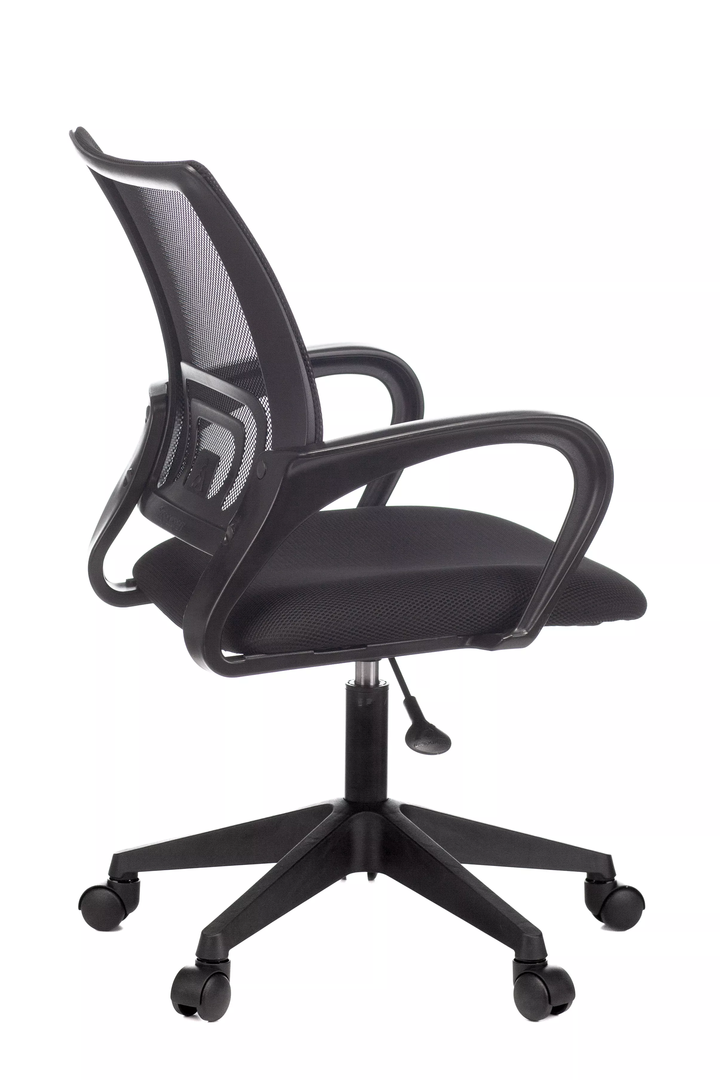 Ткань черного цвета, которой обтянуто сидение кресла, отличается своей прочностью и износостойкостью.Пятилучевая крестовина изготовлена из прочного пластика. В сочетании с поворотными колесиками, она позволяет креслу легко и бесшумно передвигаться по любому напольному покрытию. Ограничения - вес более 120 кг.
