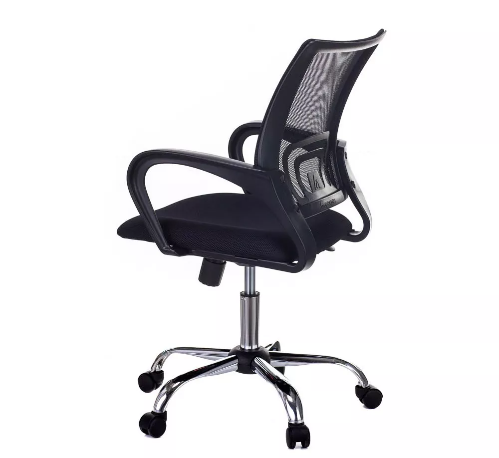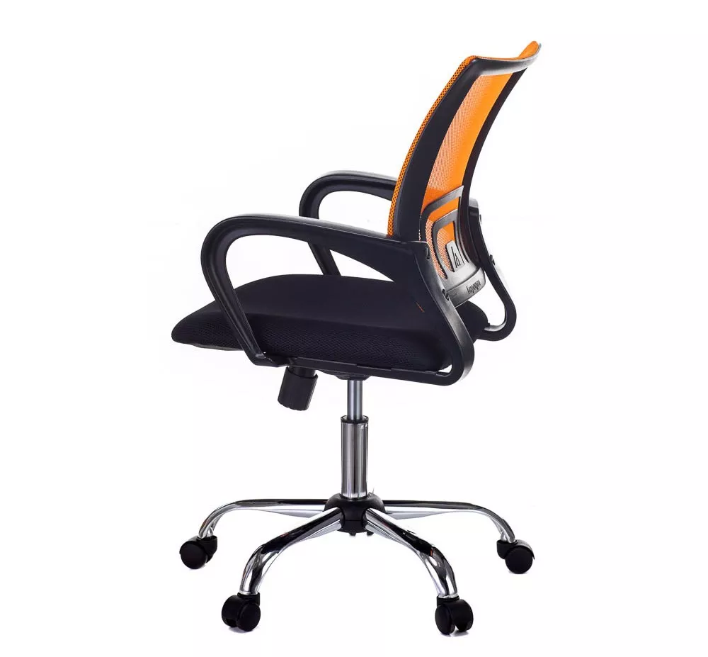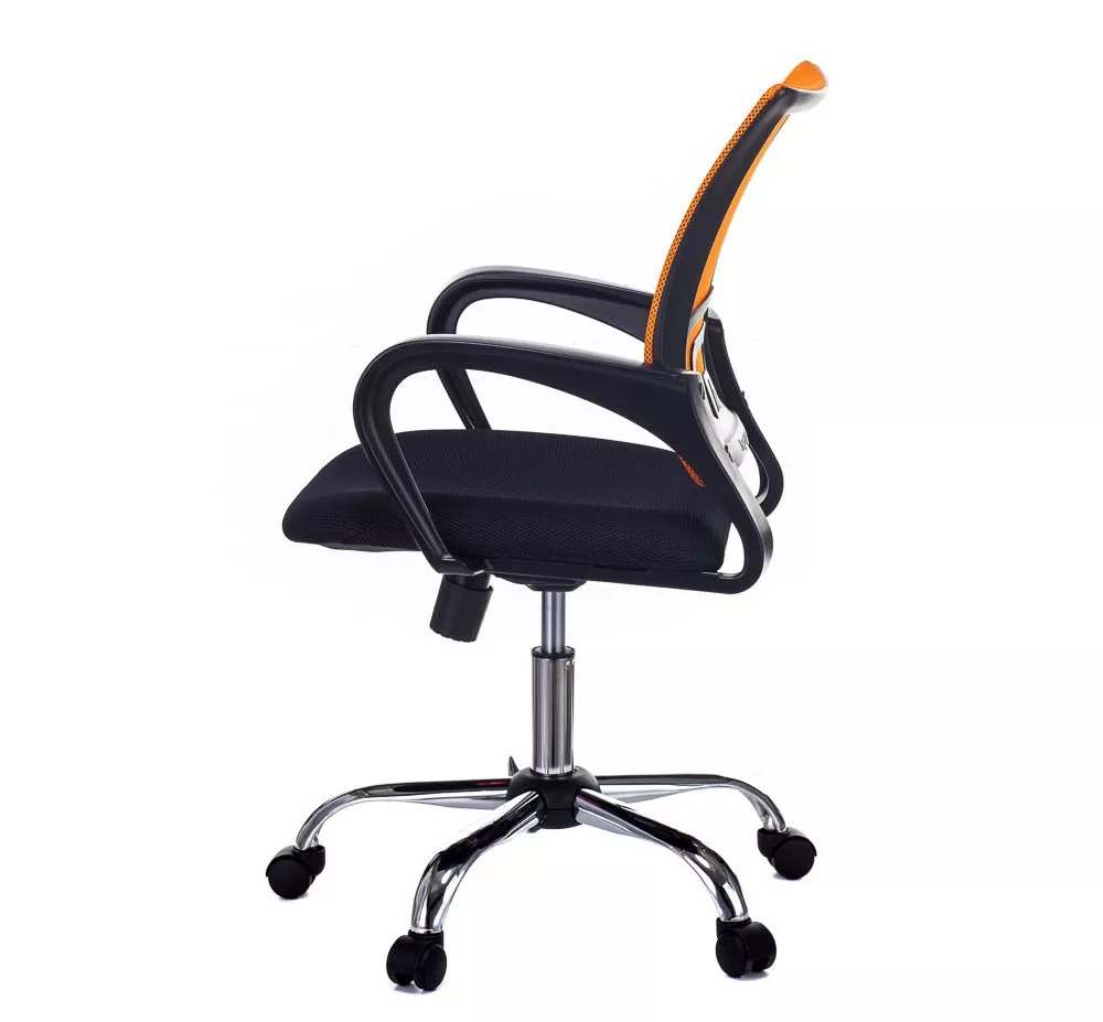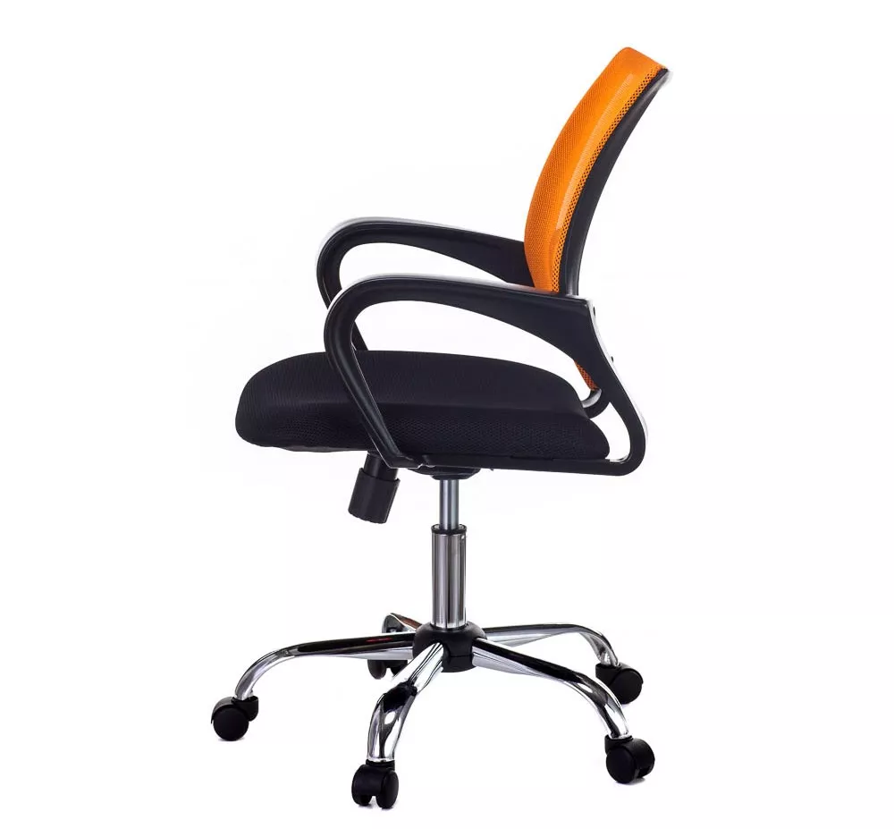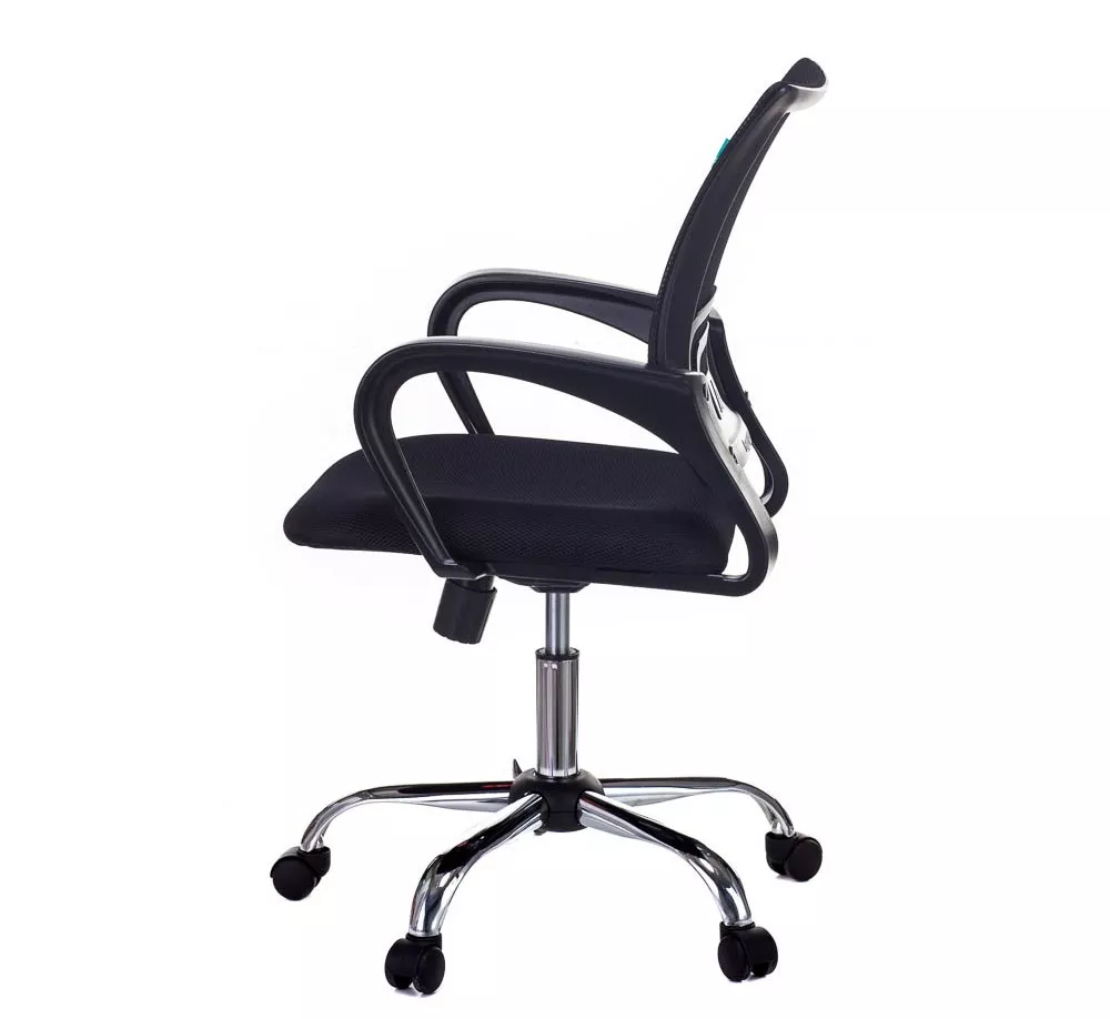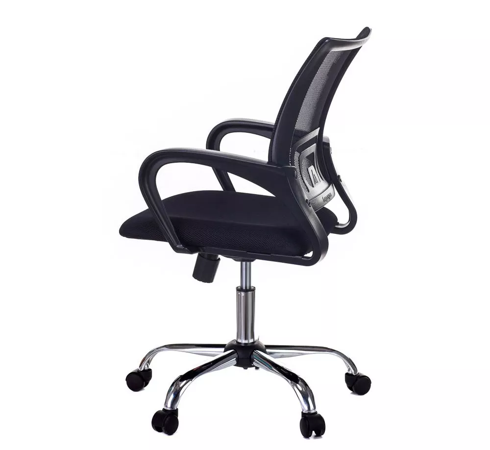 Хромированные элементы кресла выглядят стильно в любом интерьере. Для обивки сидения использована ткань, устойчивая к растяжению, истиранию. В лаконичный дизайн изделия прекрасно вписываются пластиковые подлокотники, которые будут очень удобными для владельца кресла. Хромированная пятилучевая крестовина с поворотными колесиками делает