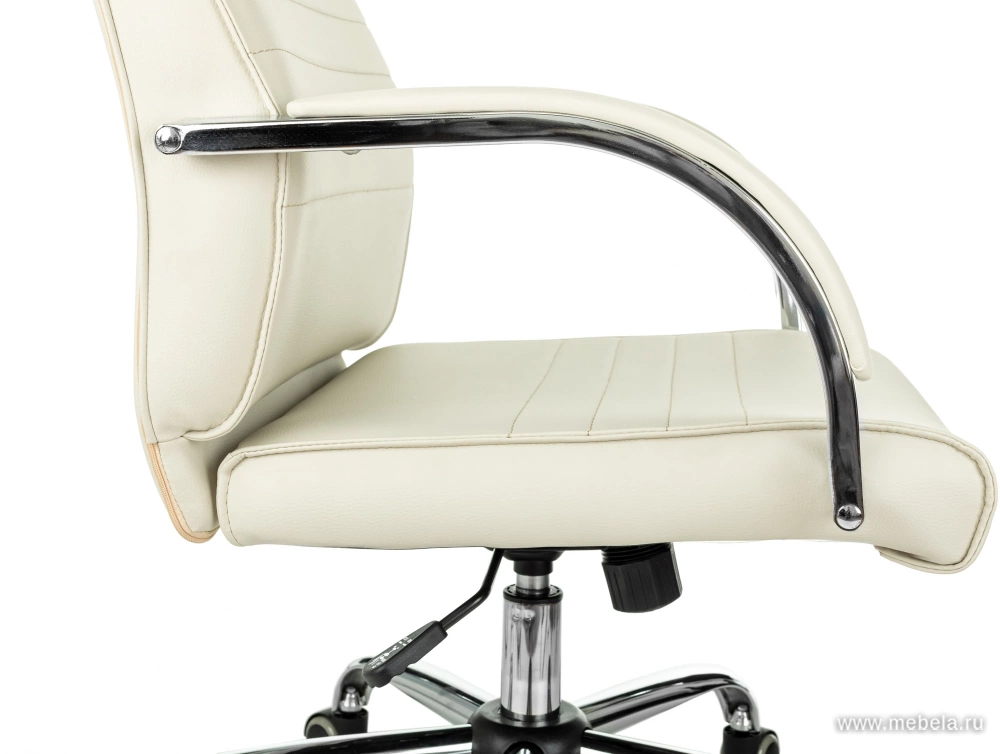 Качественный кожзам, которым обита спинка и сидение, имеет высокие показатели износоустойчивости, он легко чистится и не требует дополнительных затрат на уход, а также придает внешнему виду кресла солидности, утонченности. Накладки из кожзама делают и без того оригинальные подлокотники более стильными и удобными. Пятилучевая