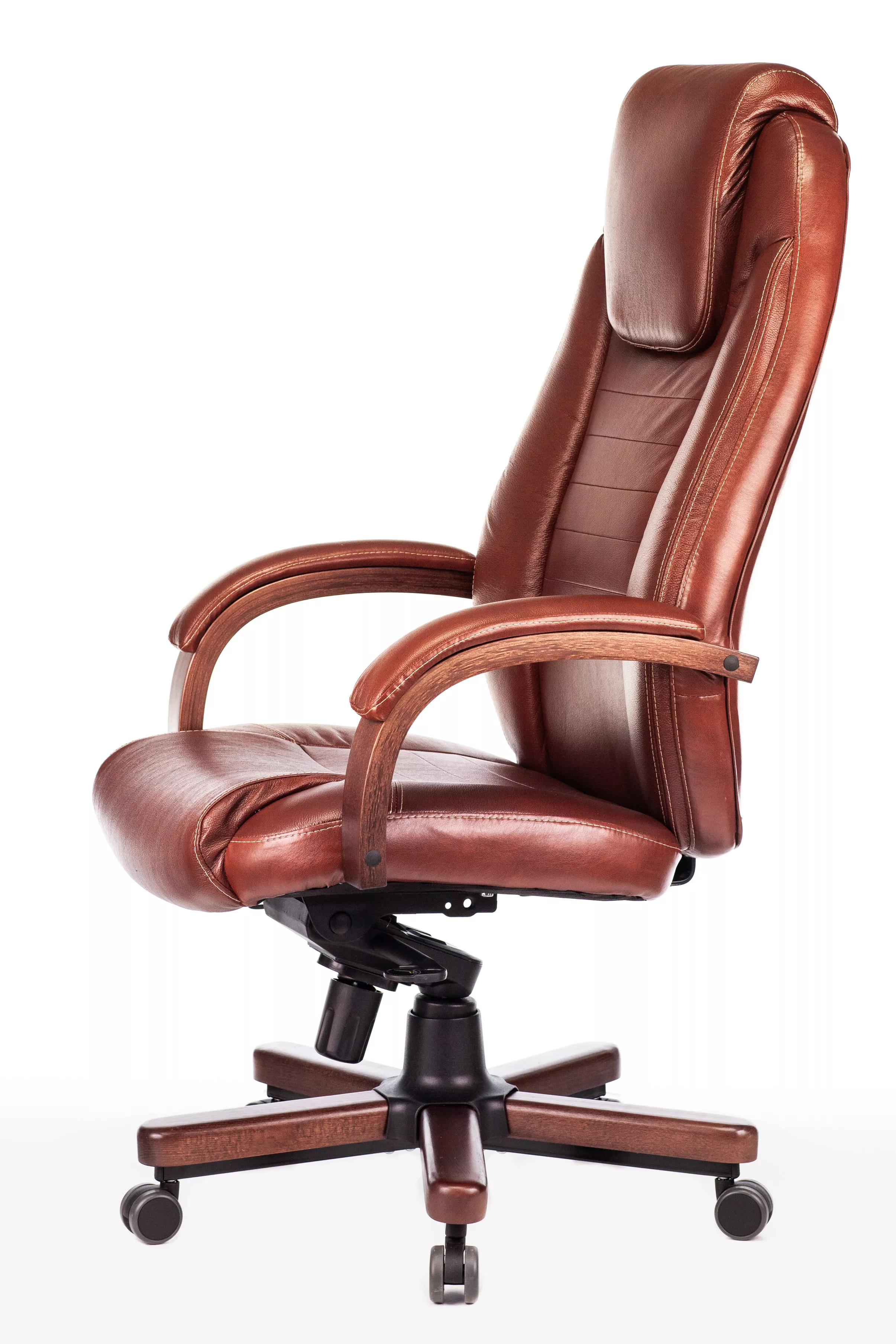 Наполнитель кресла выполнен из эластичного высокоупругого поролона, который обеспечивает мягкость и комфорт при сидении. Подлокотники кресла выполнены из дерева в цвете "темный орех" и имеют мягкие накладки из натуральной кожи на лицевых частях, что добавляет дополнительный комфорт.