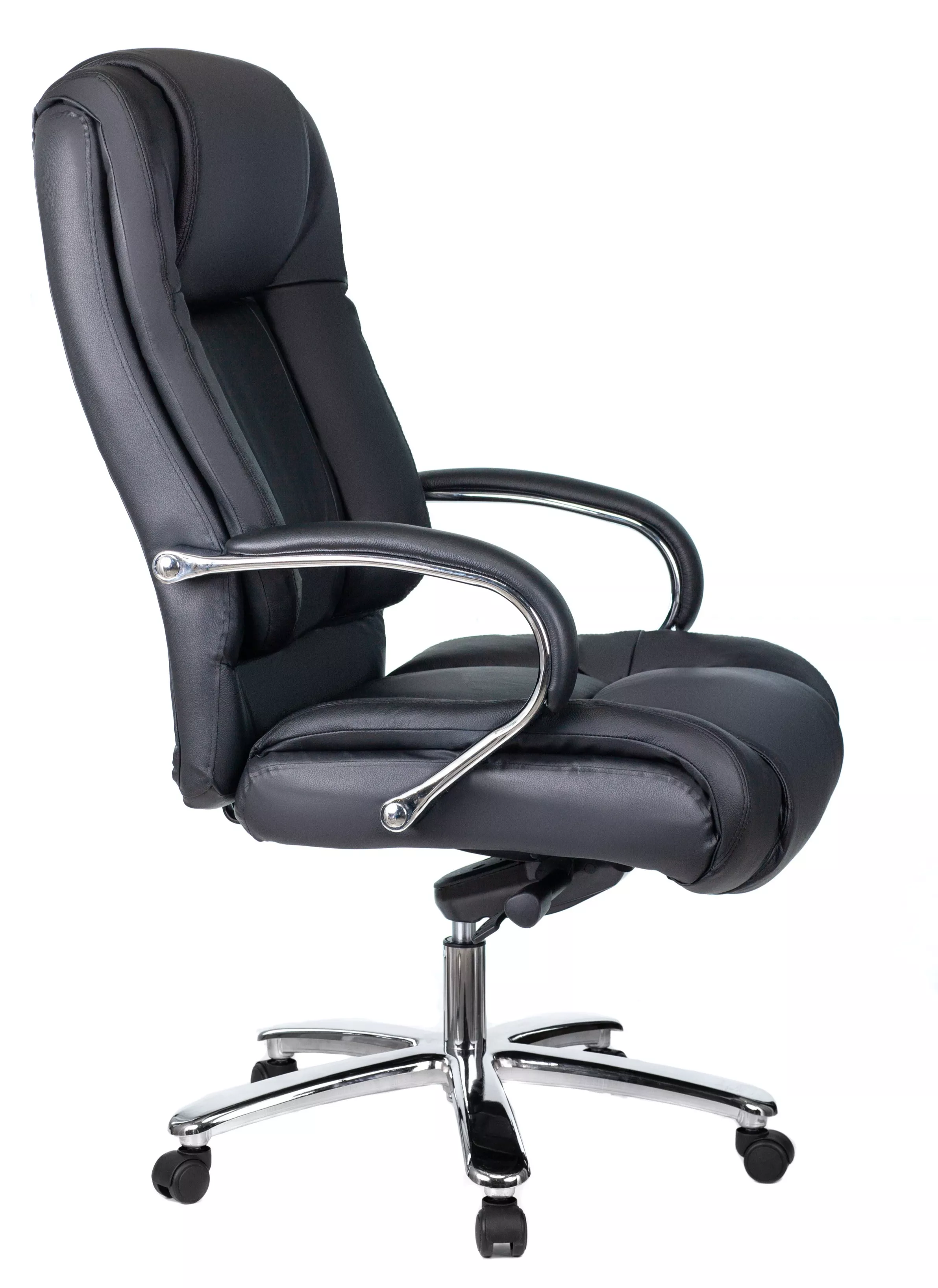 Кресло изготовлено из высококачественной экокожи черного цвета, которая отличается прочностью, гибкостью и долговечностью. Внешнее покрытие выглядит презентабельно и не поддается загрязнениям. Пластиковые колеса подходят для любого покрытия. Они не поцарапают ламинат, линолеум или паркет. Зафикси...