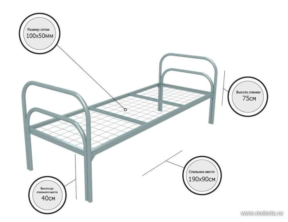 Каркас кровати изготовлен из профильных труб 40х20 мм с толщиной стенки 1,2 мм, что гарантирует долговечность и устойчивость конструкции. Высота от пола до спального места составляет 40 см, а высота спинки — 73 см, что делает ее удобной для использования.