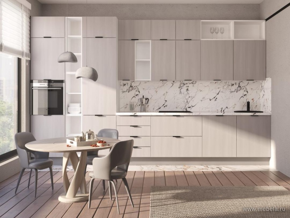 Надёжная фурнитура и направляющие с доводчиками HÄFELE (Германия) обеспечивают плавное и бесшумное закрывание дверей и ящиков. Эргономичные чёрные металлические ручки подчёркивают современный стиль кухни. Столешница толщиной 38 мм в цвете «Мрамор Каприа» с эффектом постформинга устойчива к влаге и нагрузкам. Пластиковый цоколь в цвете «Алюминий» и аккуратный пристеночный бортик «900 Белый» завершают образ мебели.