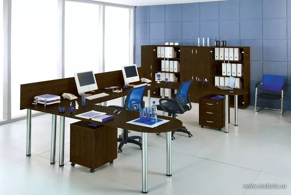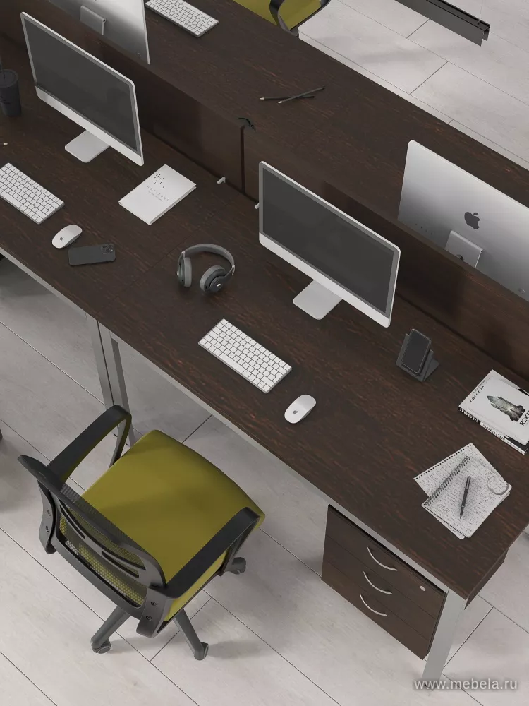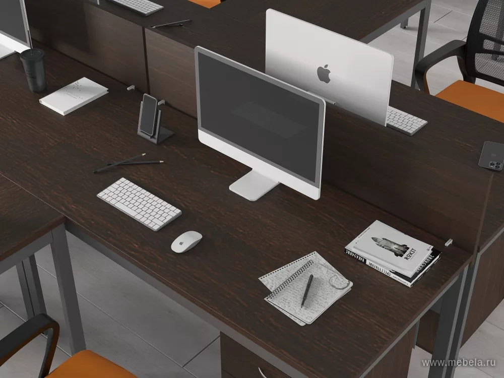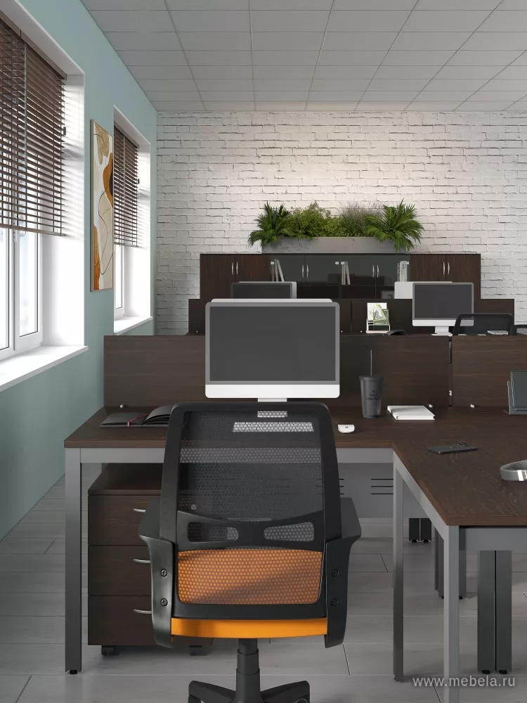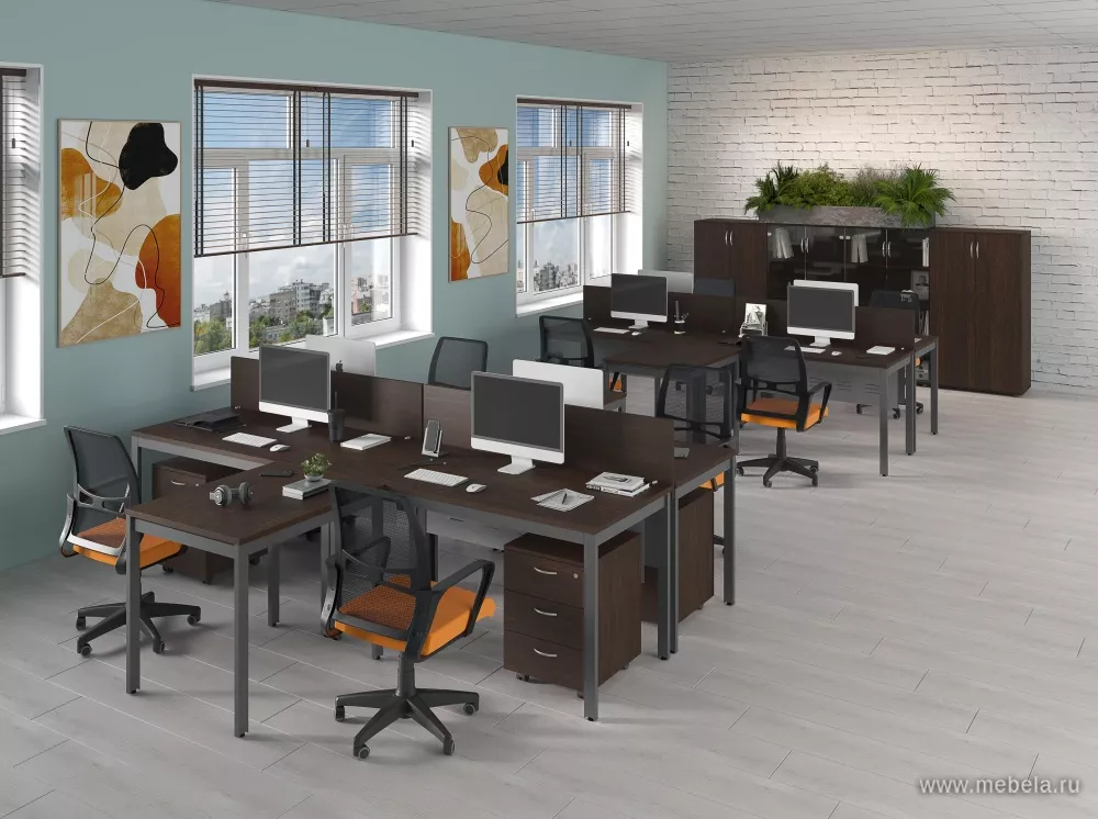 Главной особенностью мебели для офисов Формула в цвете Венге является возможность создания из нее сложно-комбинированных рабочих зон. Гарнитур представлен самыми разными геометрическими решениями, одинаковыми по высоте, способными быть объединенными друг с другом по воле заказчика.