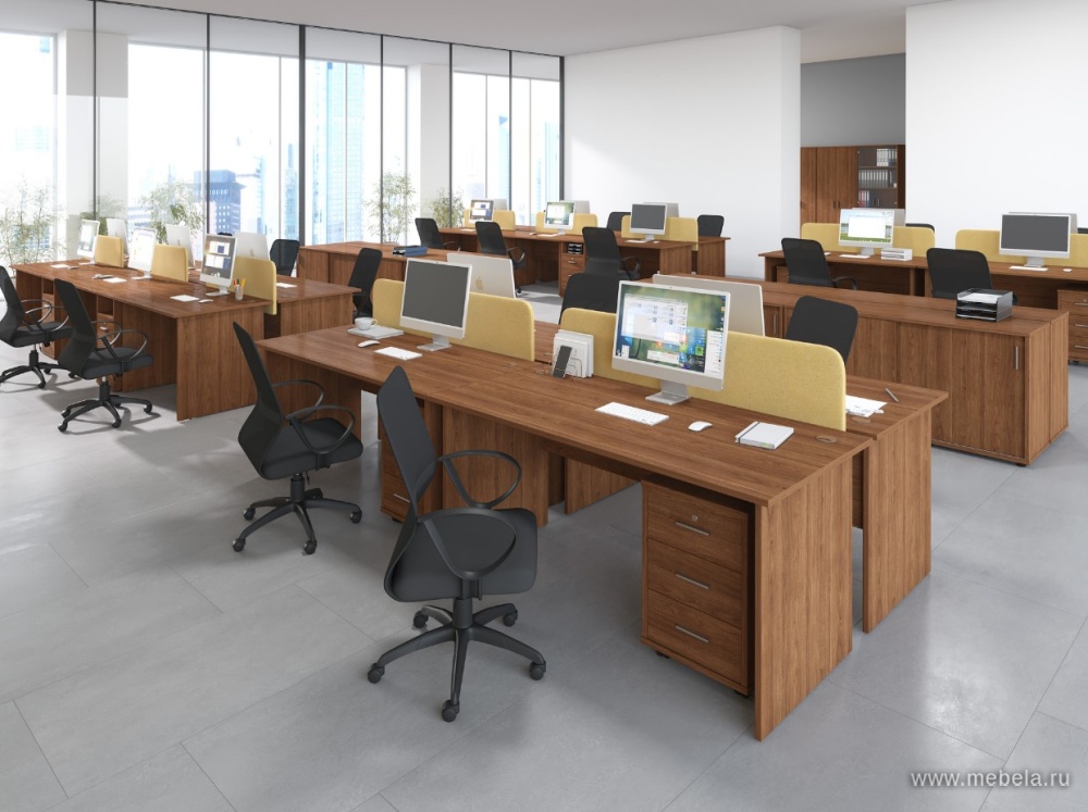 Лаконичный комплект мебели для офиса Тренд в цвете орех. Мебель этой серии обычно покупают, чтобы оборудовать рабочие места для линейных сотрудников. Письменные столы из комплекта комбинируются друг с другом, разделяя пространство на отдельные рабочие зоны.