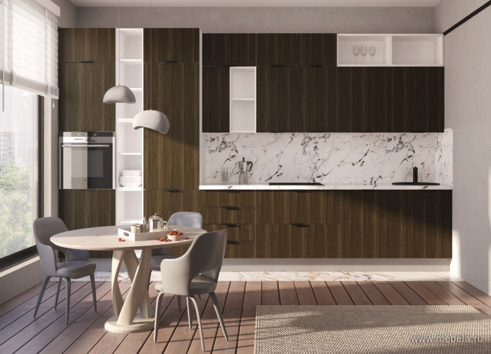 Надёжная фурнитура HÄFELE (Германия) и направляющие с доводчиками Hettich (Германия) обеспечивают плавное и бесшумное закрывание дверей и ящиков. Эргономичные чёрные металлические ручки подчёркивают современный стиль кухни. Столешница толщиной 38 мм в цвете «Мрамор Каприа» с эффектом постформинга устойчива к влаге и нагрузкам. Пластиковый цоколь в цвете «Алюминий» и аккуратный пристеночный бортик «900 Белый» завершают образ мебели.