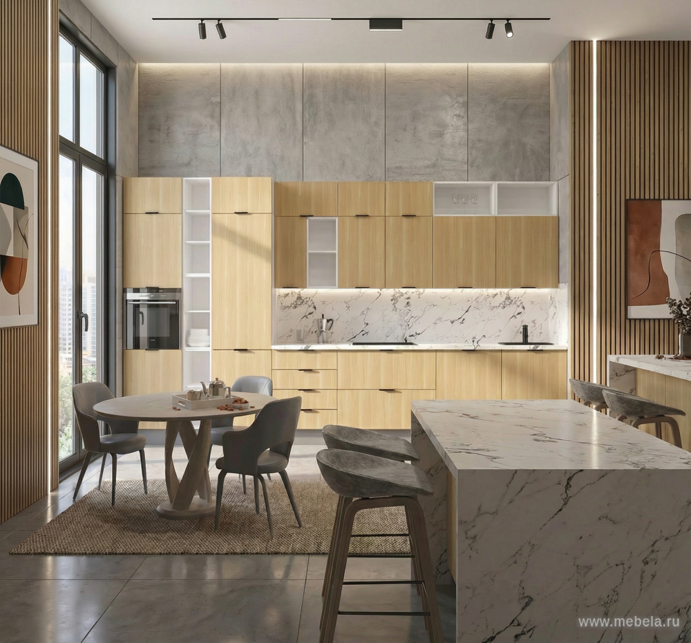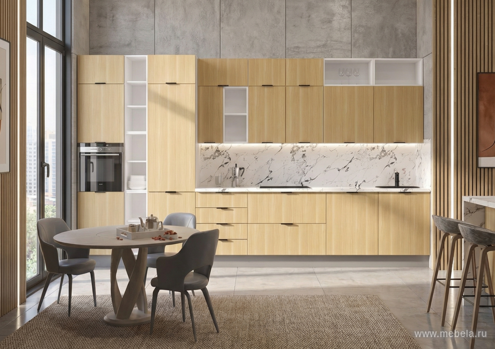 Надёжная фурнитура и направляющие с доводчиками HÄFELE (Германия) обеспечивают плавное и бесшумное закрывание дверей и ящиков. Эргономичные чёрные металлические ручки подчёркивают современный стиль кухни. Столешница толщиной 38 мм в цвете «Мрамор Каприа» с эффектом постформинга устойчива к влаге и нагрузкам. Пластиковый цоколь в цвете «Алюминий» и аккуратный пристеночный бортик «900 Белый» завершают образ мебели.