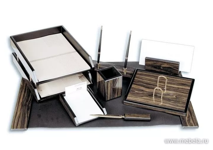 Изделие изготовлено из дерева высокого качества, что придает ему элегантный и стильный вид. Черное дерево подчеркивает респектабельность набора. Лоток выполнен в двойном исполнении, что позволяет удобно хранить и сортировать документы.