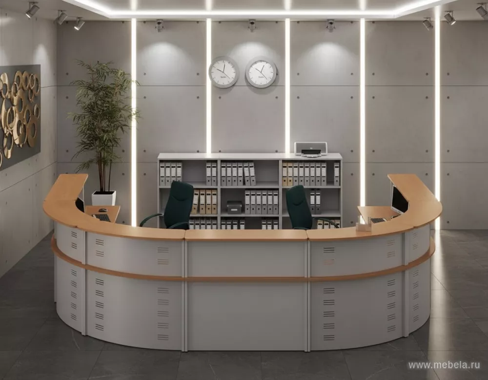 Сочетание сразу двух комплектов стоек ресепшн "Бонус" позволило оперировать множеством материалов и форм. Металлические перфорированные фасадные панели, прозрачные стеклянные полки, благородные цвета древесины ламинированных ДСП – все это сочетается в мебели для приемной в любых пропорциях. Толь...
