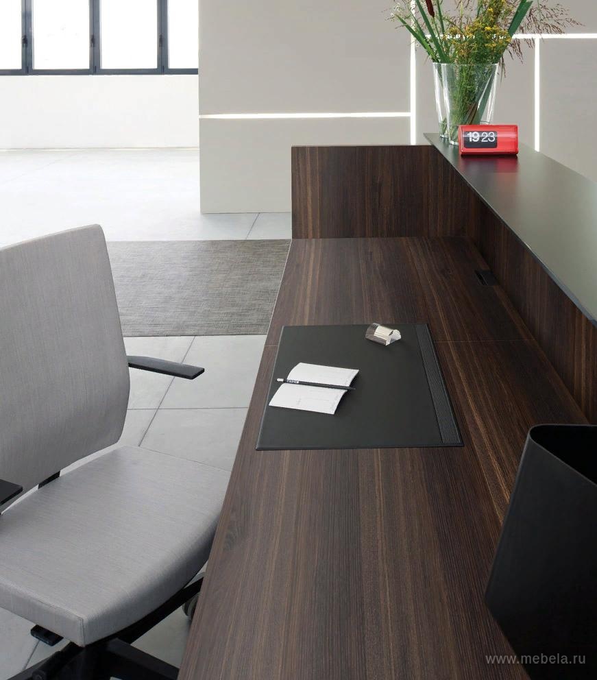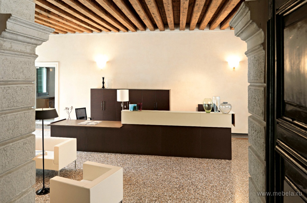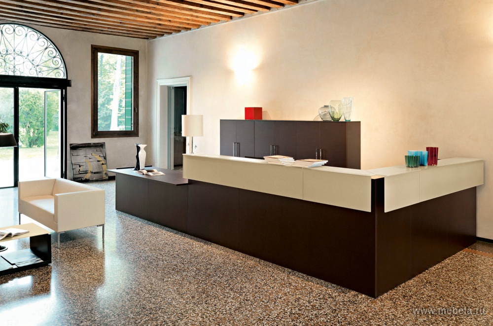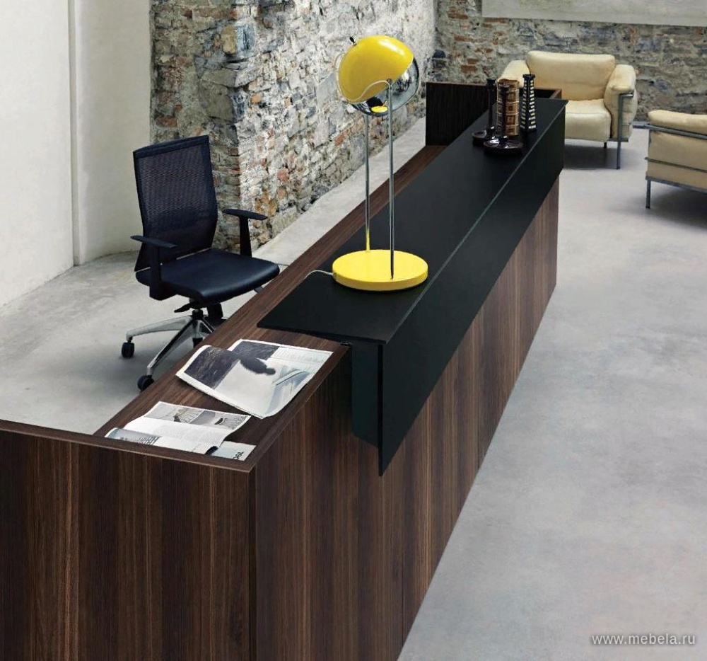 Элегантный итальянский стиль обеспечивает роскошный вид интерьеру стойка ресепшн Factory с помощью простых, но стильных дизайнерских приемов. Эффектный внешний вид жженого дуба или экзотического дерева эбони дополнительно украшен контрастными элементами, создавая не только яркий, но и практичный образ.