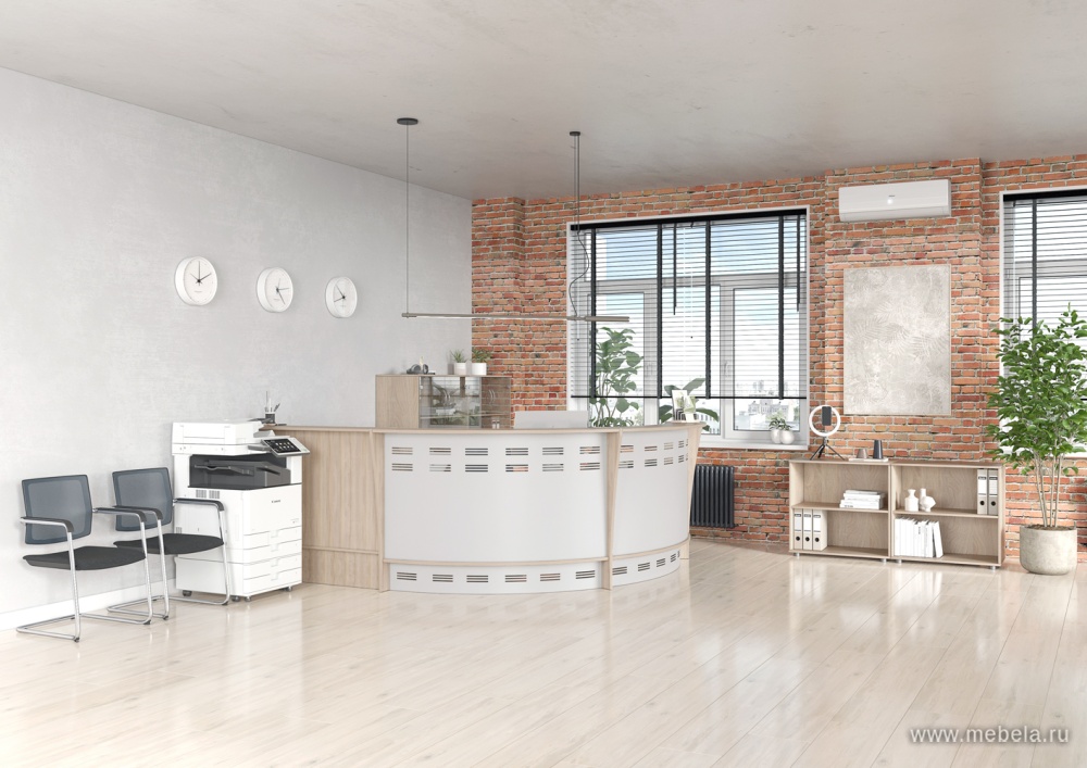 Стойка ресепшн “Формула” идеально подойдет для создания современного и энергичного настроения при первом знакомстве с компанией. Сочетание натуральных цветов и перфорированных металлических вставок создает Хай-Тек образ, идеально подходящий для оформления фитнес-клуба или СтартАпп IT-компании.