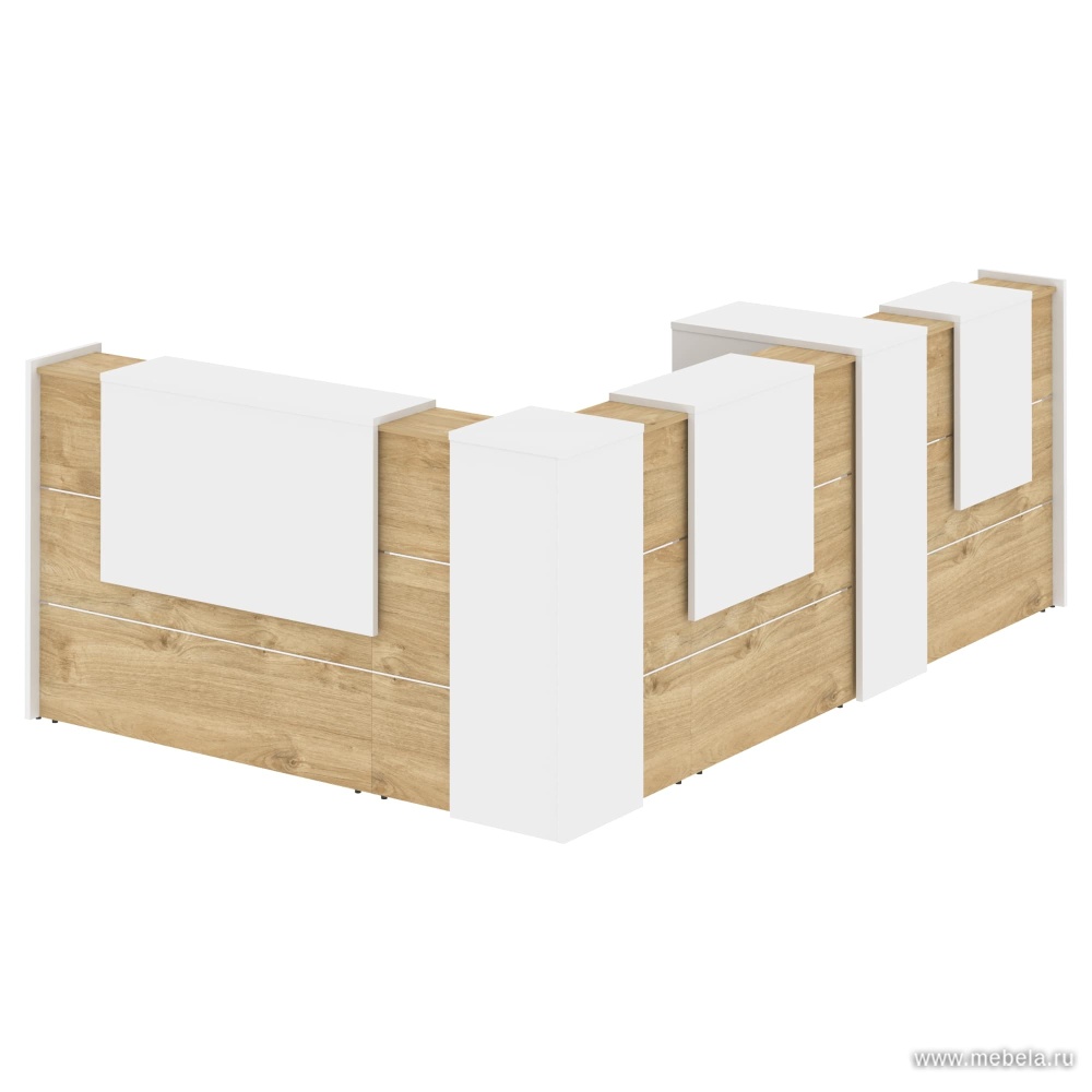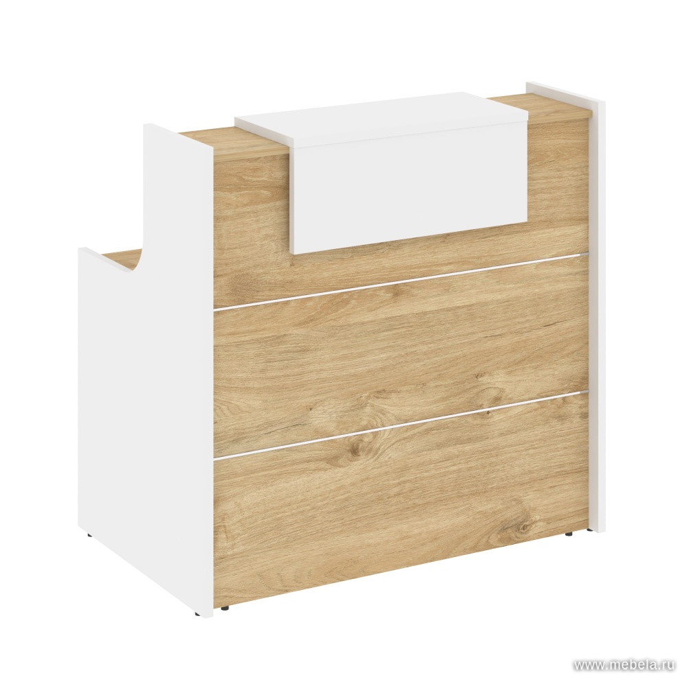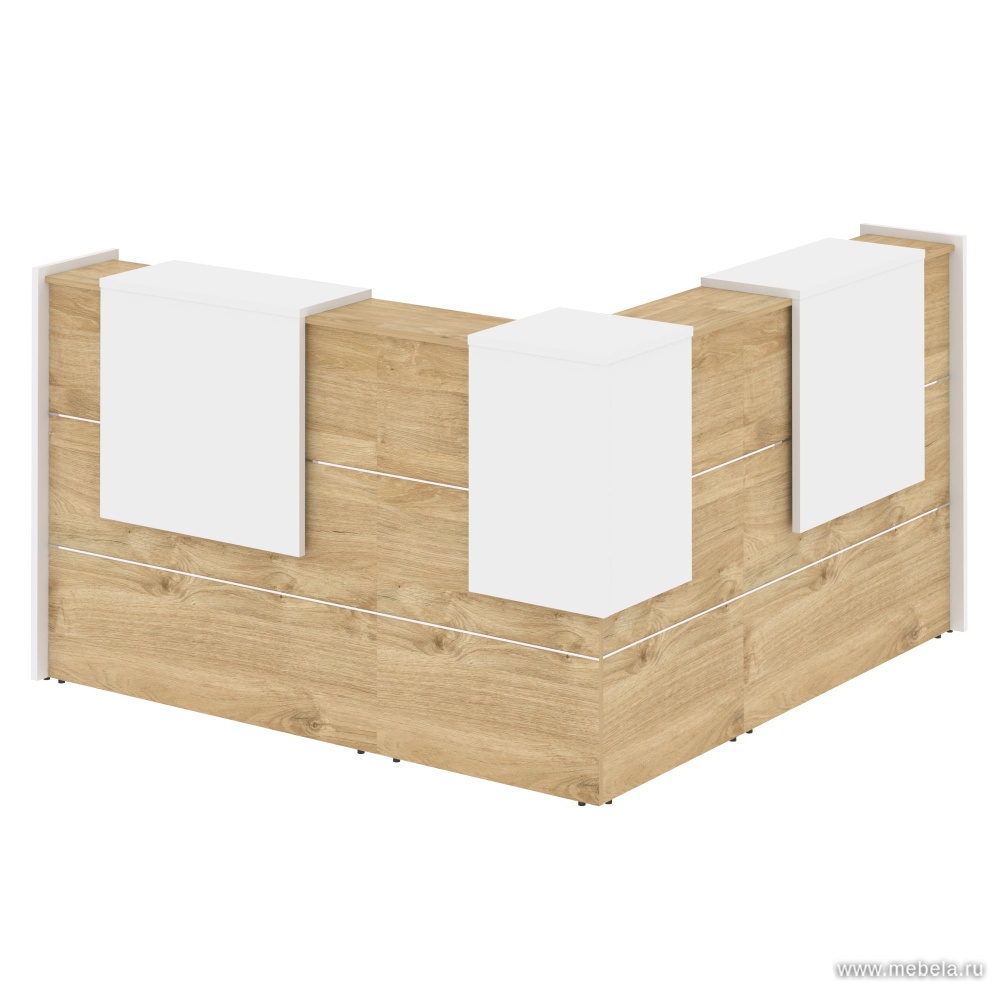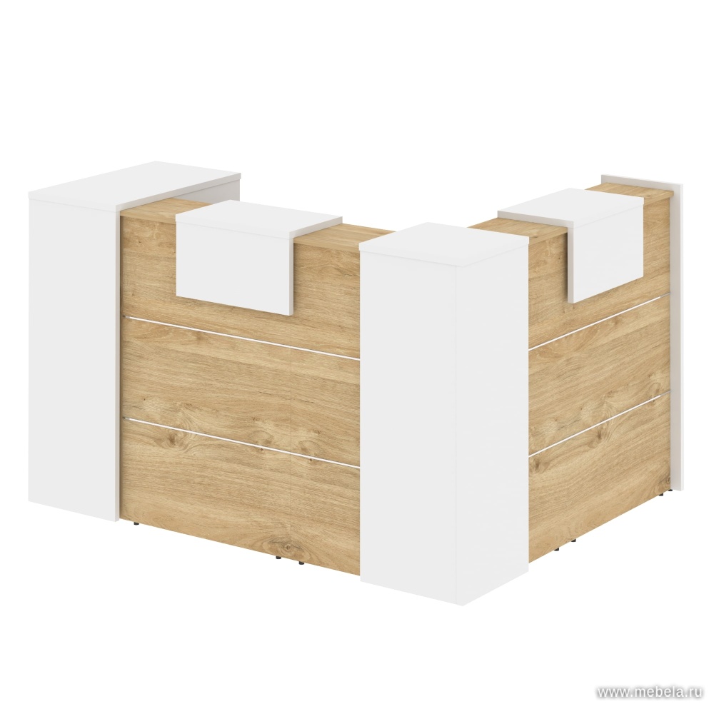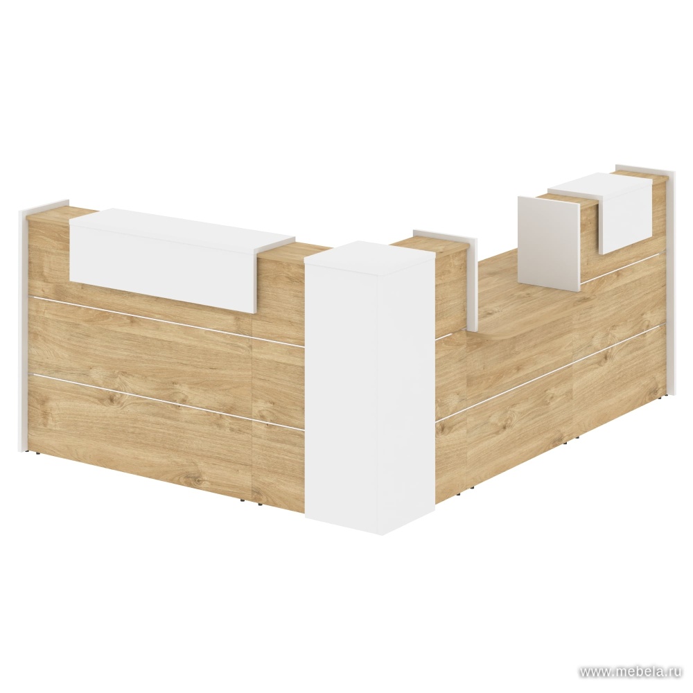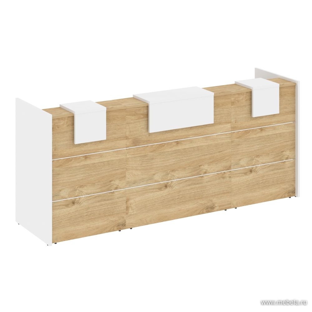 Ресепшн Onix в цвете тиквуд выполнена в эргономичном и современном стиле. Оригинальные геометрические модули и возможность объединения нескольких контрастных декоров придают стойке визуальную легкость и стиль. Модные цвета древесного декорирования в сочетании с белым цветом опор столешницы и топа освежают интерьер. ...