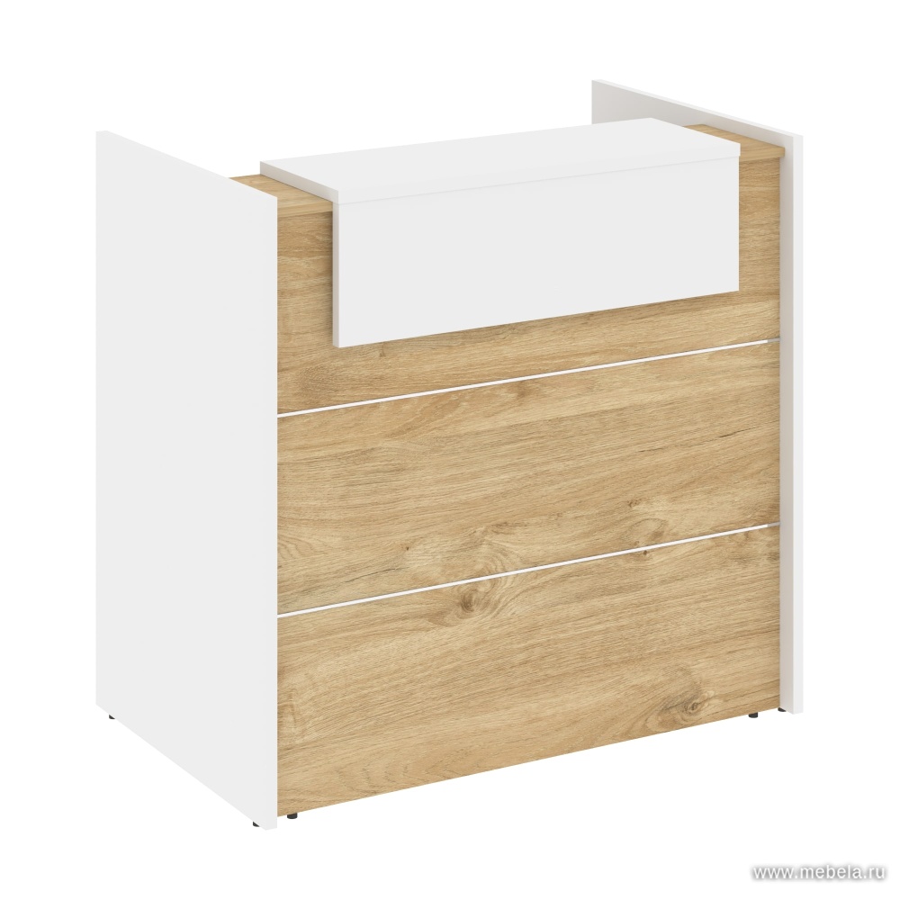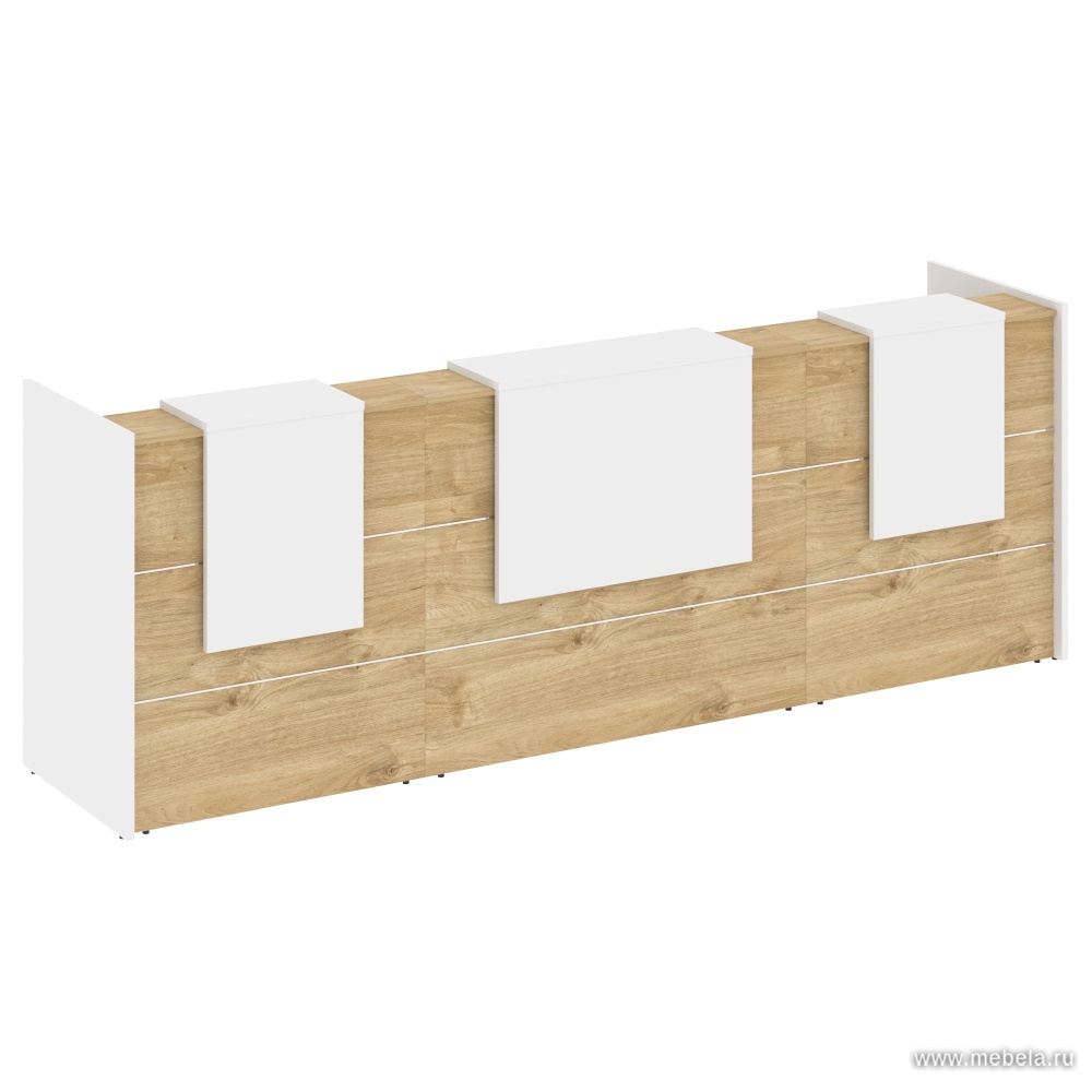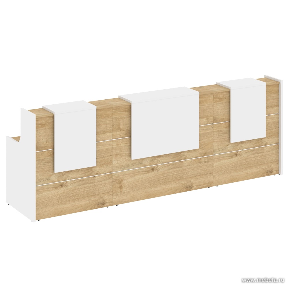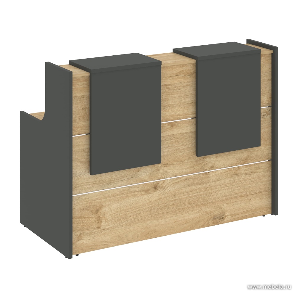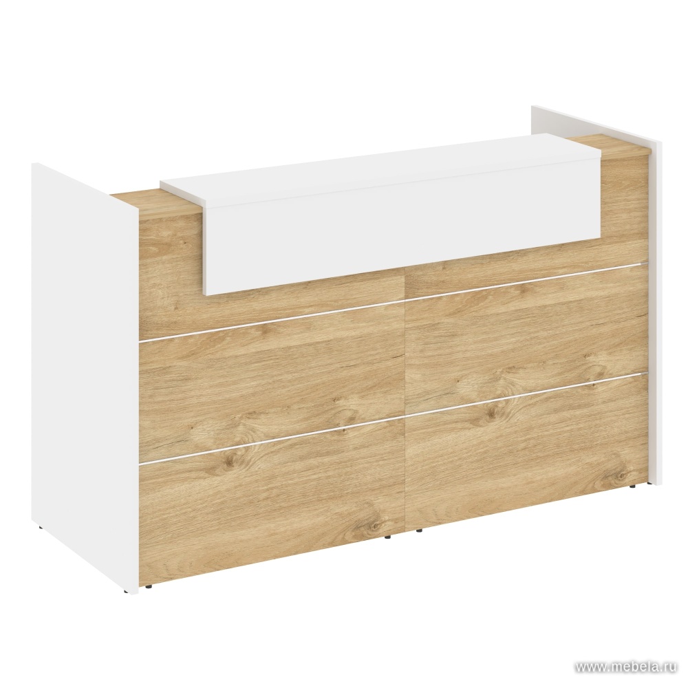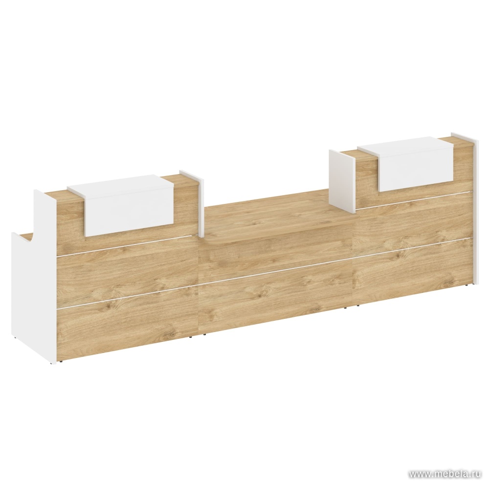 Ресепшн Onix в цвете тиквуд выполнена в эргономичном и современном стиле. Оригинальные геометрические модули и возможность объединения нескольких контрастных декоров придают стойке визуальную легкость и стиль. Модные цвета древесного декорирования в сочетании с белым цветом опор столешницы и топа освежают интерьер. ...