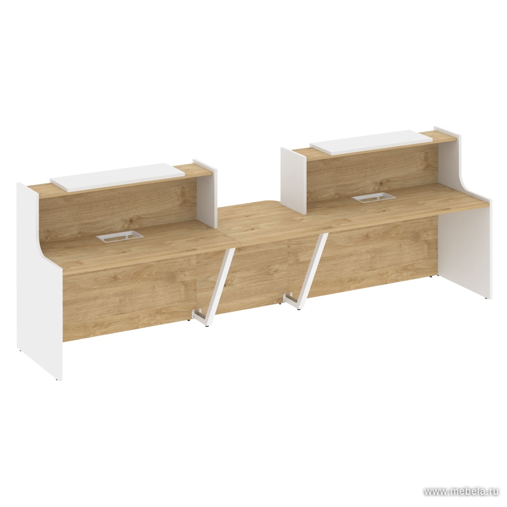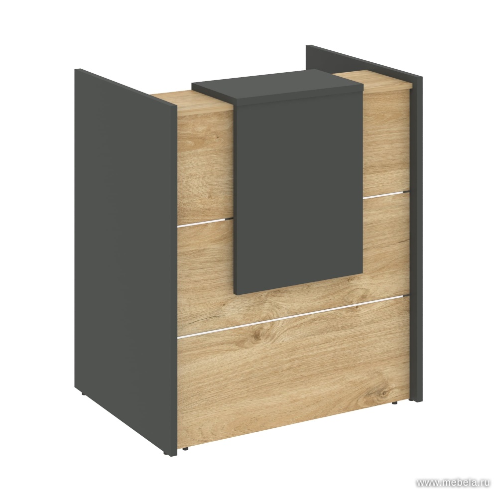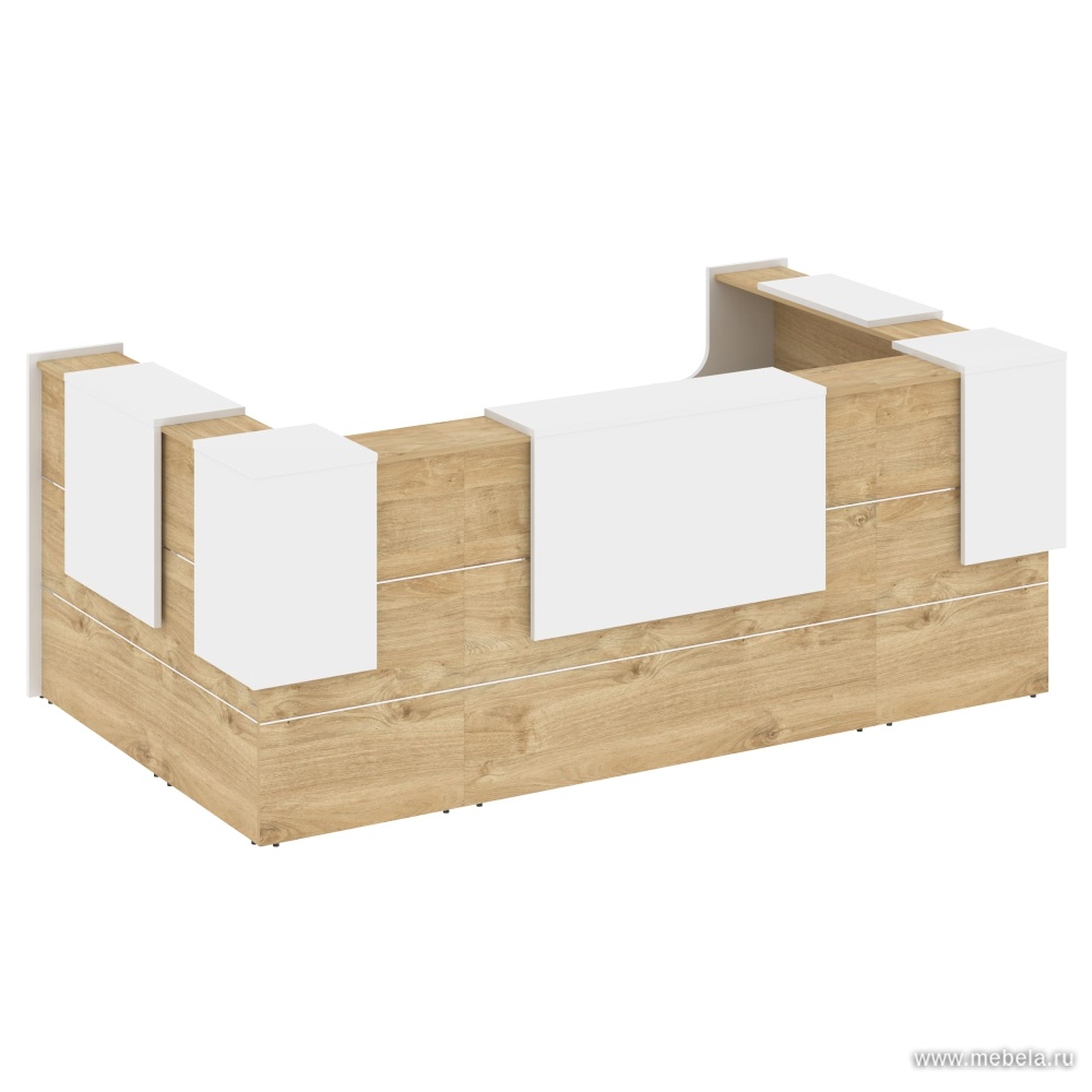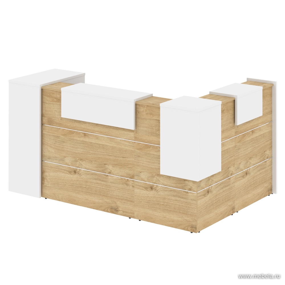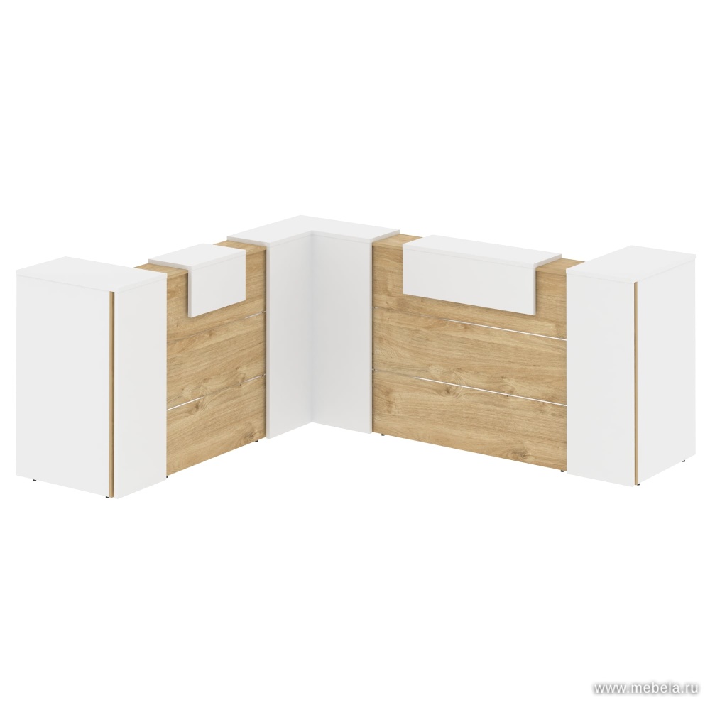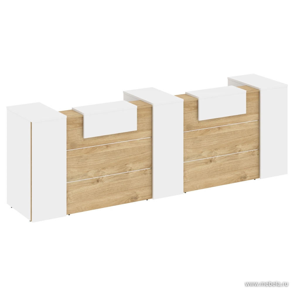Ресепшн Onix в цвете тиквуд выполнена в эргономичном и современном стиле. Оригинальные геометрические модули и возможность объединения нескольких контрастных декоров придают стойке визуальную легкость и стиль. Модные цвета древесного декорирования в сочетании с белым цветом опор столешницы и топа освежают интерьер. ...
