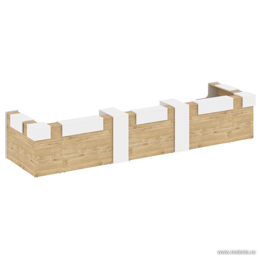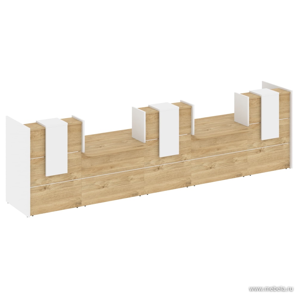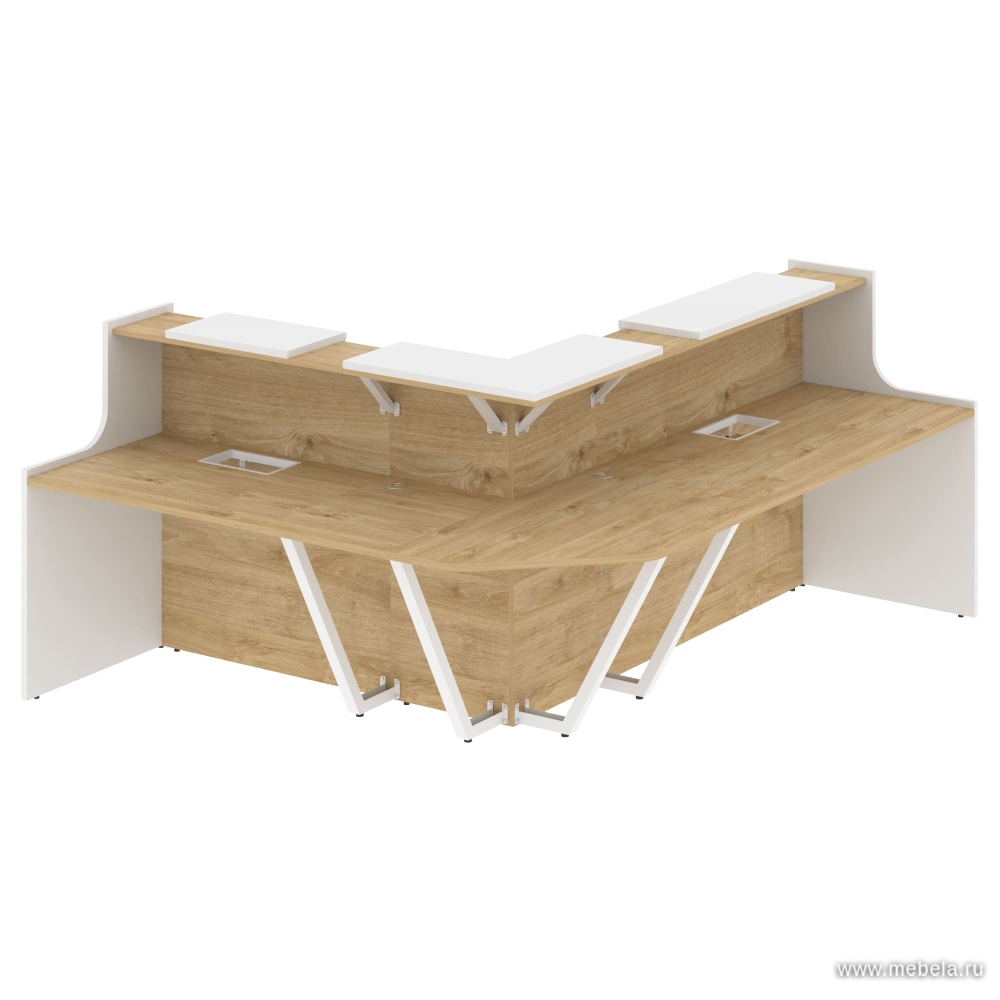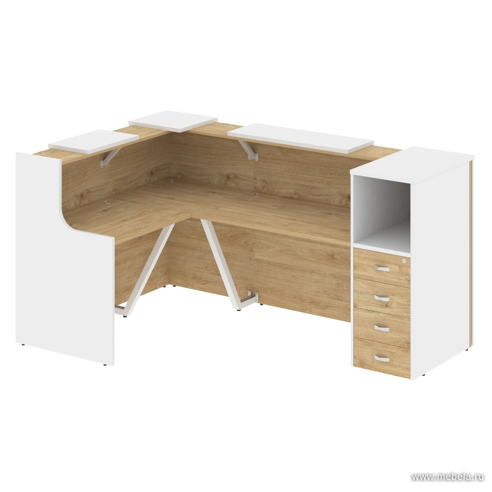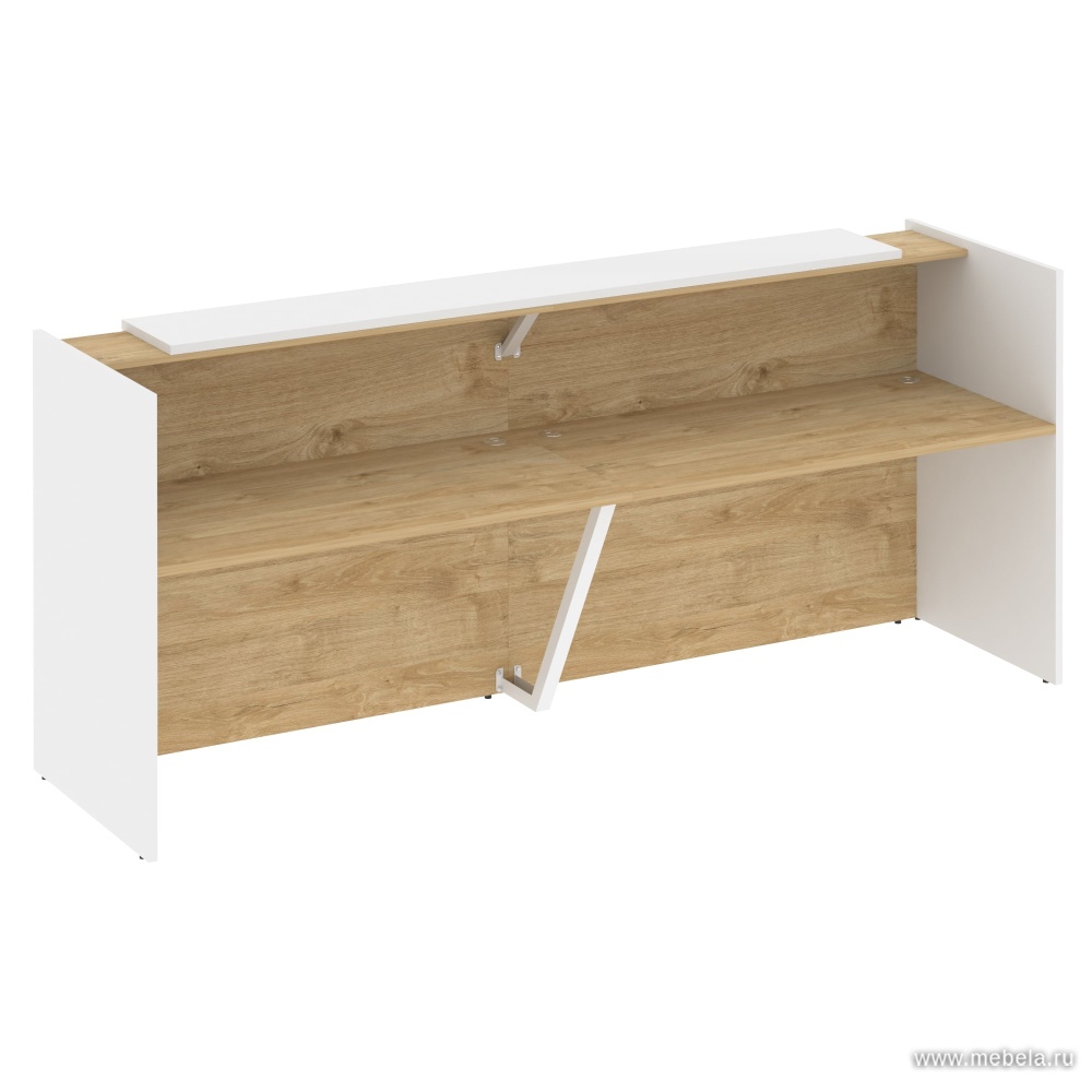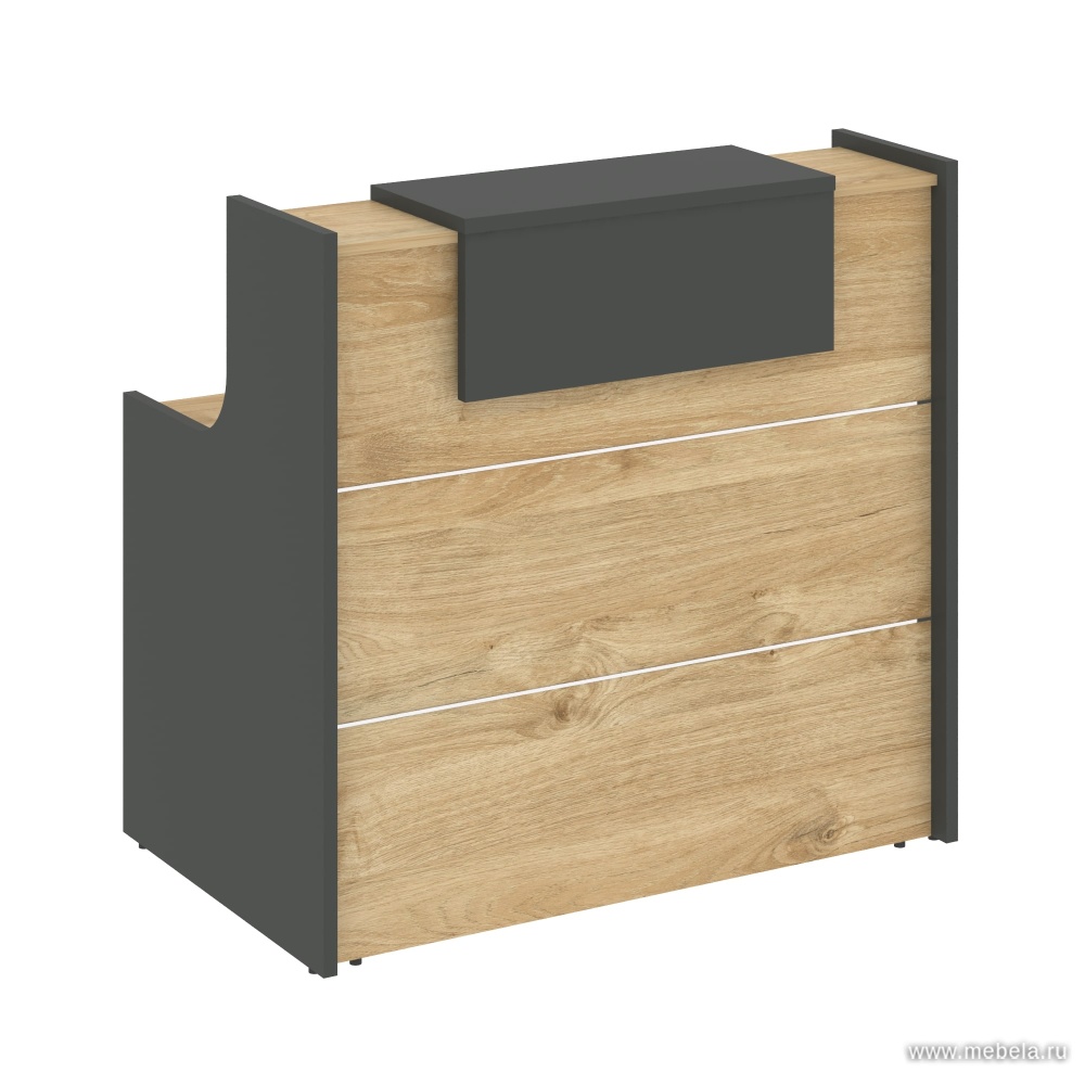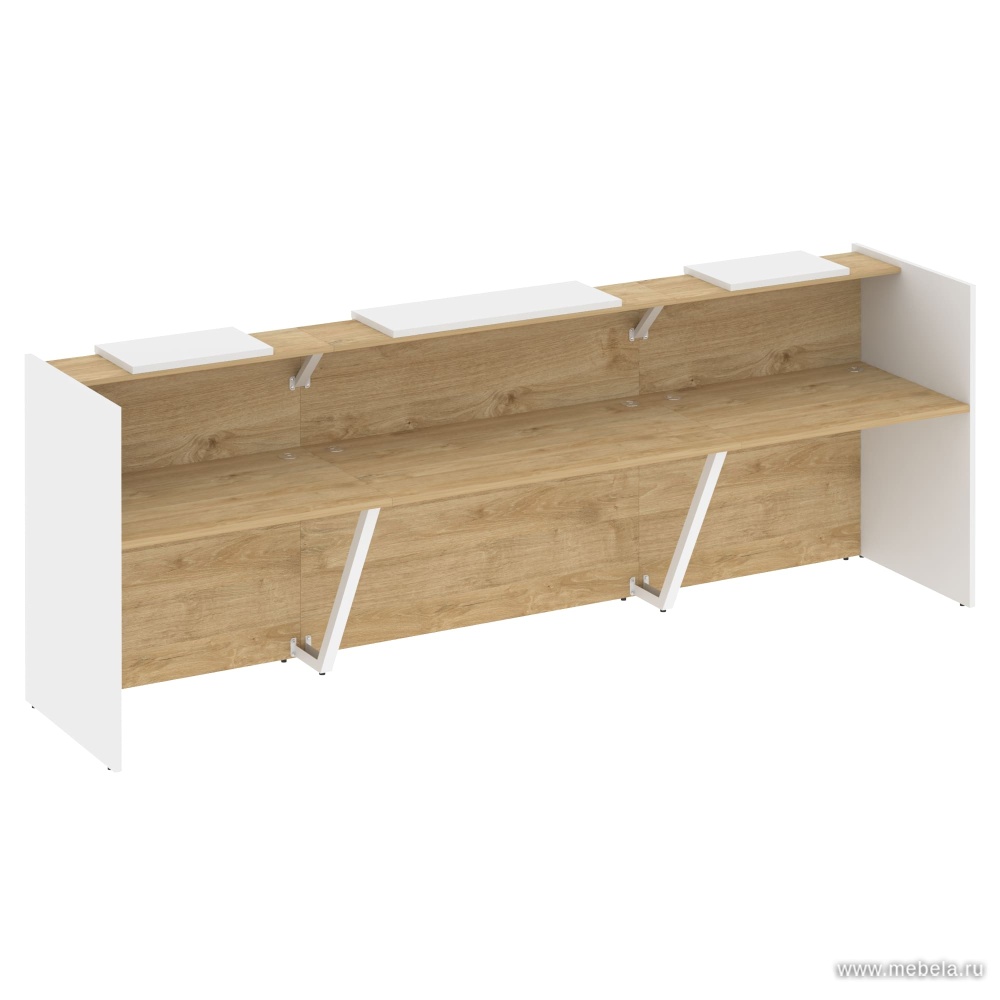 Ресепшн Onix в цвете тиквуд выполнена в эргономичном и современном стиле. Оригинальные геометрические модули и возможность объединения нескольких контрастных декоров придают стойке визуальную легкость и стиль. Модные цвета древесного декорирования в сочетании с белым цветом опор столешницы и топа освежают интерьер. ...