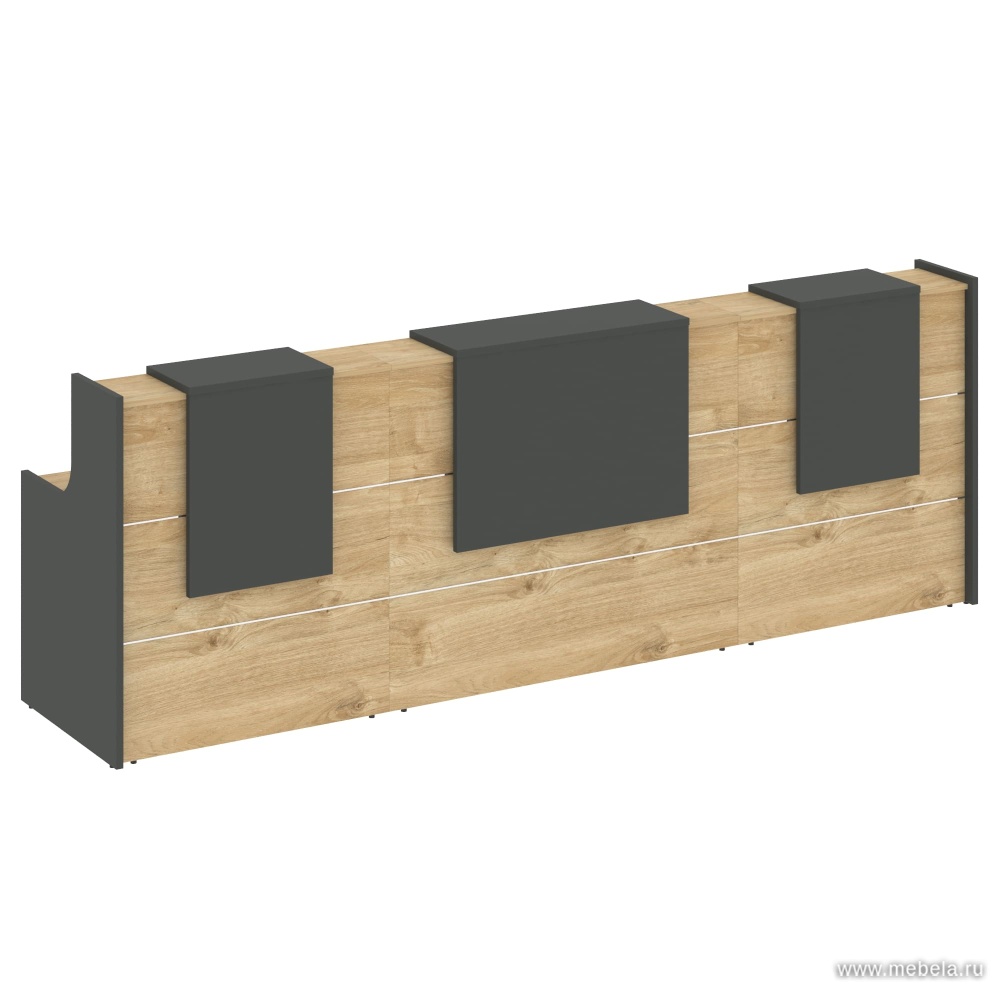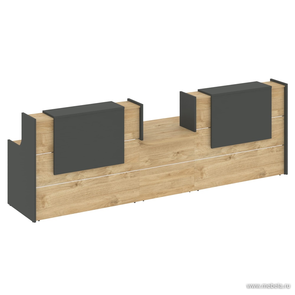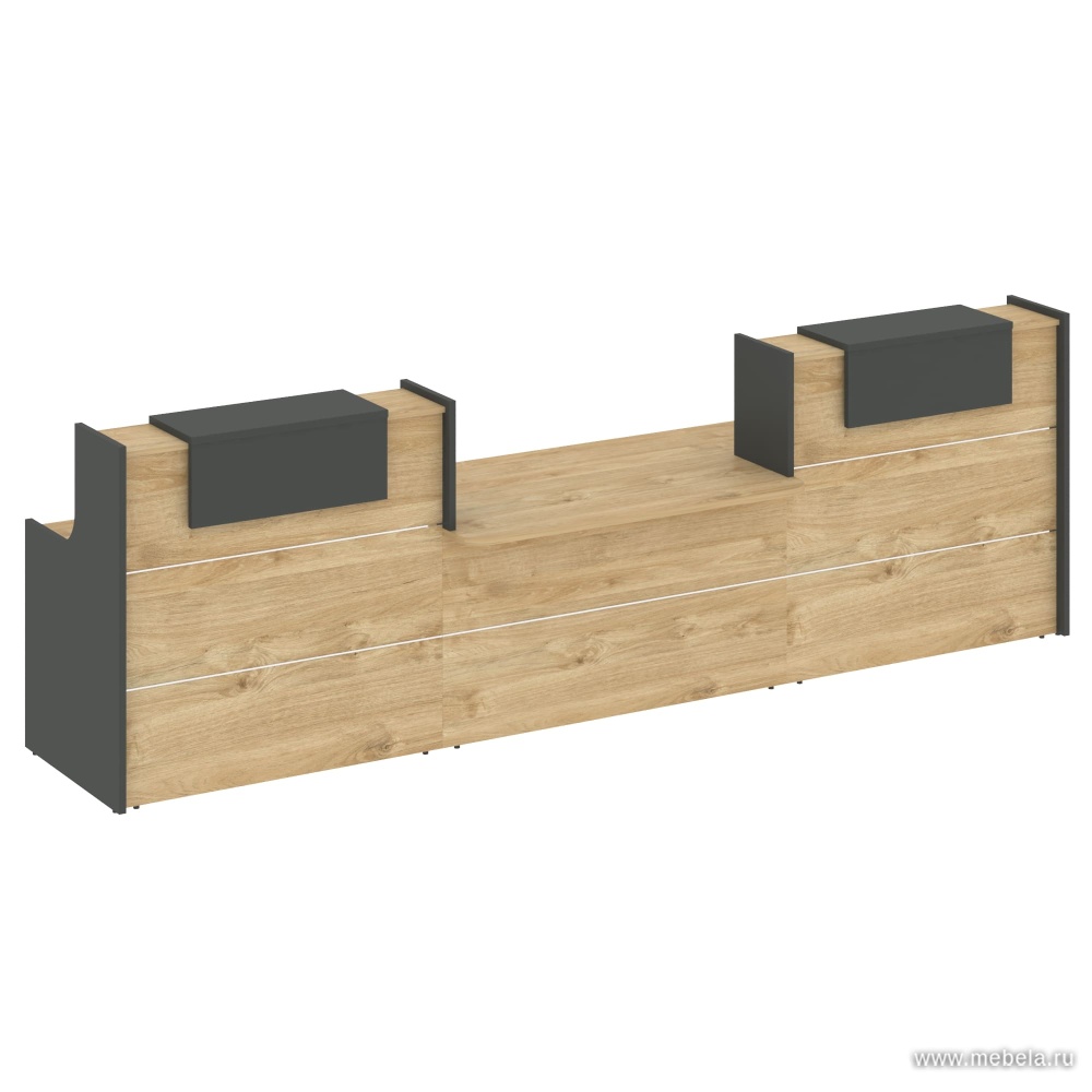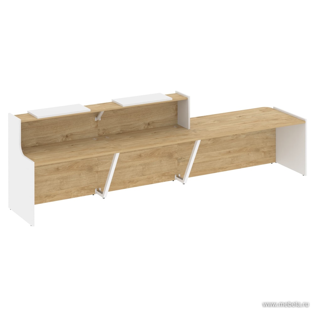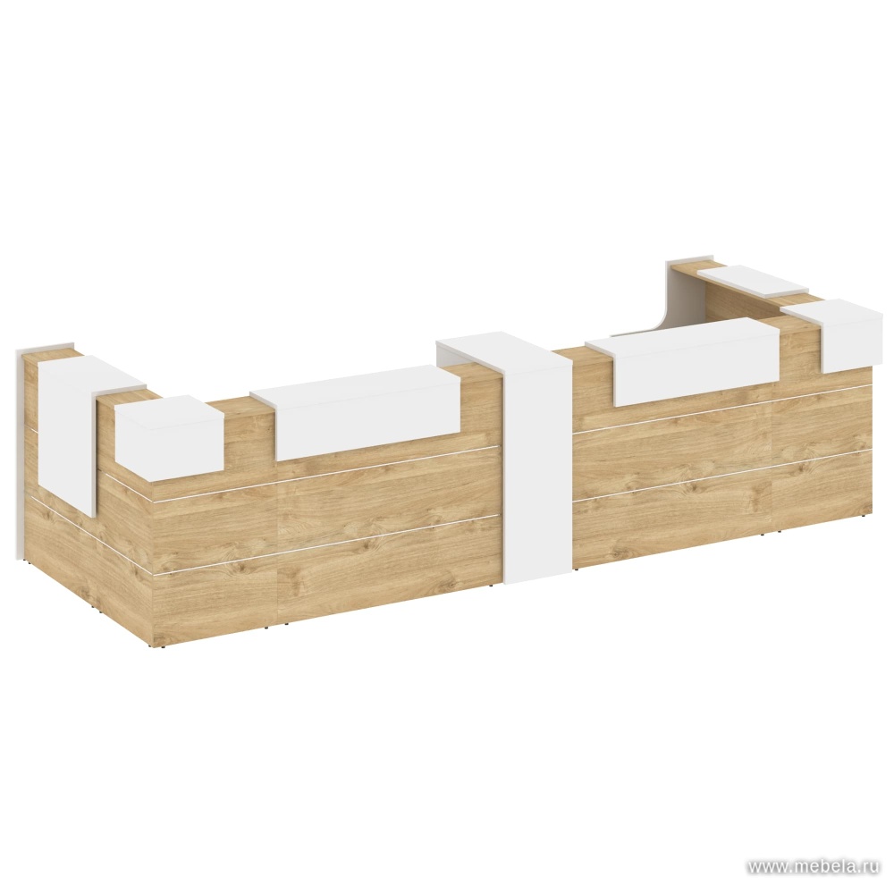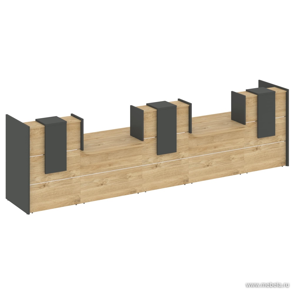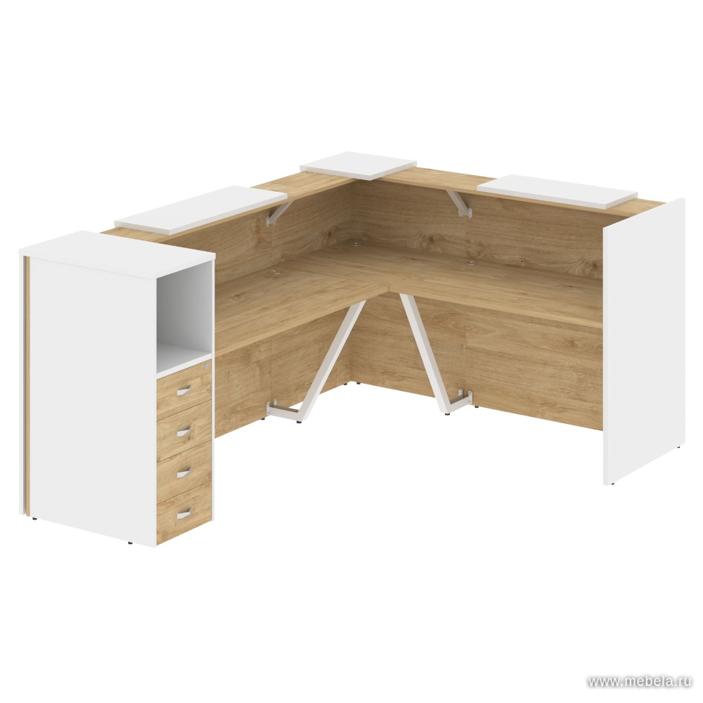 Ресепшн Onix в цвете тиквуд выполнена в эргономичном и современном стиле. Оригинальные геометрические модули и возможность объединения нескольких контрастных декоров придают стойке визуальную легкость и стиль. Модные цвета древесного декорирования в сочетании с белым цветом опор столешницы и топа освежают интерьер. ...