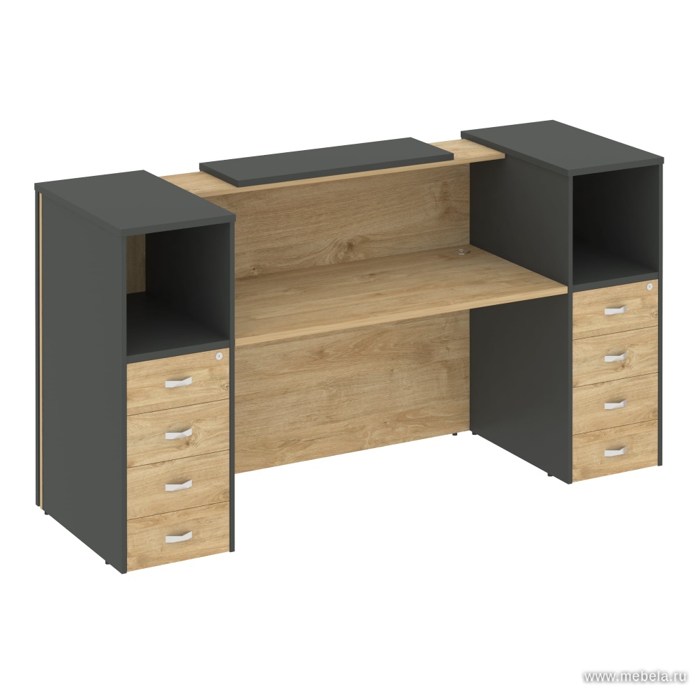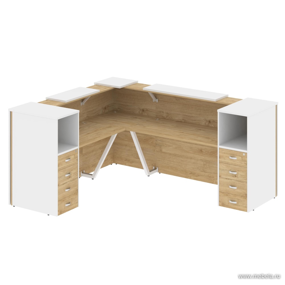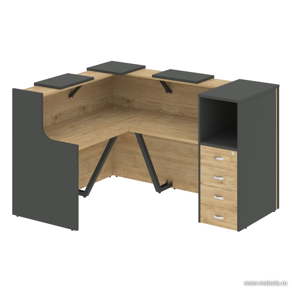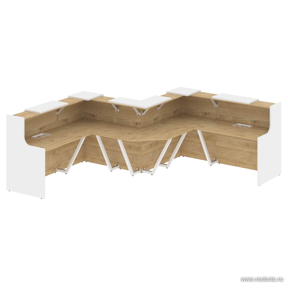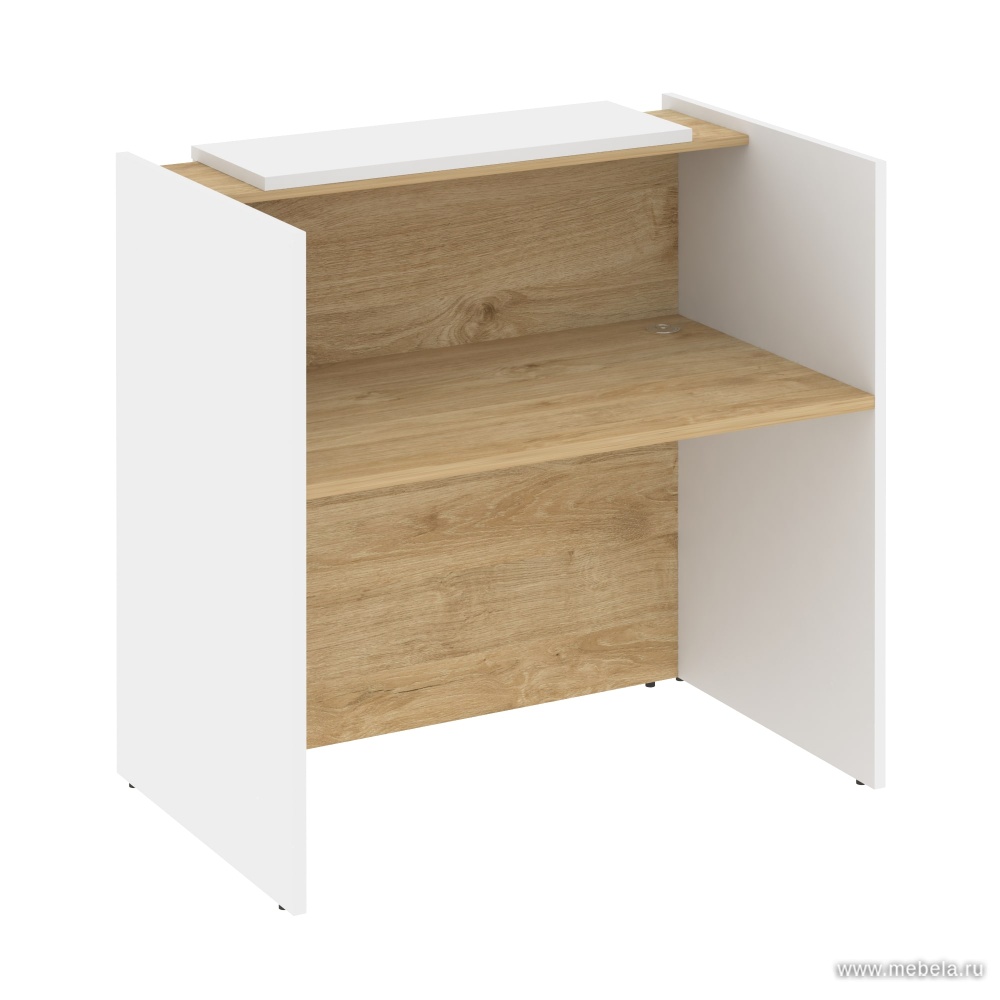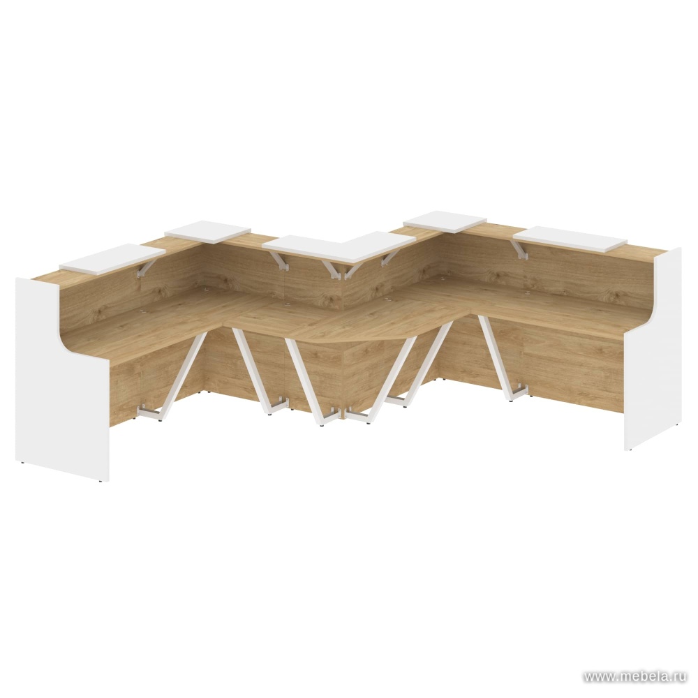 Ресепшн Onix в цвете тиквуд выполнена в эргономичном и современном стиле. Оригинальные геометрические модули и возможность объединения нескольких контрастных декоров придают стойке визуальную легкость и стиль. Модные цвета древесного декорирования в сочетании с белым цветом опор столешницы и топа освежают интерьер. ...