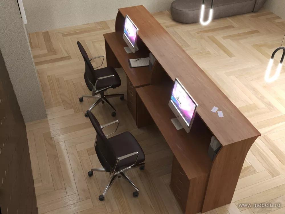 Оборудовать свой офис в классическом стиле по демократичной цене стало возможно благодаря стойке ресепшн RIVA в цвете Орех. Строгие формы с минимумом декора из ламинированных под цвет благородной древесины панелей ДСП сформируют строгий эффектный образ и обеспечат максимальный комфорт.
