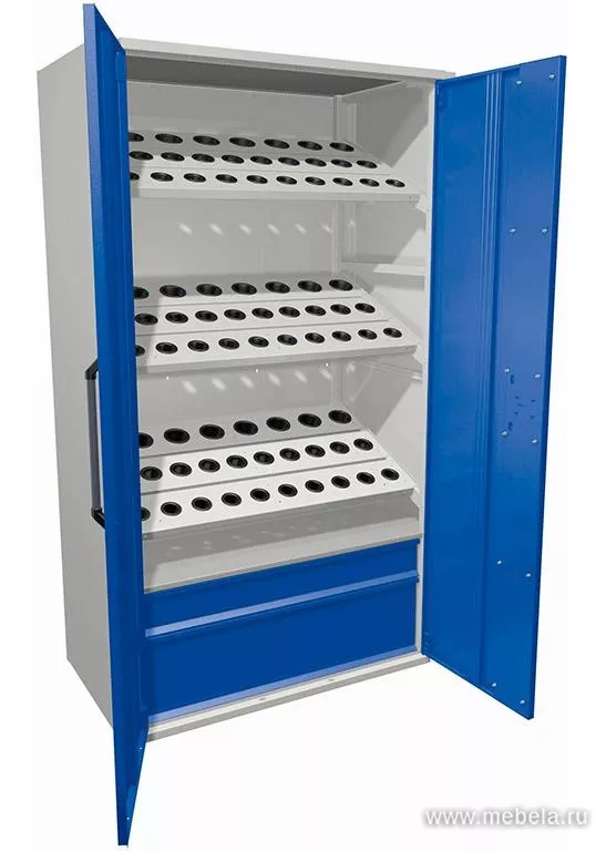 Вместительный инструментальный шкаф с круглыми держателями. В высоту занимает почти два метра, а в ширину — чуть больше одного метра. Подойдет практически для любого производственного помещения: завода, цеха, мебельной мастерской или автосервиса.
