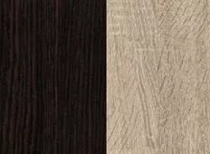 Сбоку есть специальный отсек для прессы и журналов. Модель представлена в двух вариантах: однотонном венге и двухцветном – венге и контрастном сонома. Опоры в виде широких деревянных досок, сложенные квадратом, придают модели оригинальность. Такой