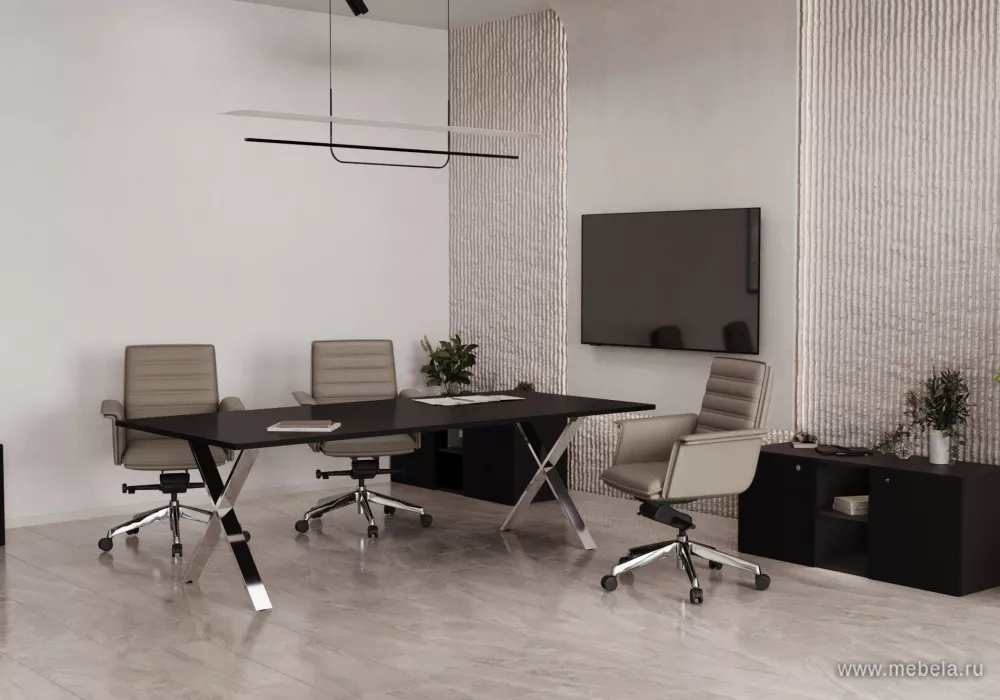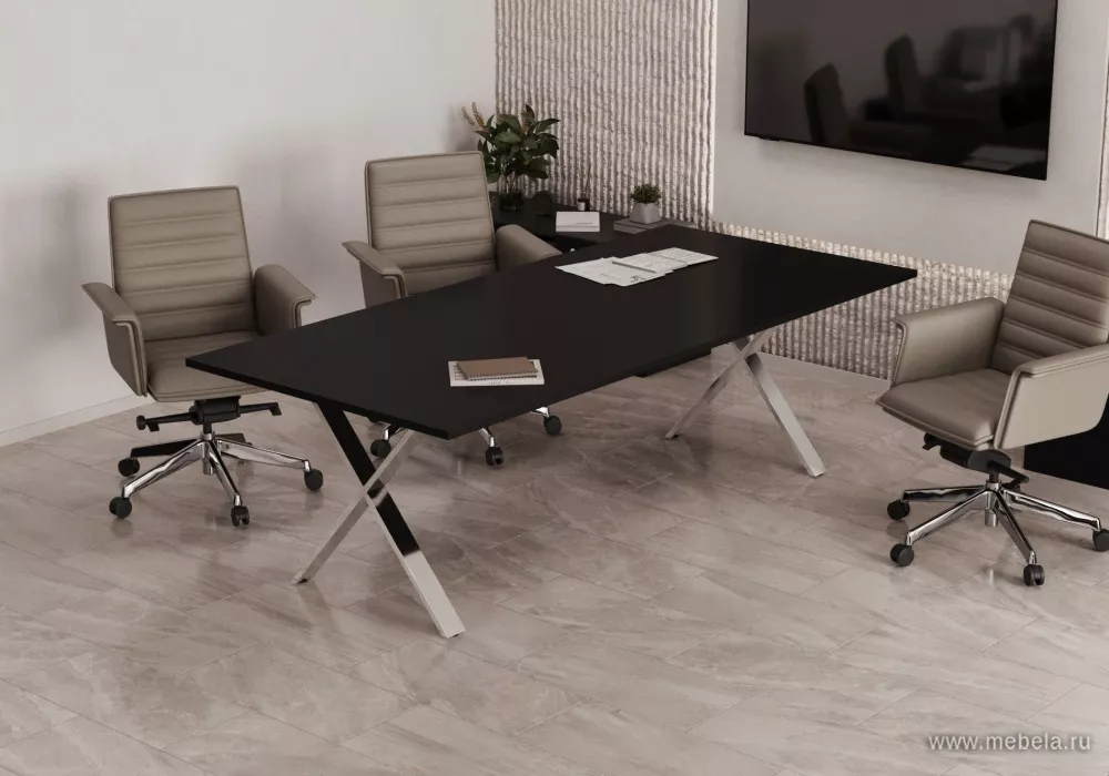 Столы для переговоров Cross в цвете чёрный бальзат - это высококачественные столы, произведенные в России. Они предназначены для использования в переговорных комнатах и офисных пространствах.