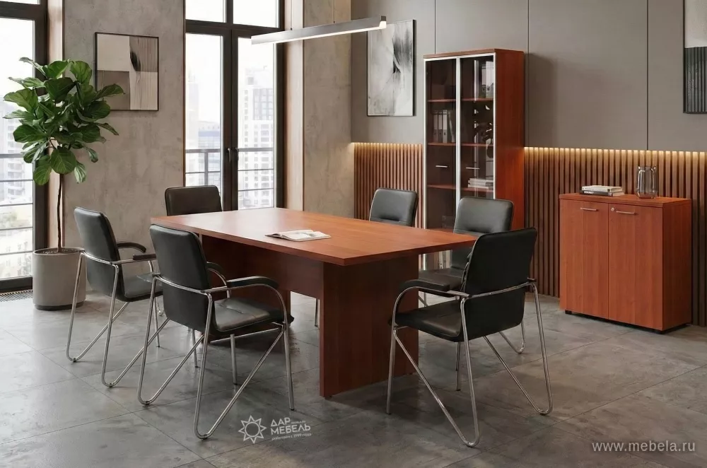 Простые уверенные формы столов для переговоров “Патриот” создадут в офисе серьезный настрой и помогут организовать пространство для рабочих совещаний. Богатство форм столов самых разных радиусов позволяет создать более или менее агрессивный стиль интерьера. Плита столешниц в 32мм и ее цвет под редкие породы дерева добавляет...