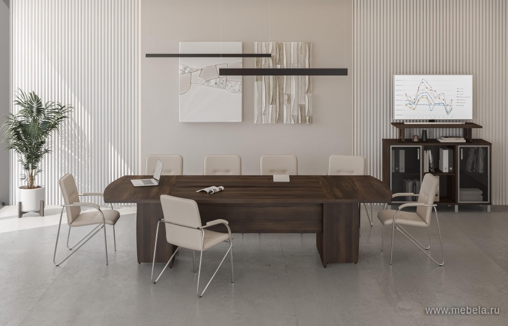 Построить кабинет для ведения напряженных деловых контактов перестало быть проблемой благодаря столам для переговоров “Борн”. Любая конфигурация кабинета стала возможной, а число участников диалога не имеет значения. В комплекте этой офисной мебели есть элементы для построения любой конструкции.