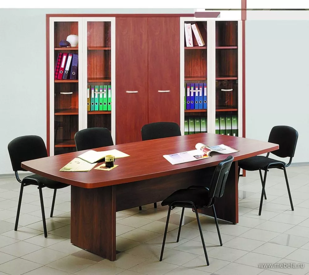 Доступная роскошь – вот основная идея столов для переговоров “Танго Люкс” от белорусских производителей. Качество обработки ламинированного покрытия таково, что оно создает насыщенный матовый блеск натуральных цветов дерева и выглядит подобно массиву доски.